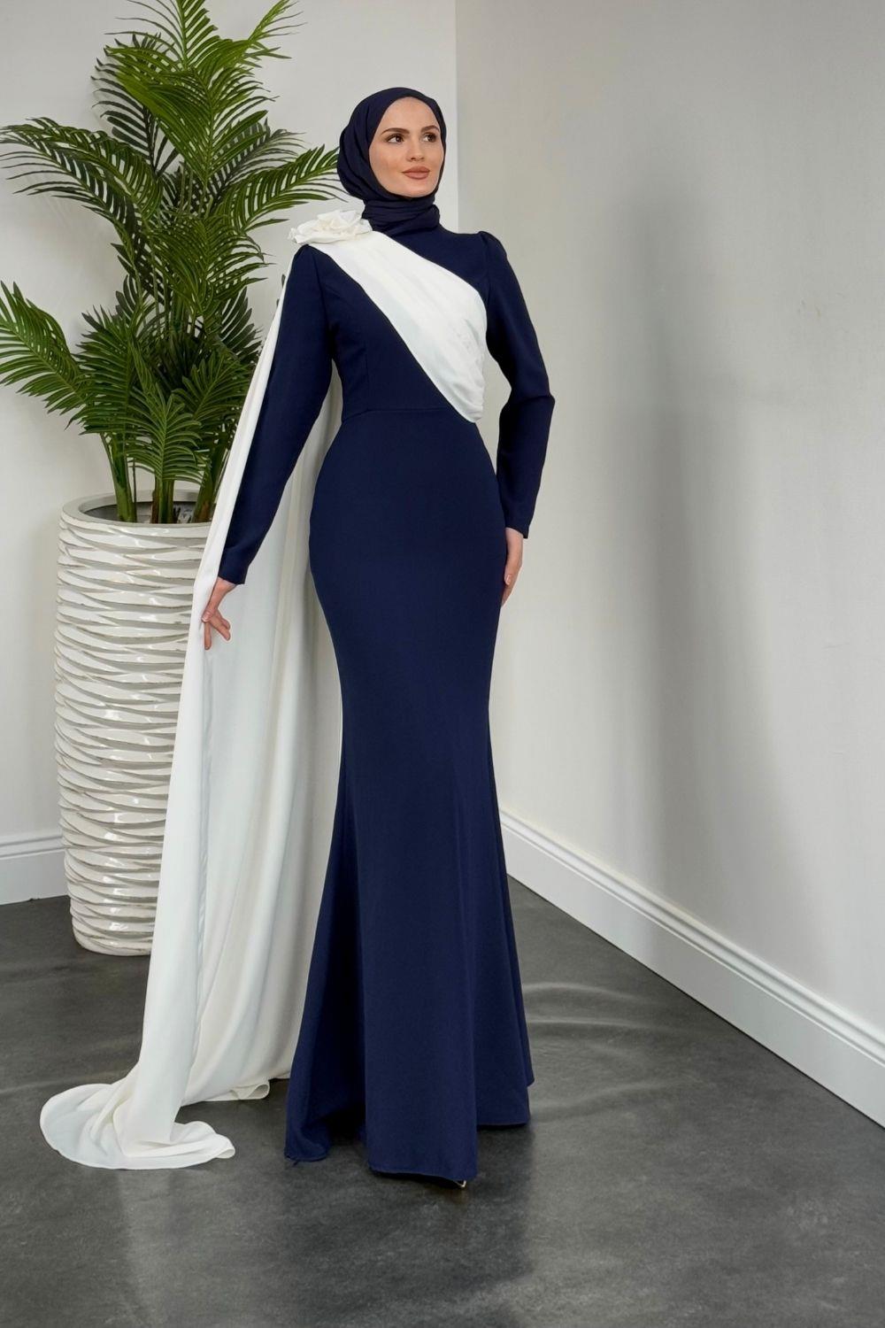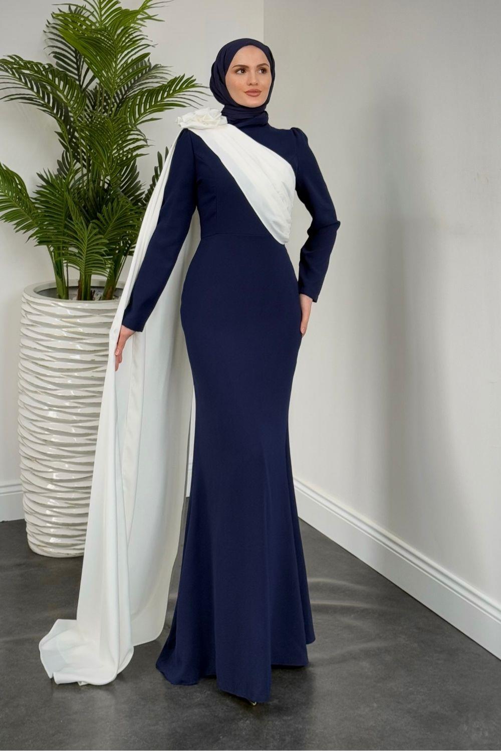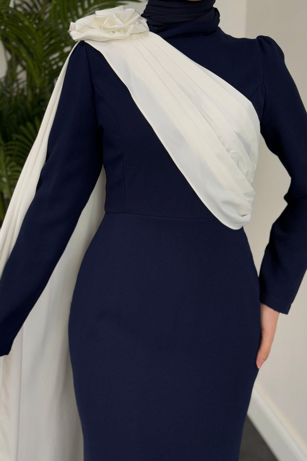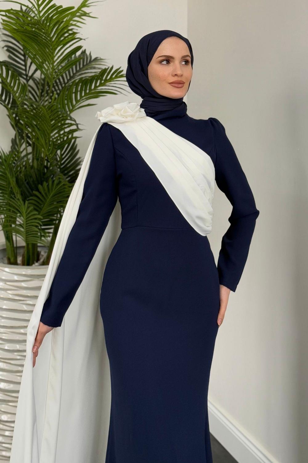 Castilya Pelerinli Omzu Gül Abiye Lacivert