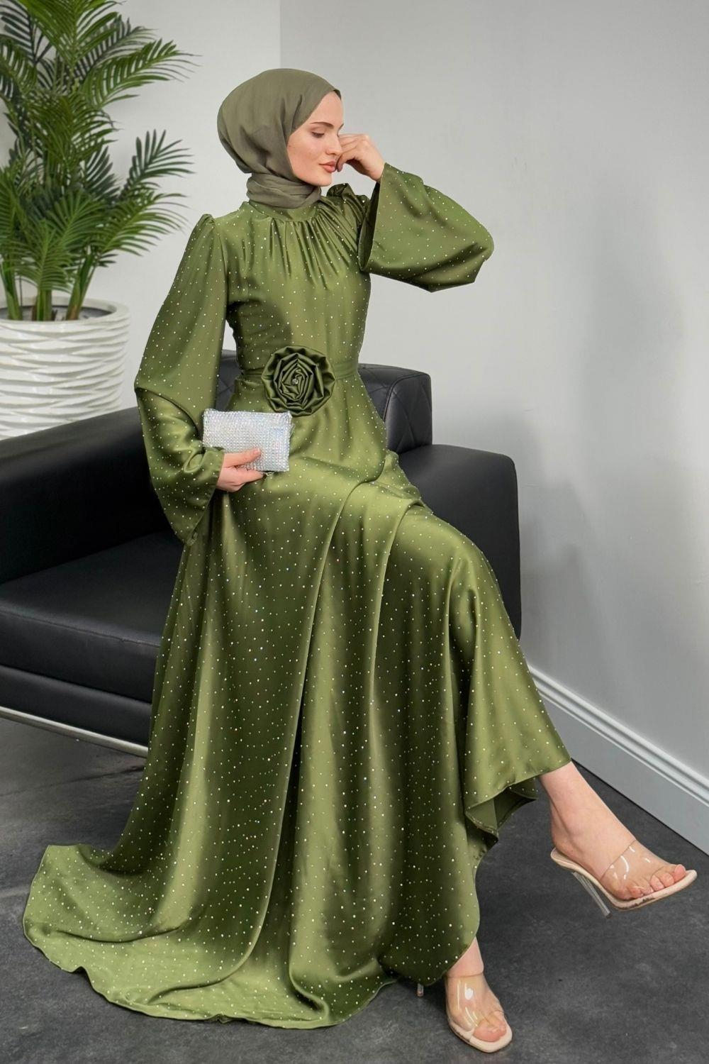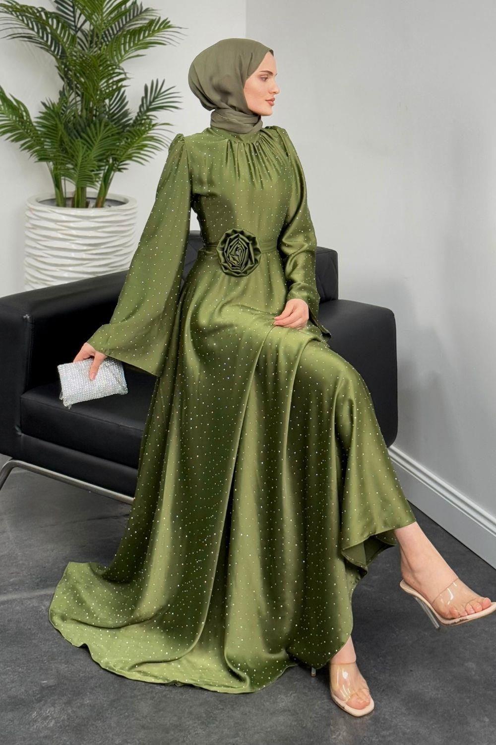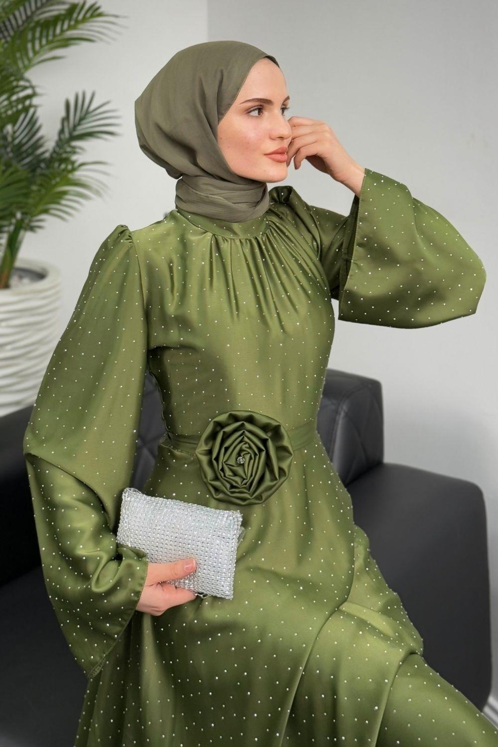 Branca Taşlı Gül Tokalı Abiye Haki