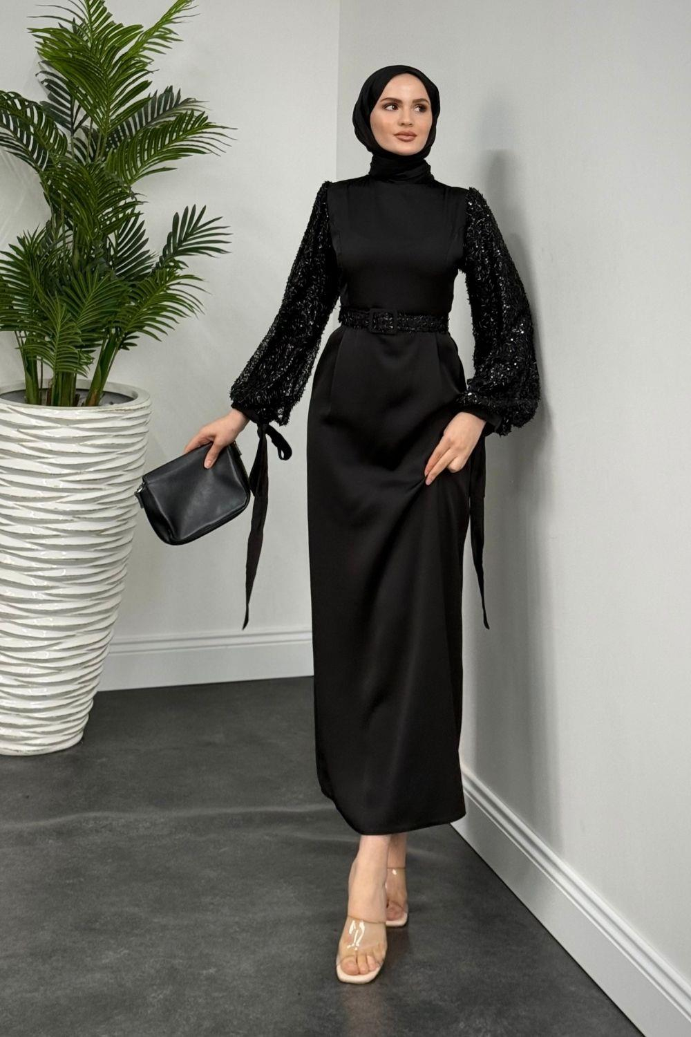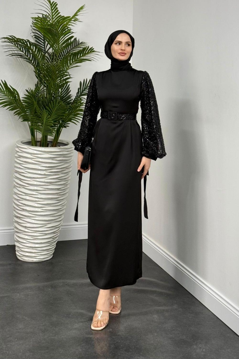 Şehla Kolları Boncuk İşleme Kemerli Abiye Siyah