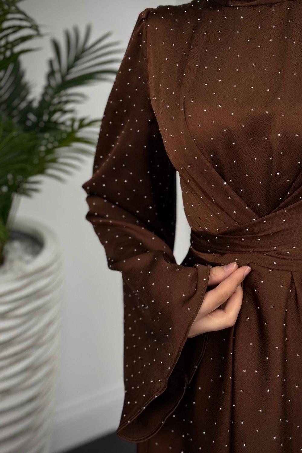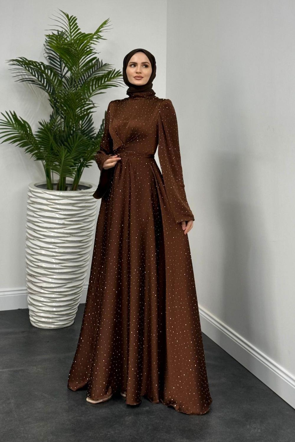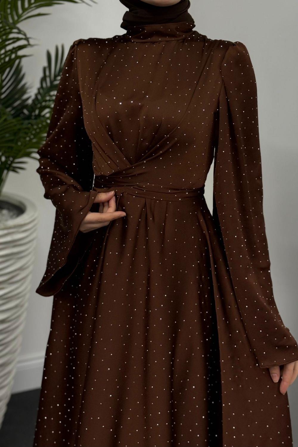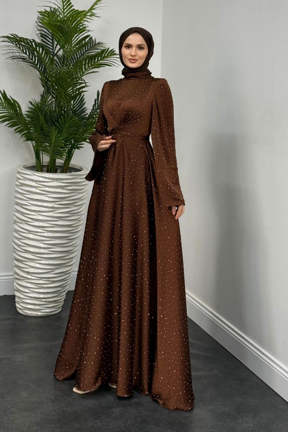 Yelzia Çapraz Taşlı Saten Abiye Kahverengi