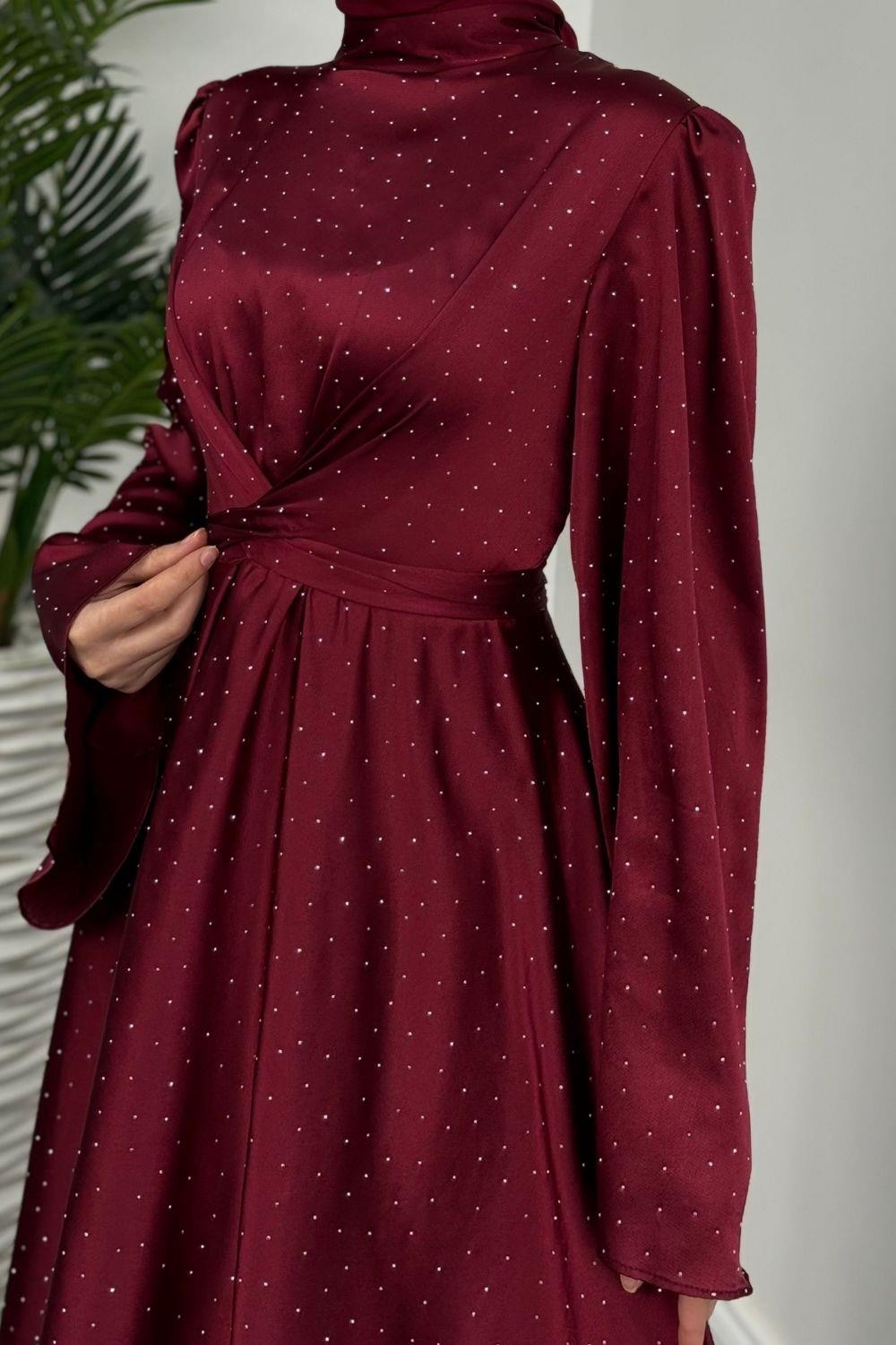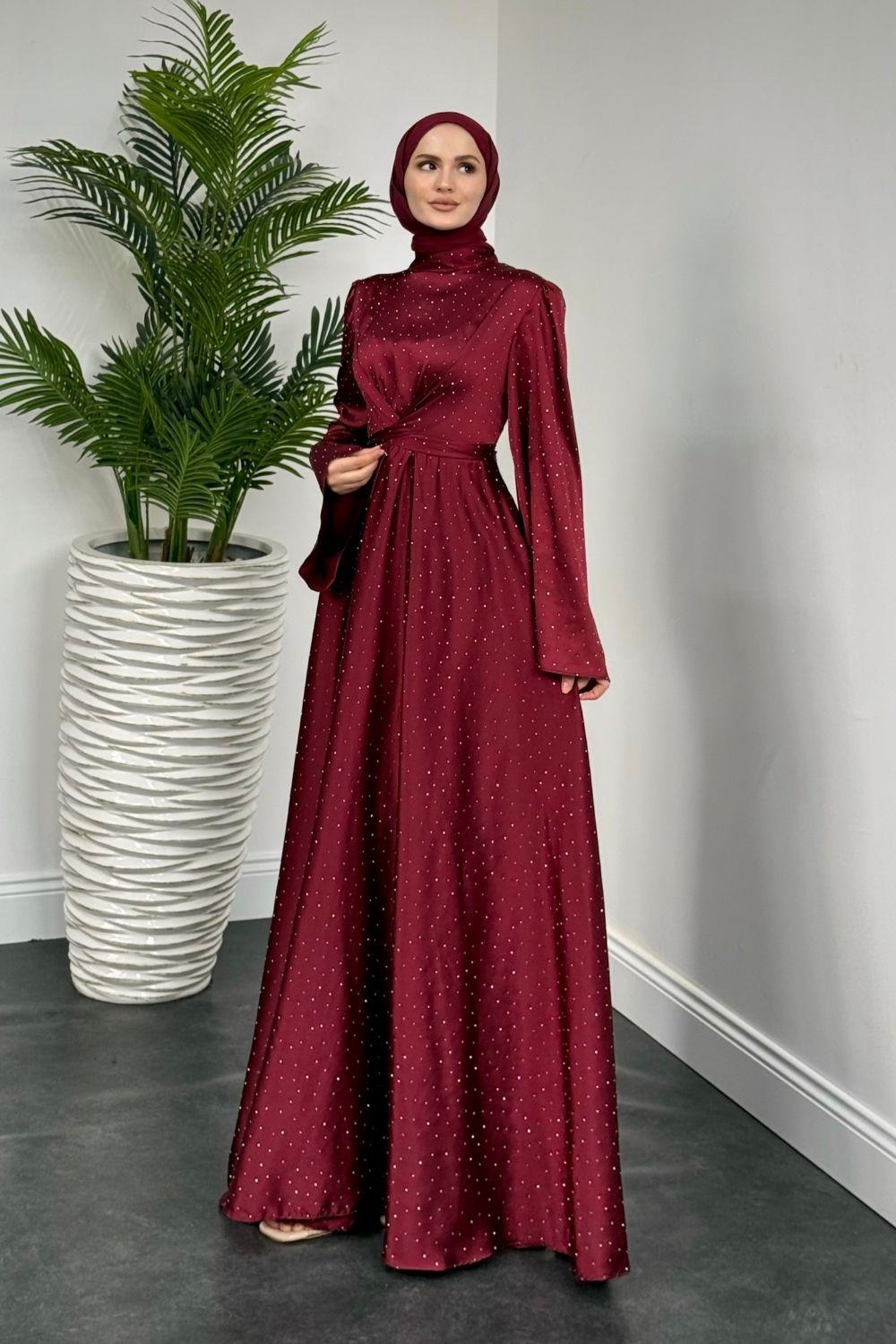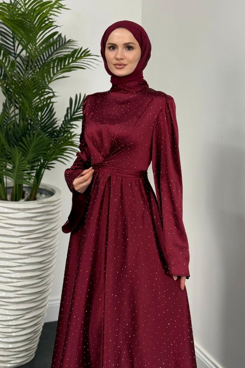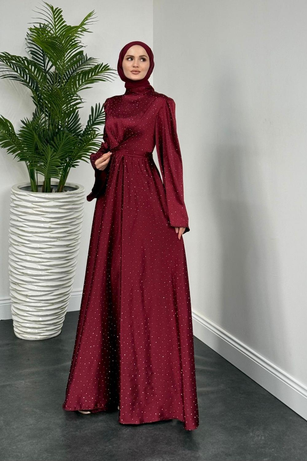 Yelzia Çapraz Taşlı Saten Abiye Bordo