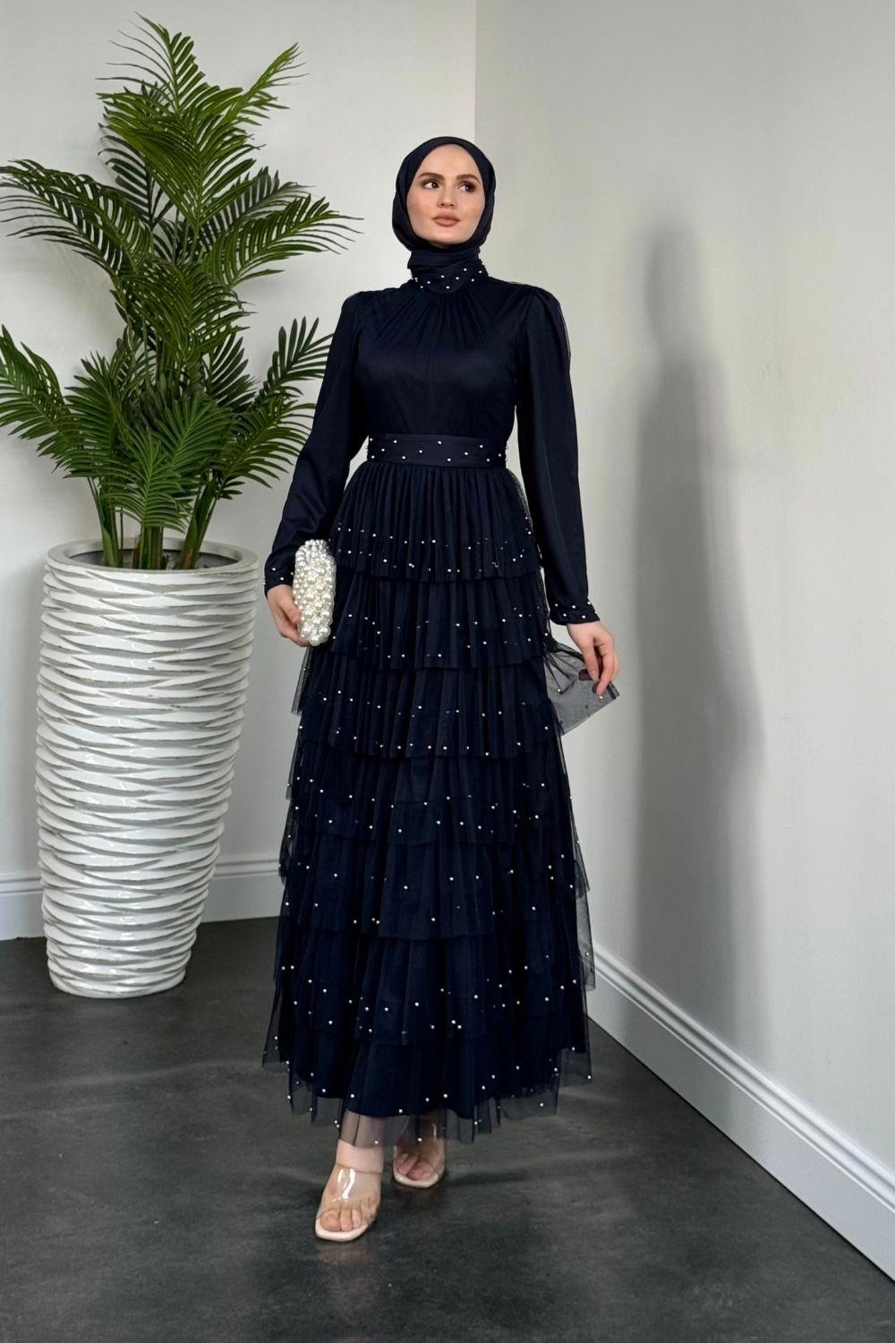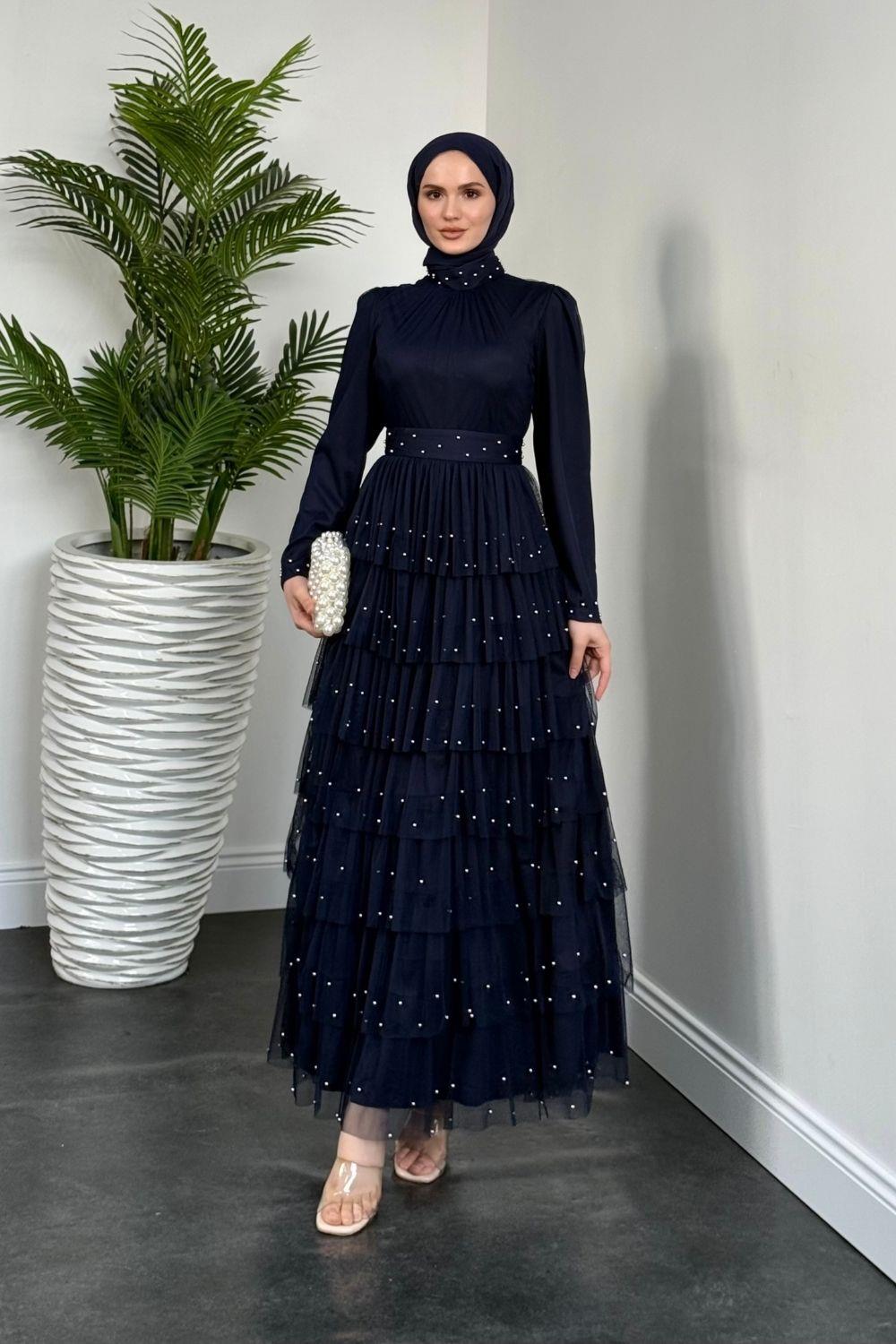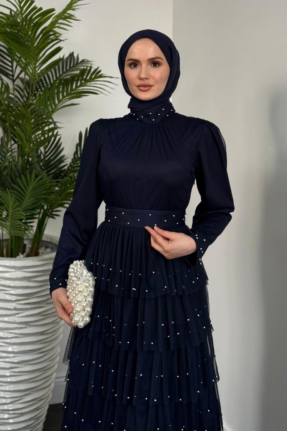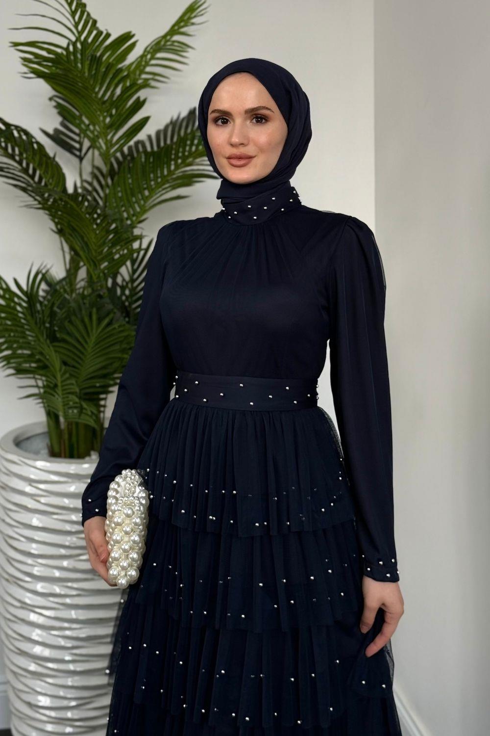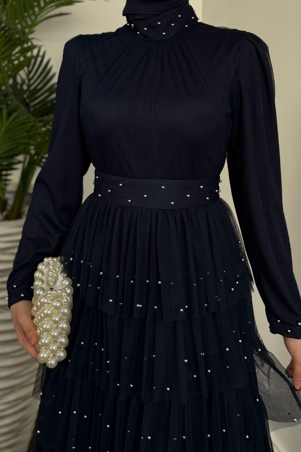 Mona Boncuklu Abiye Lacivert(KEMERSİZDİR)