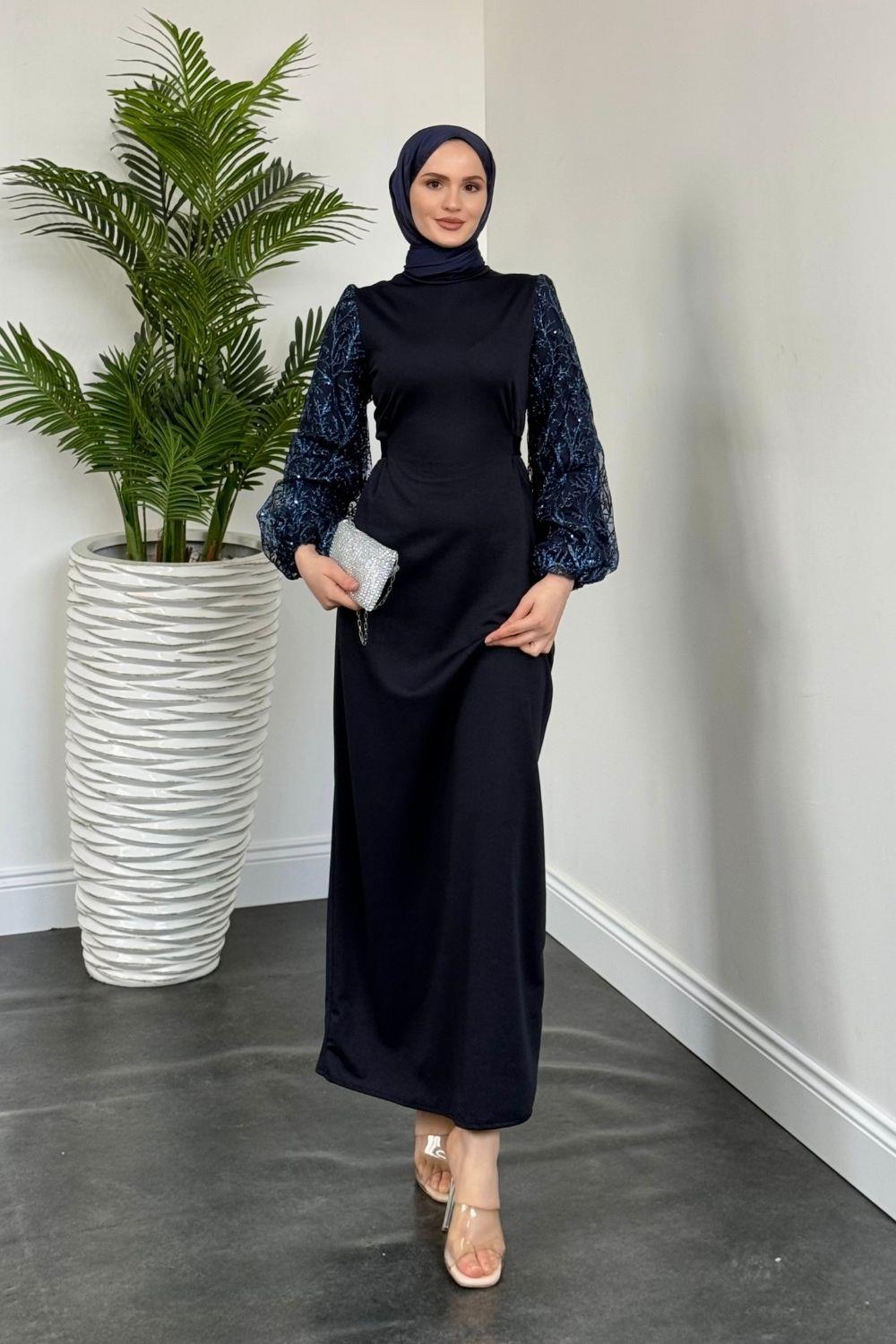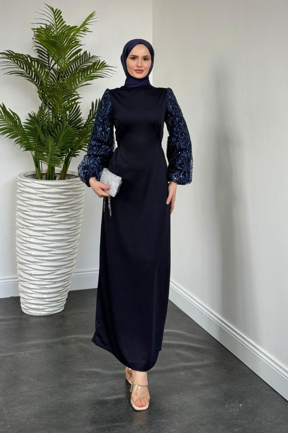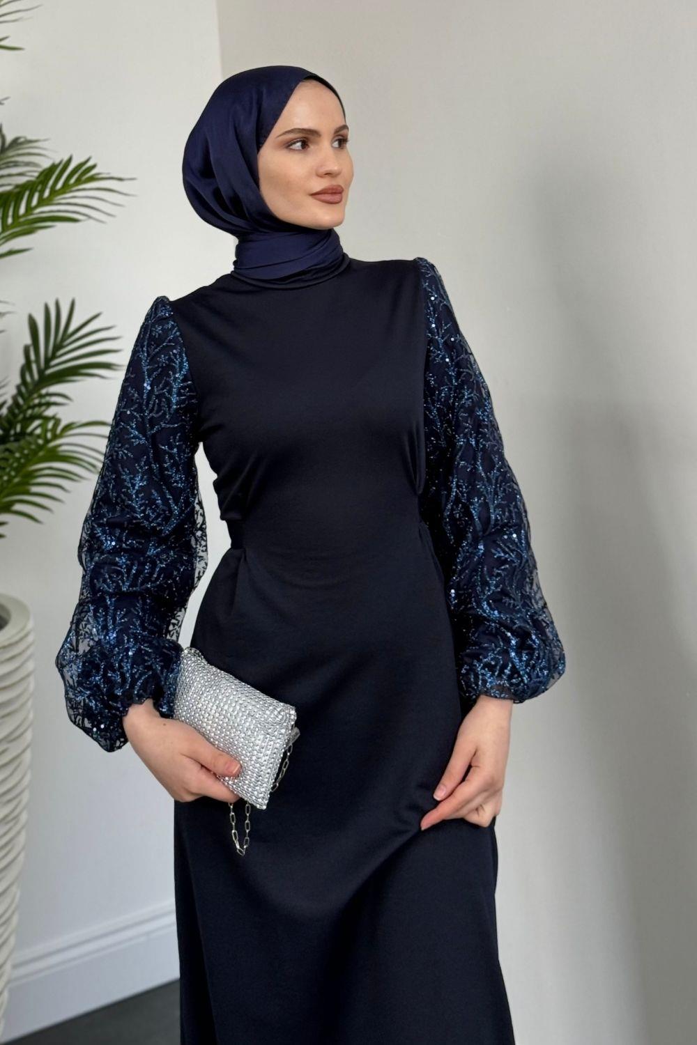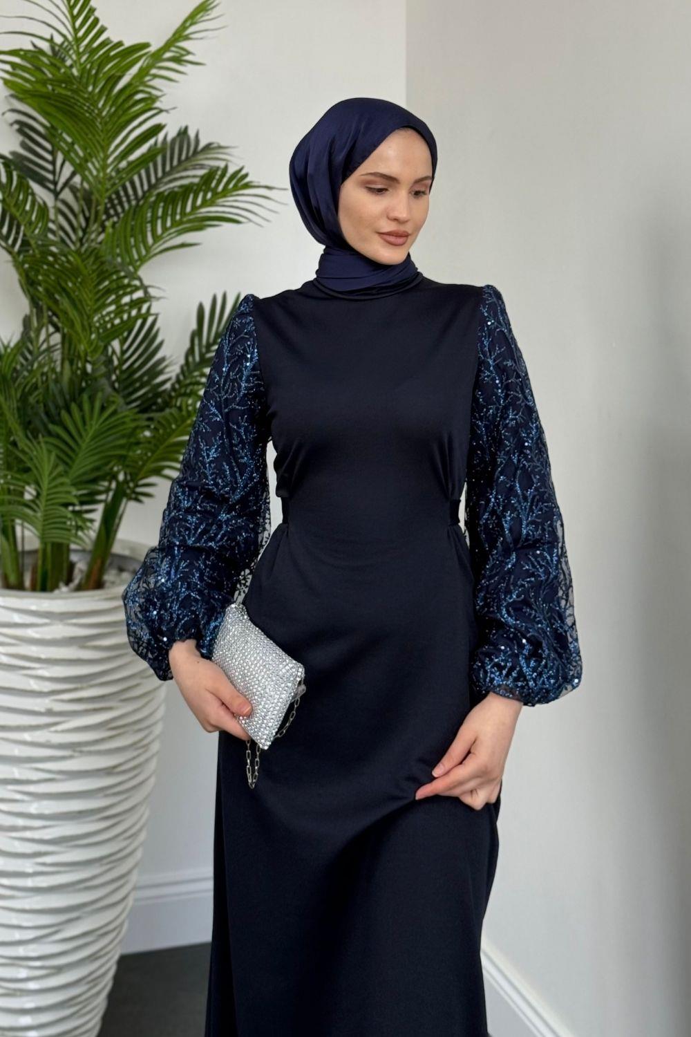Mogy Kolları Payet Krep Abiye Lacivert