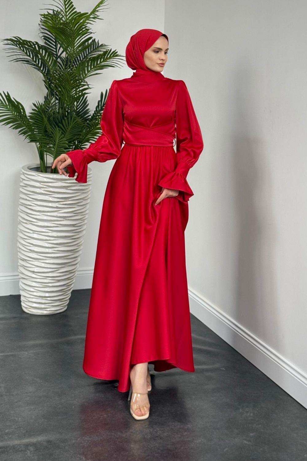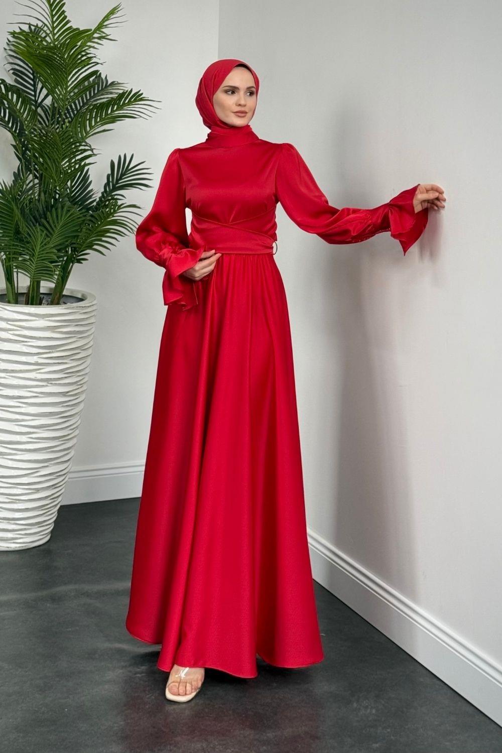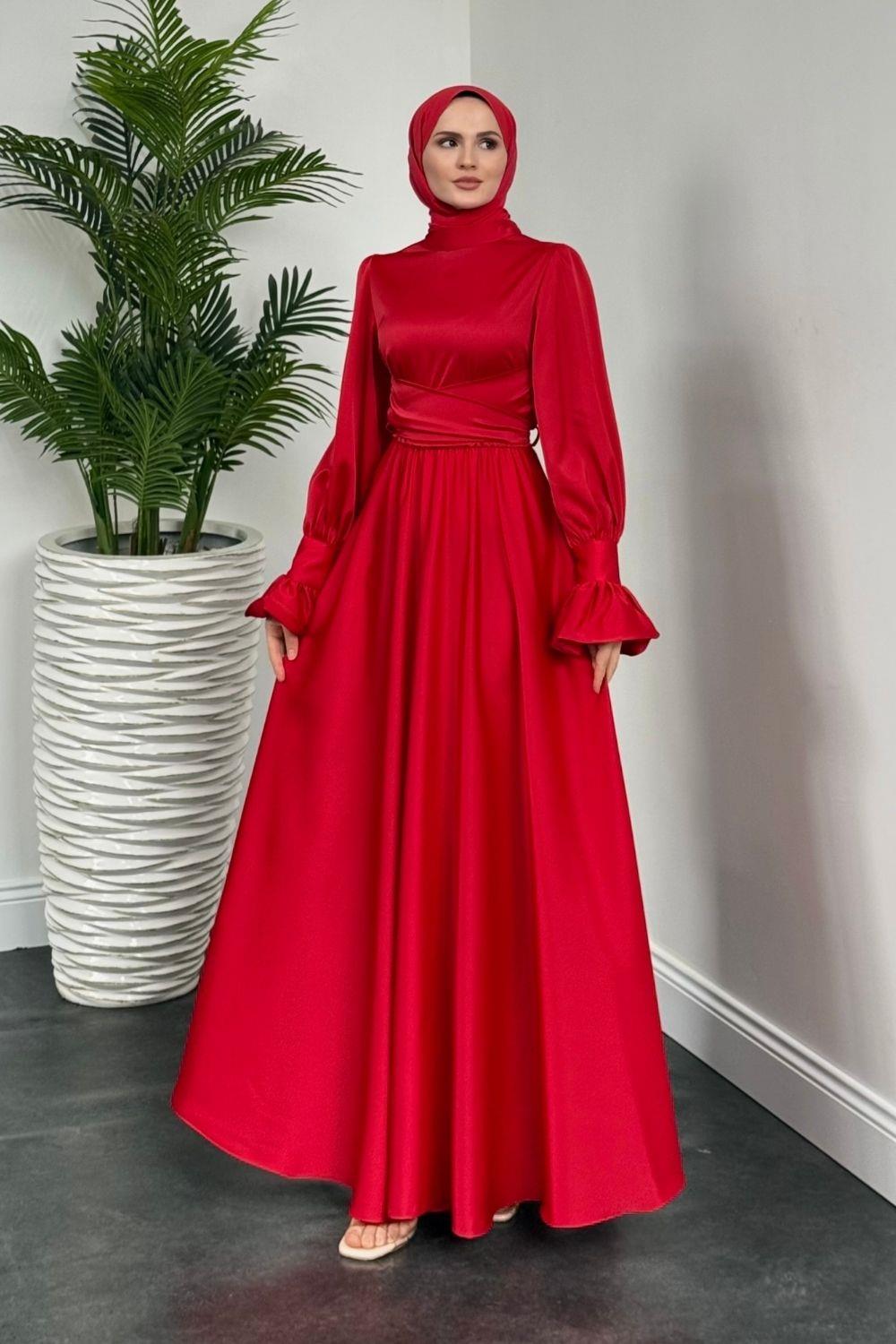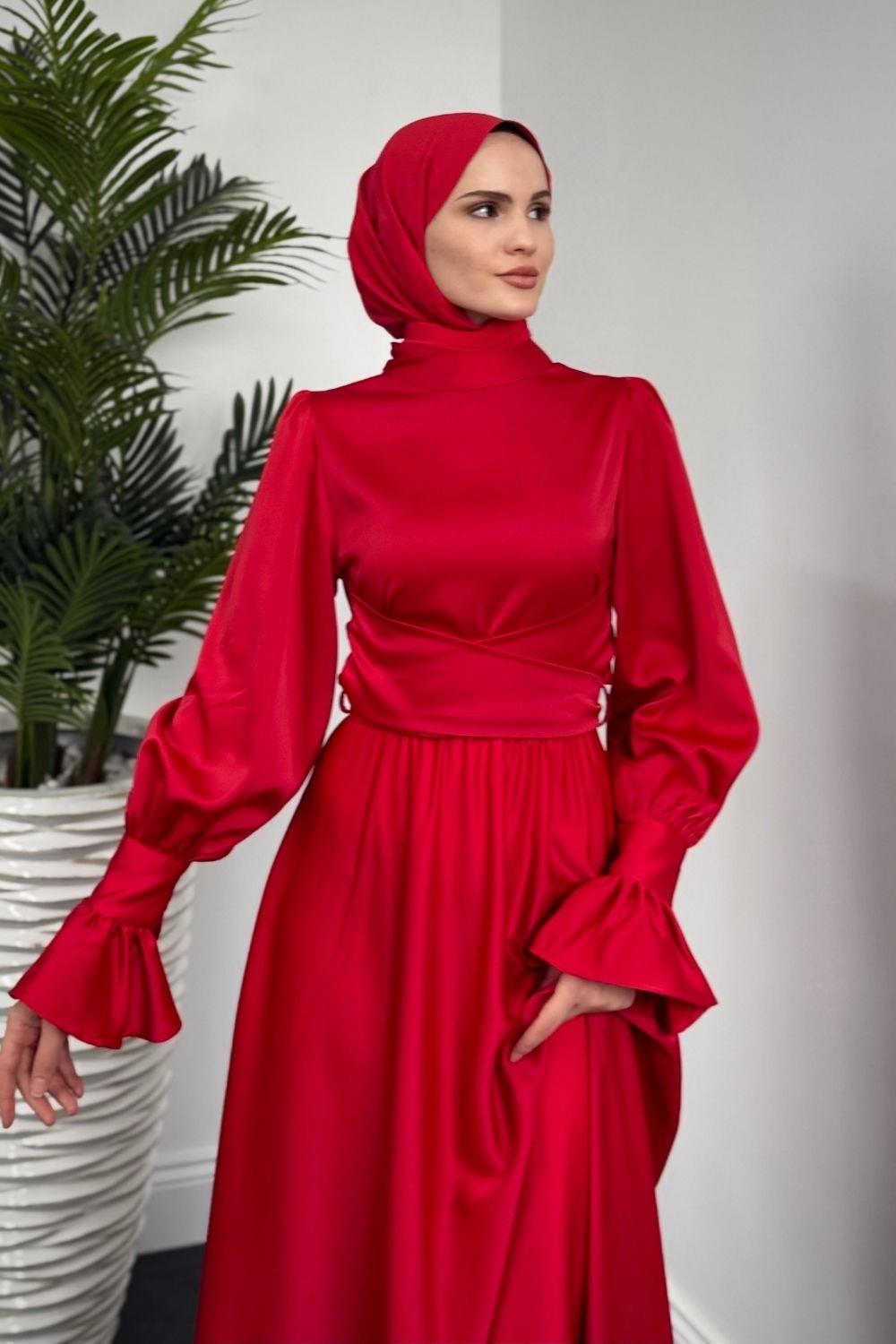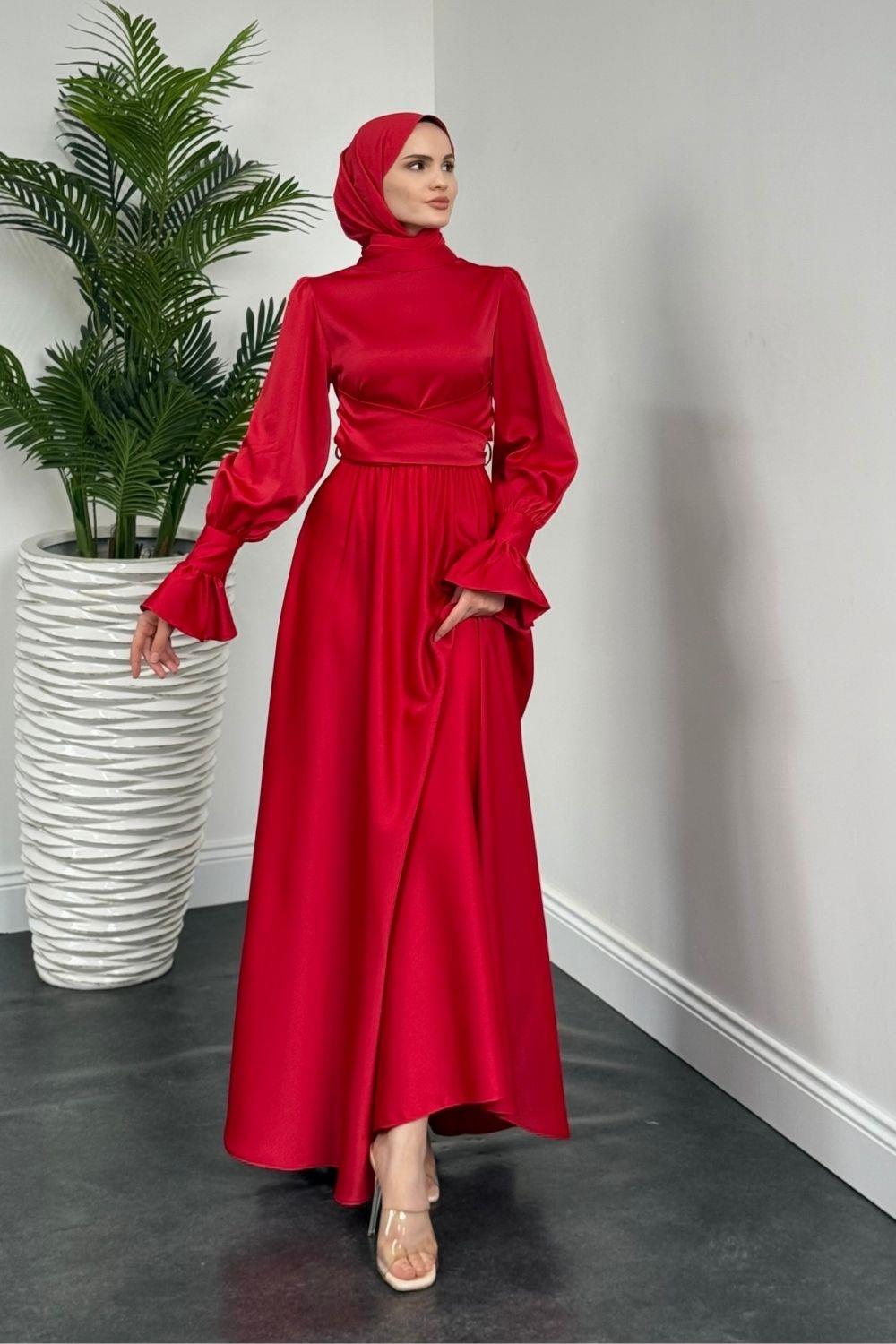 Belina Çapraz Kolları Fırfır Abiye Kırmızı