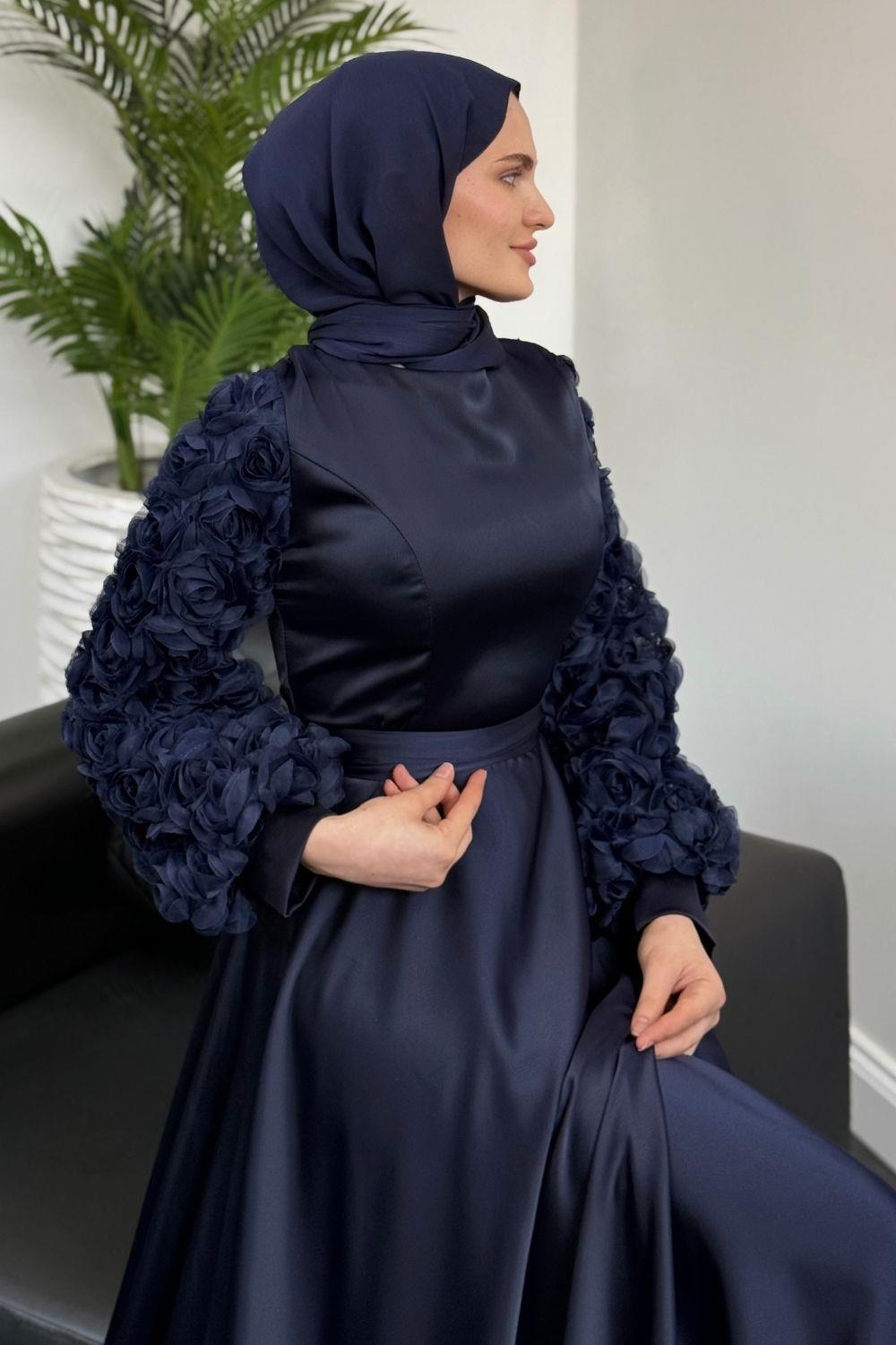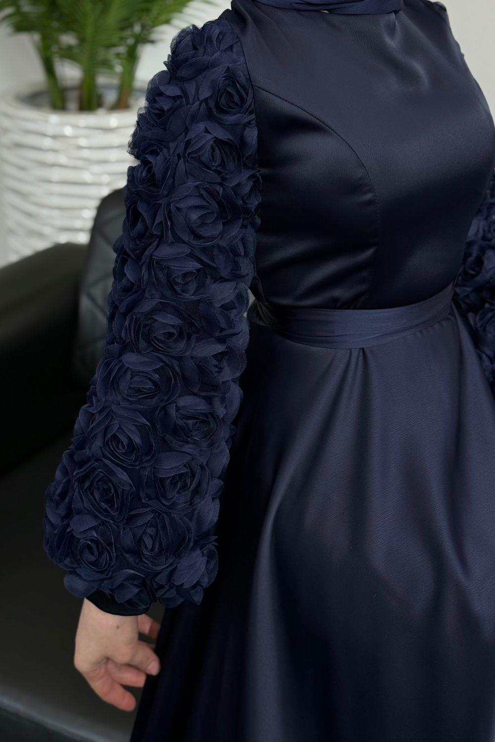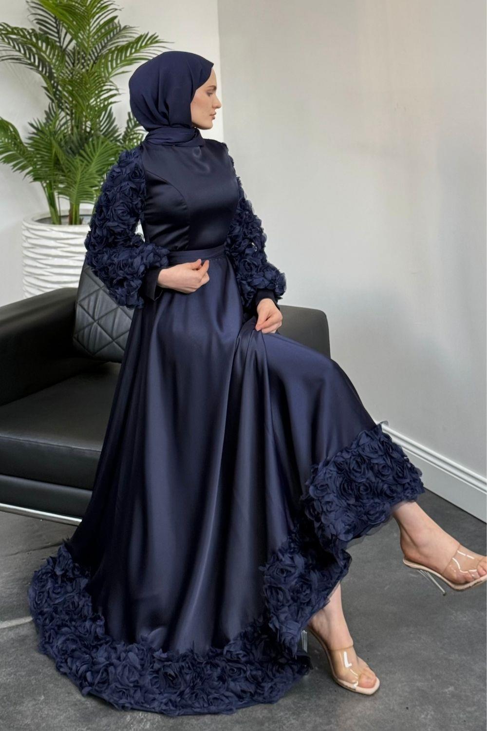 Fiona Kolları ve Alt Kısmı Gül Detay Saten Abiye Lacivert
