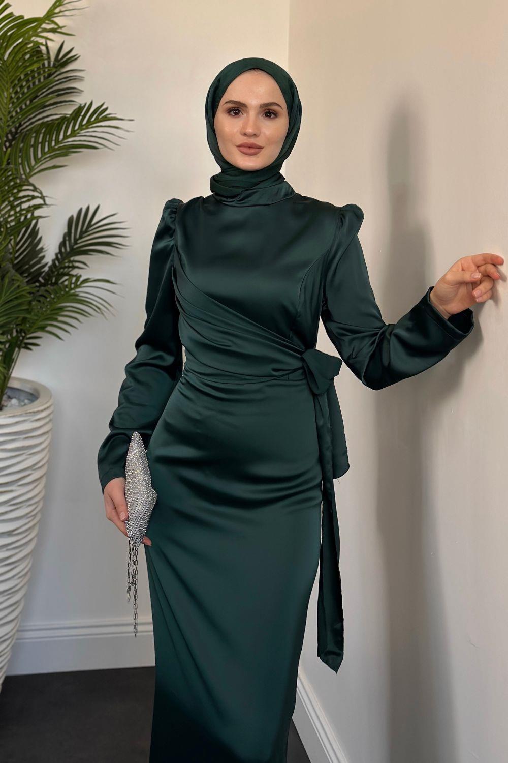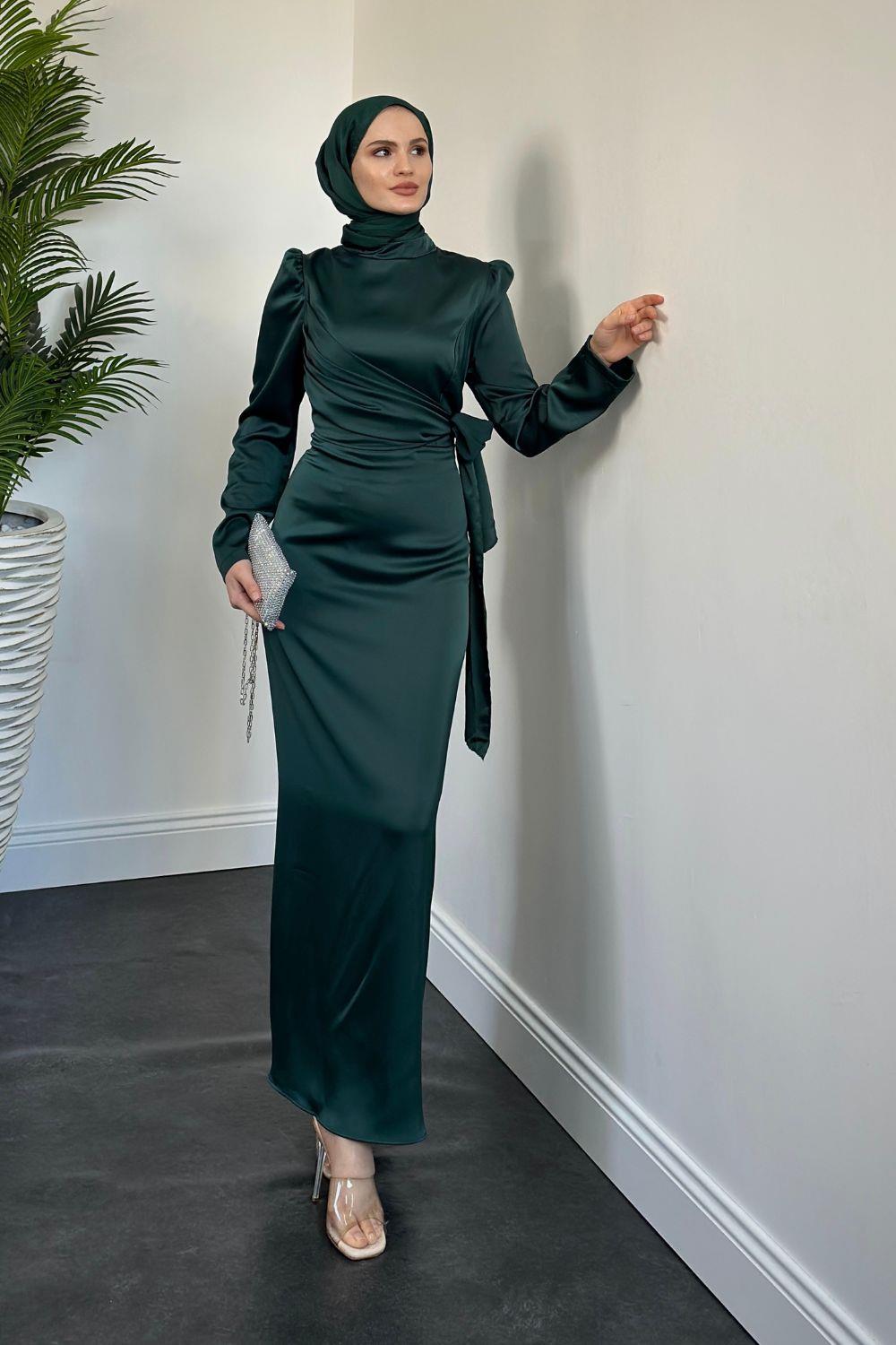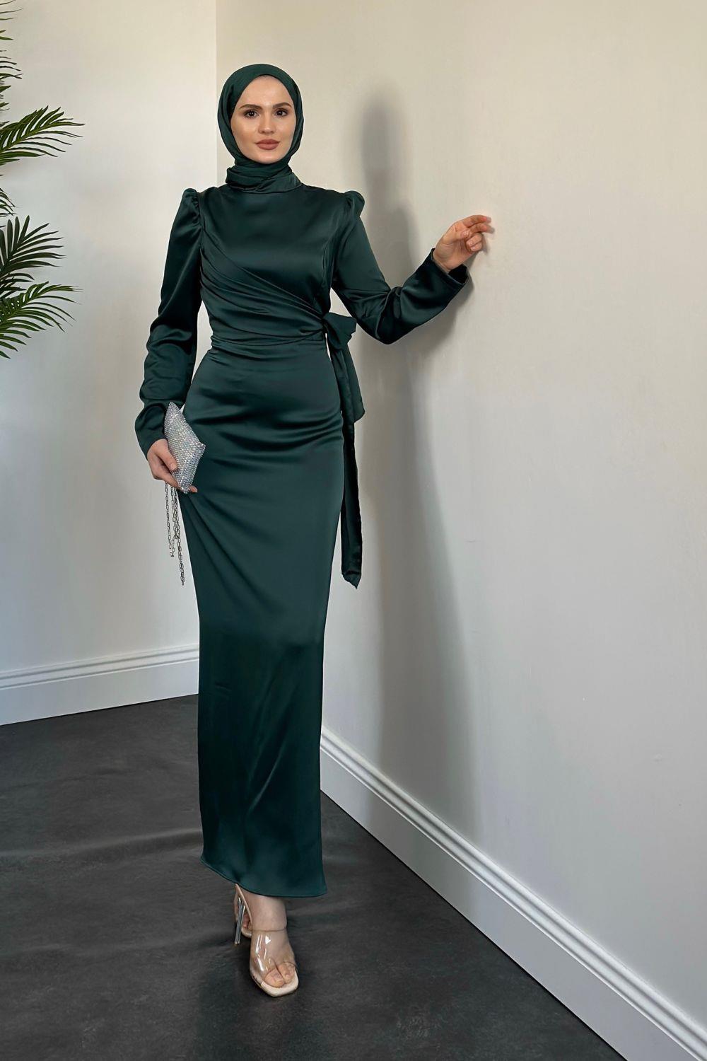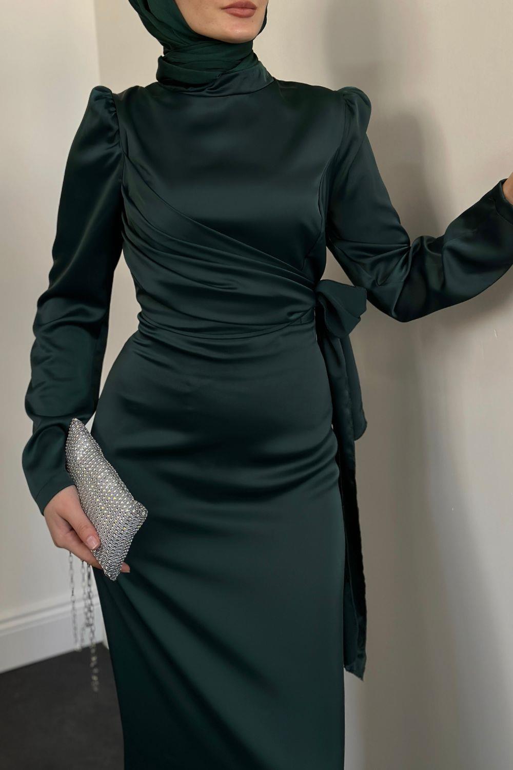 Laure Yandan Bağlamalı Saten Abiye Zümrüt