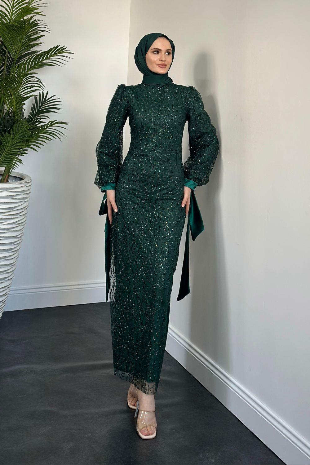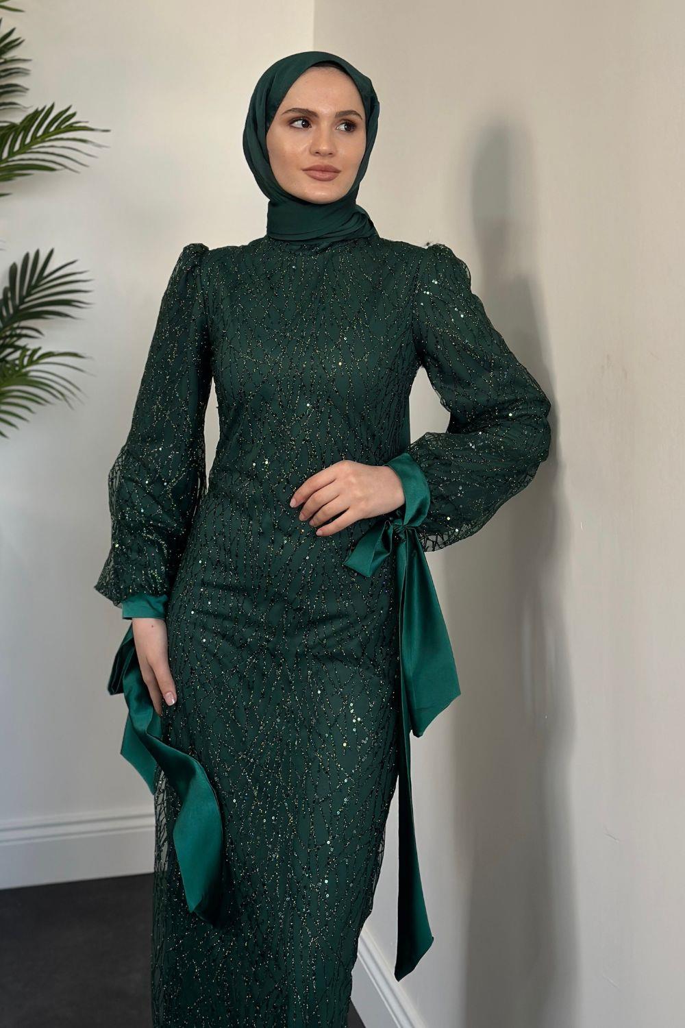Serina Kolları Fiyonklu Simli Abiye Zümrüt