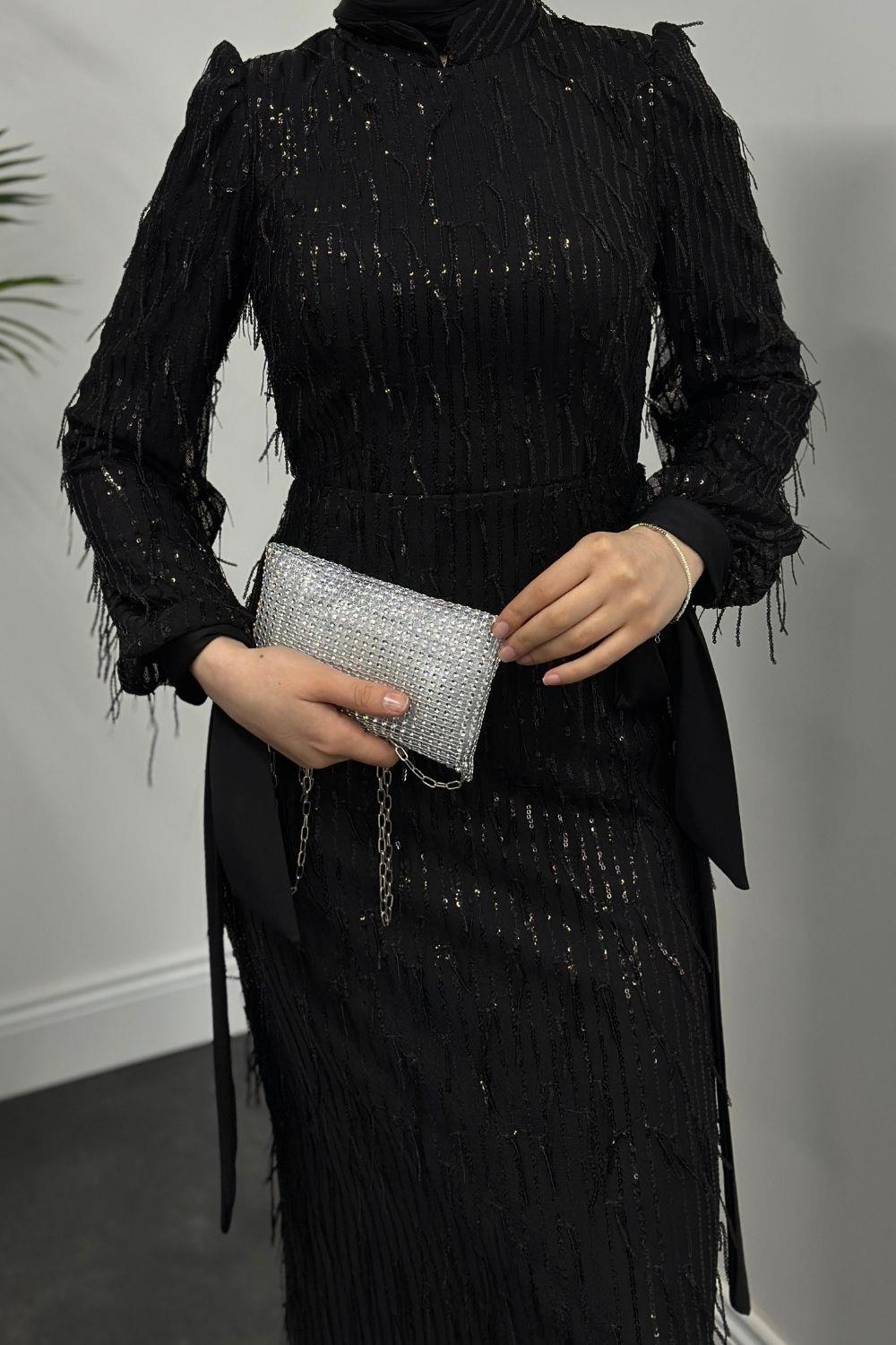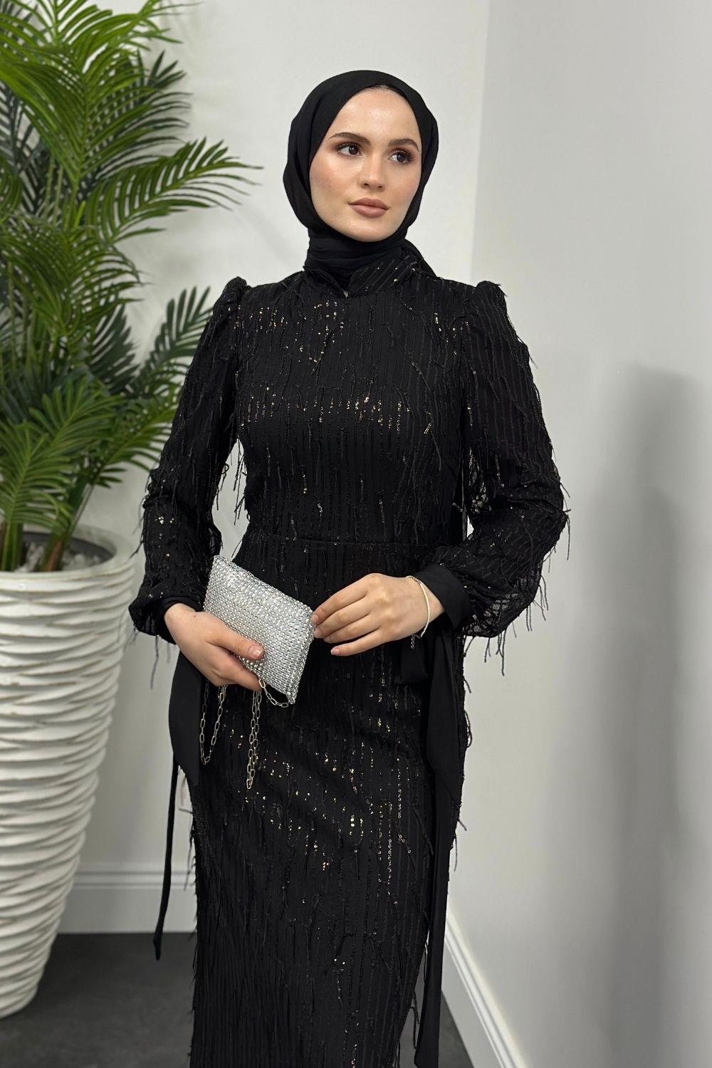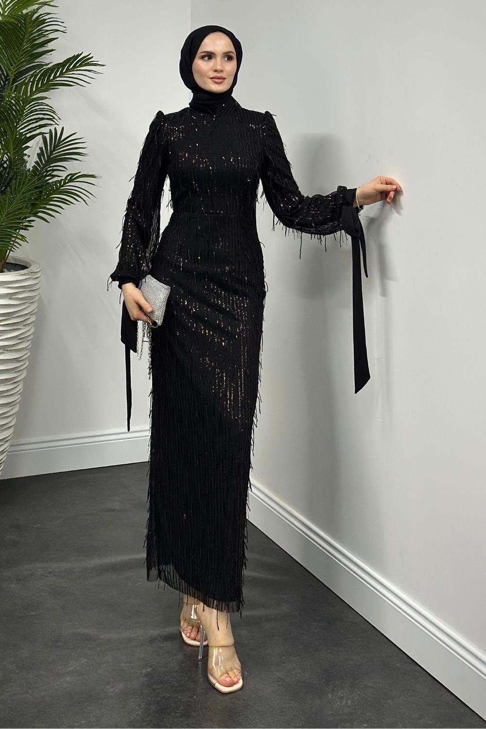 Alena Püsküllü Pullu Kalem Abiye Siyah