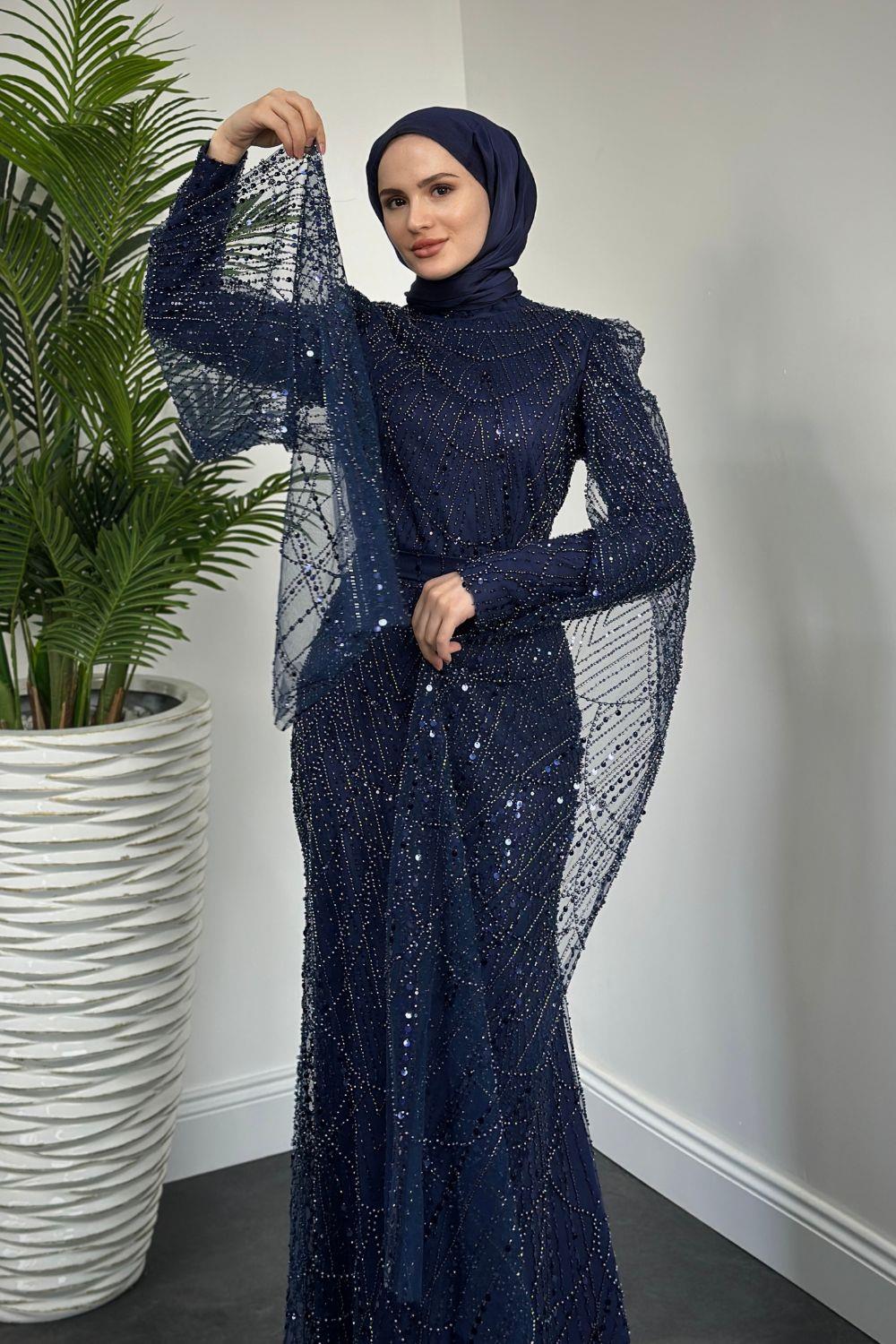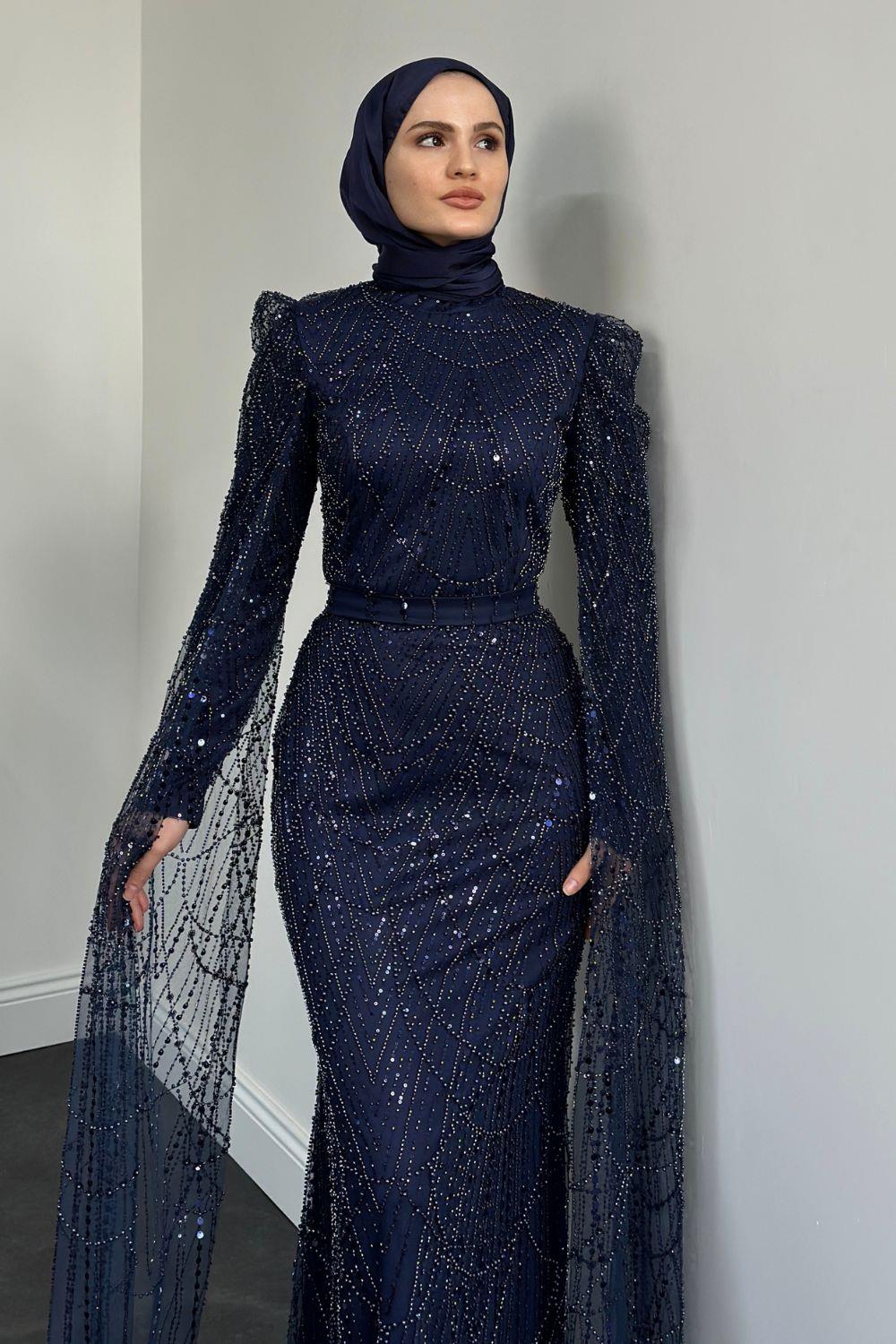 Brunella Pelerinli Taş İşlemeli Balık Model Abiye Lacivert