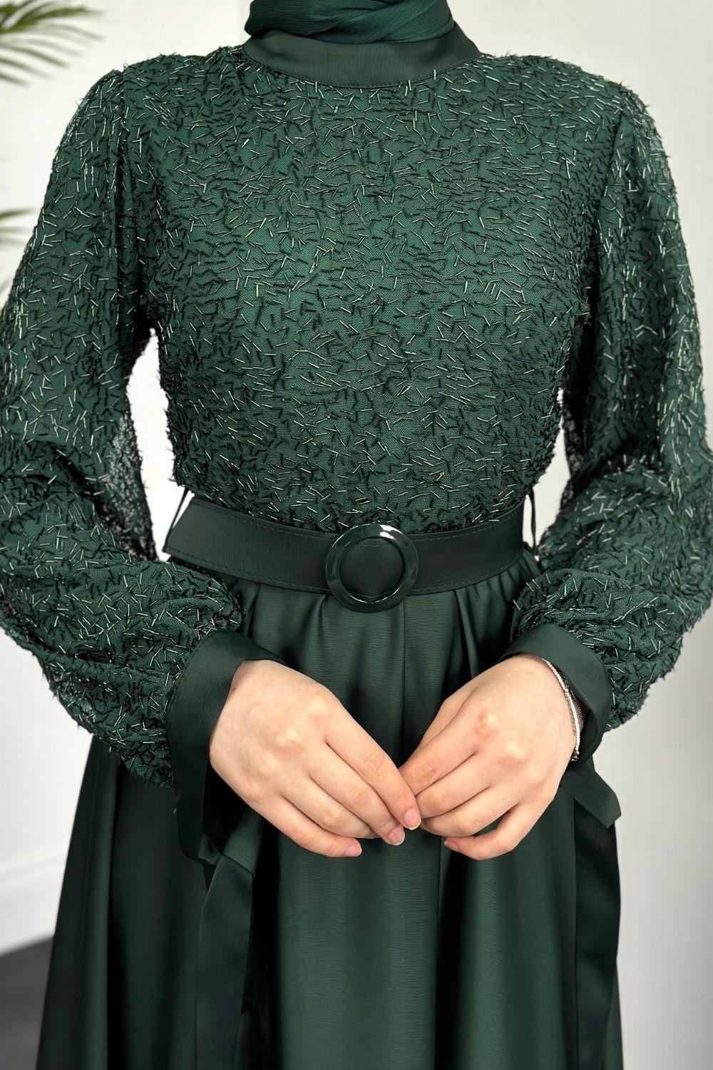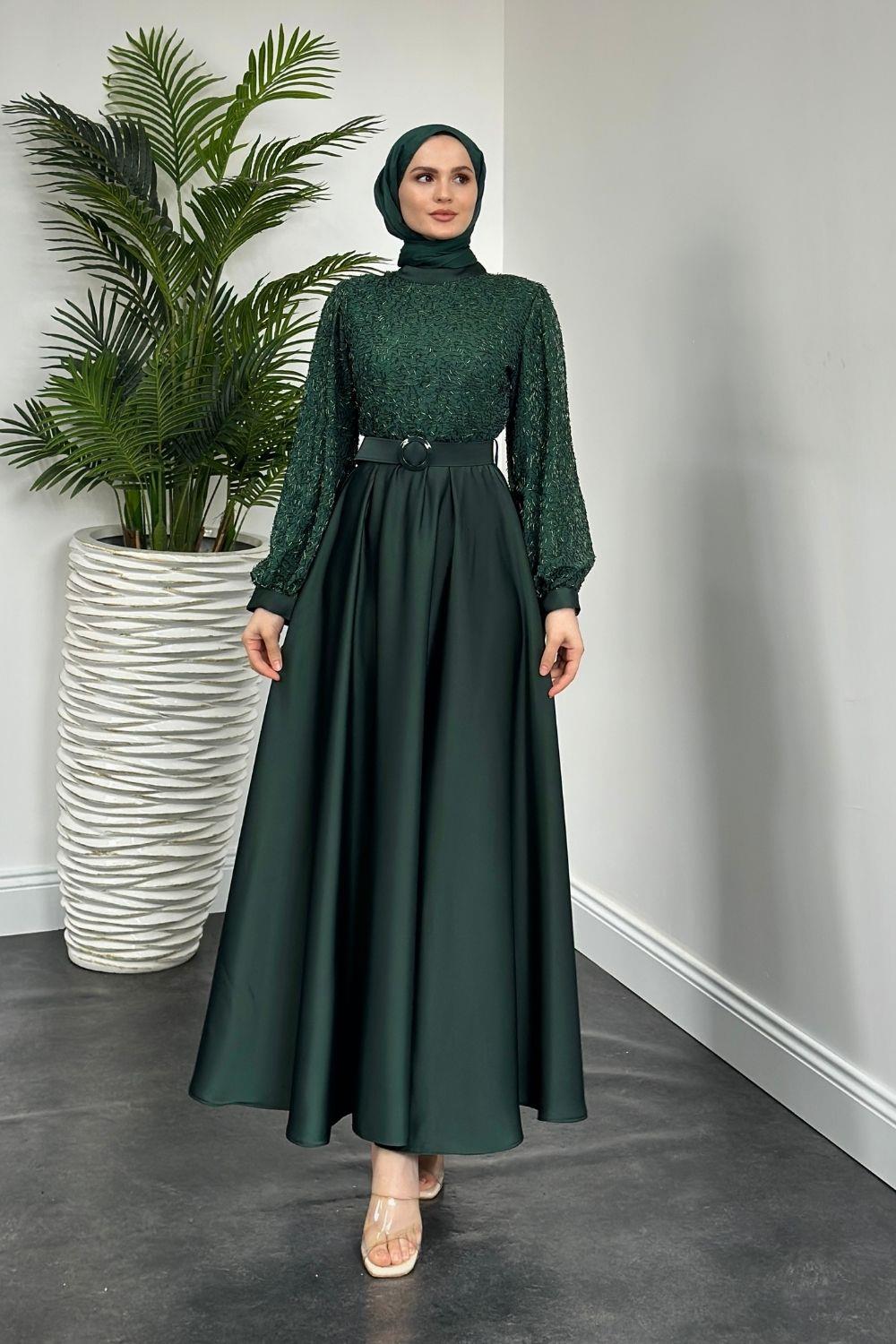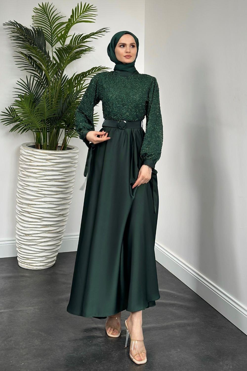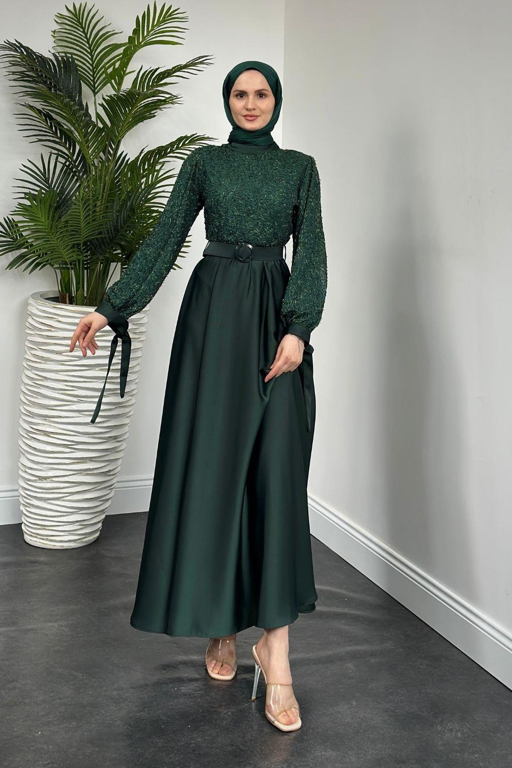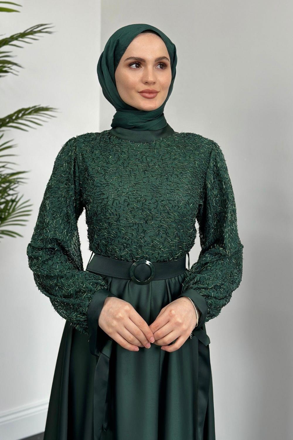 Mihret Üstü Boncuk İşleme Abiye Zümrüt