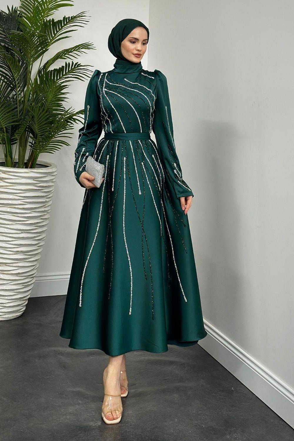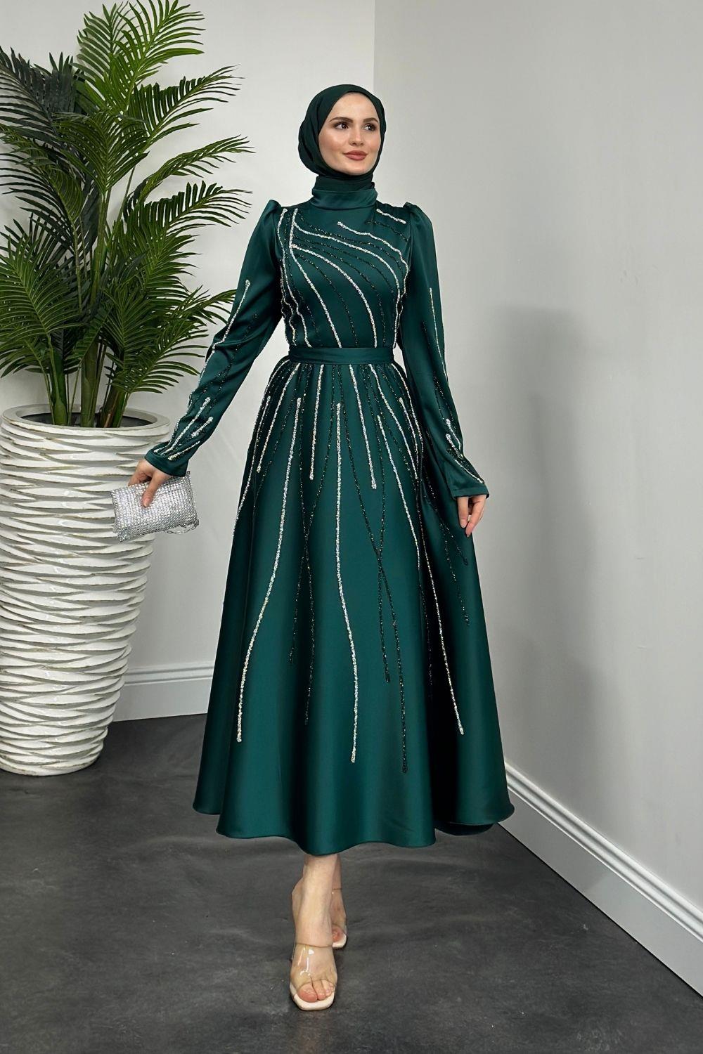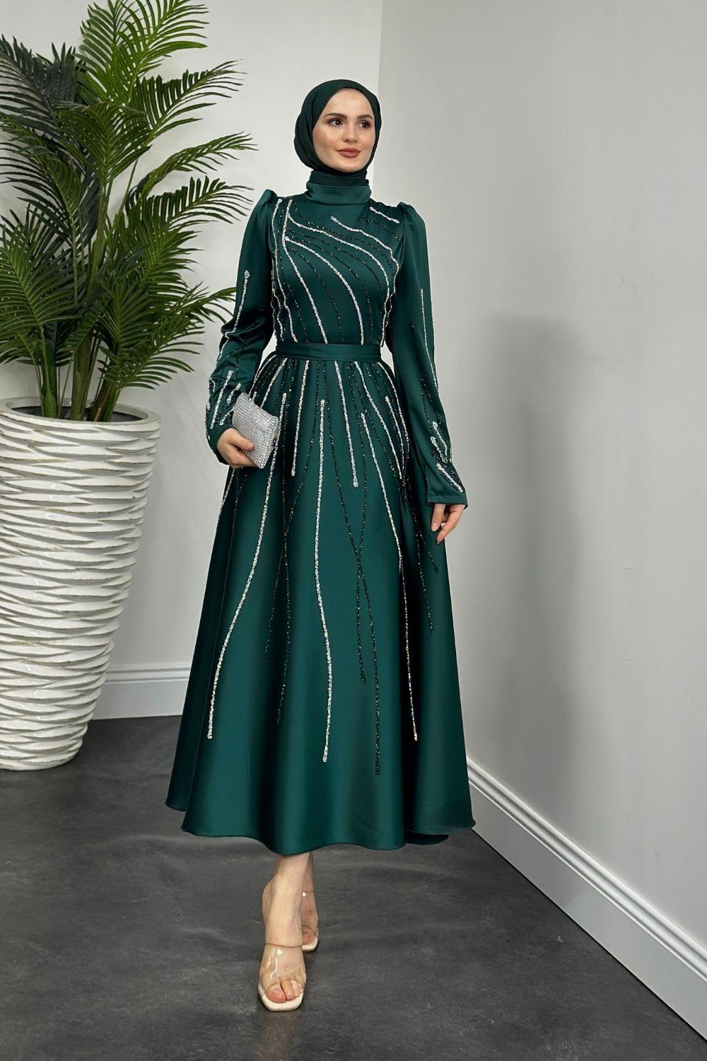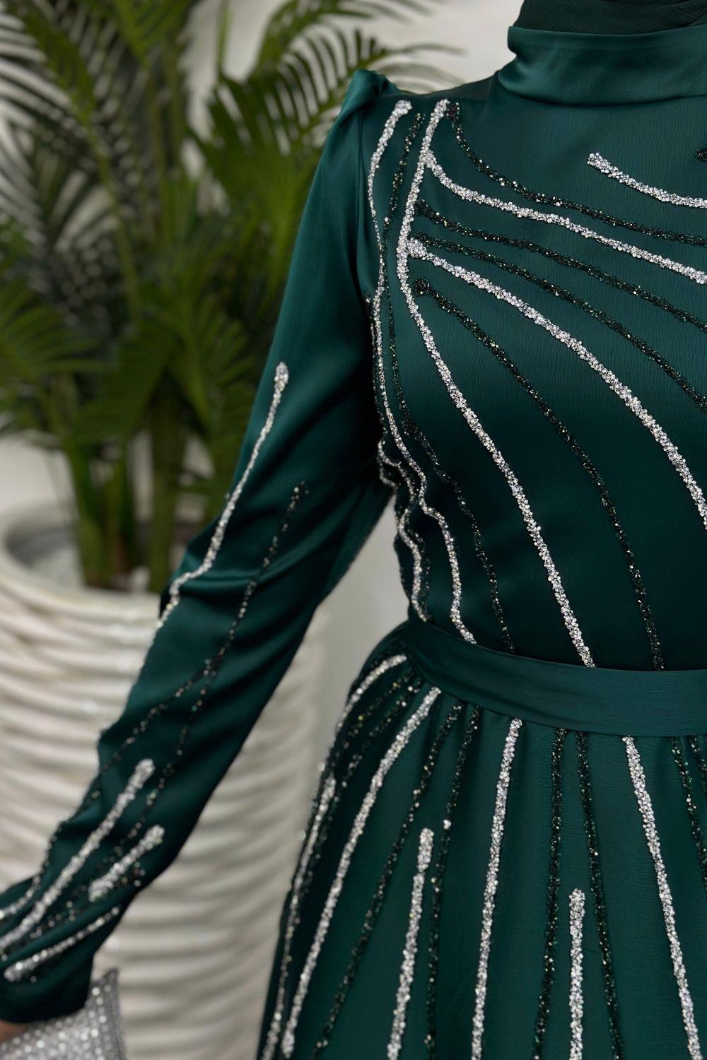 Azelea Saten Taşlı Abiye Zümrüt