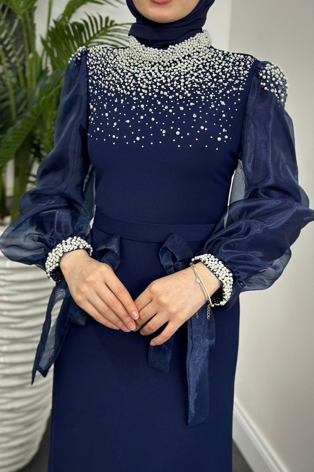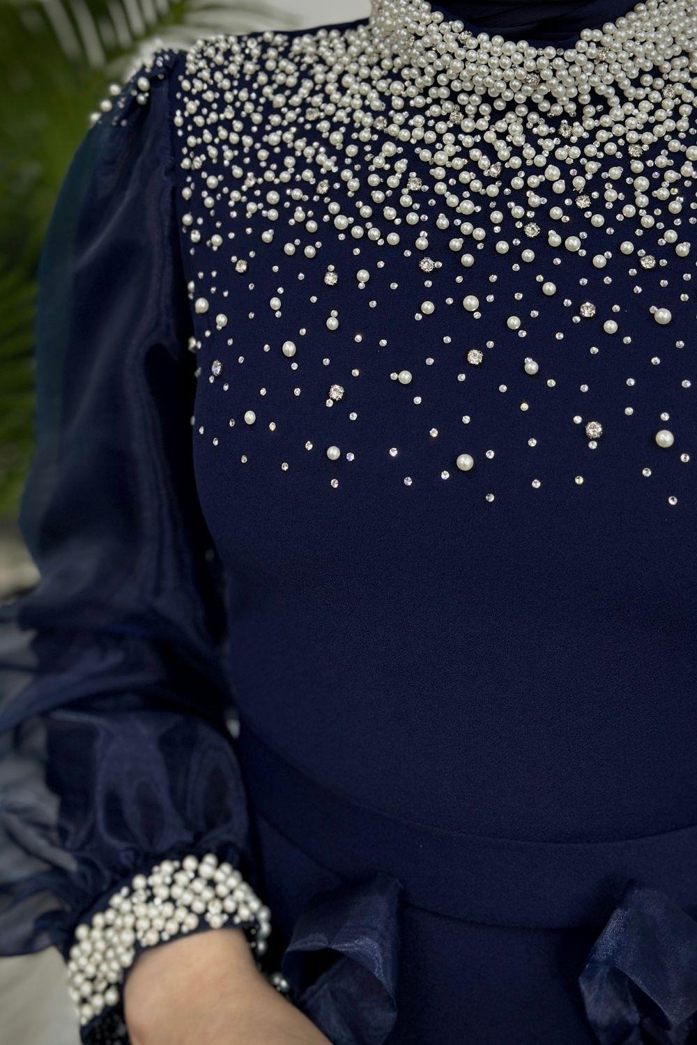 Nina İnci İşlemeli Krep Abiye Lacivert(kemersizdir)