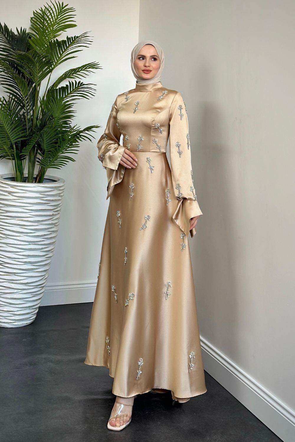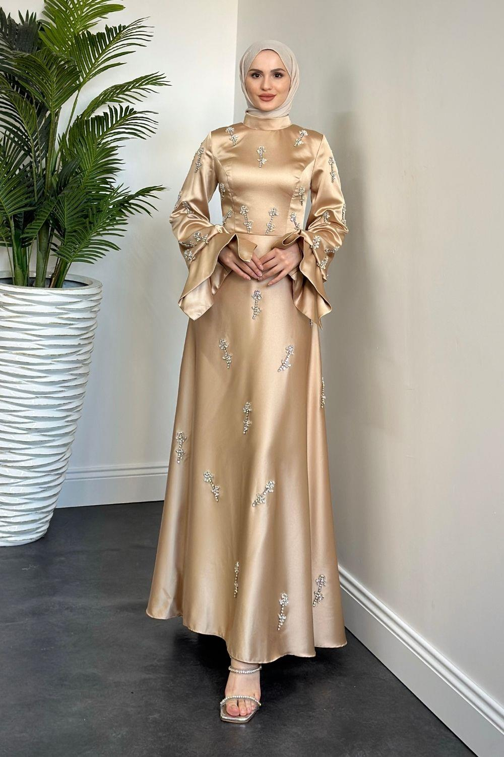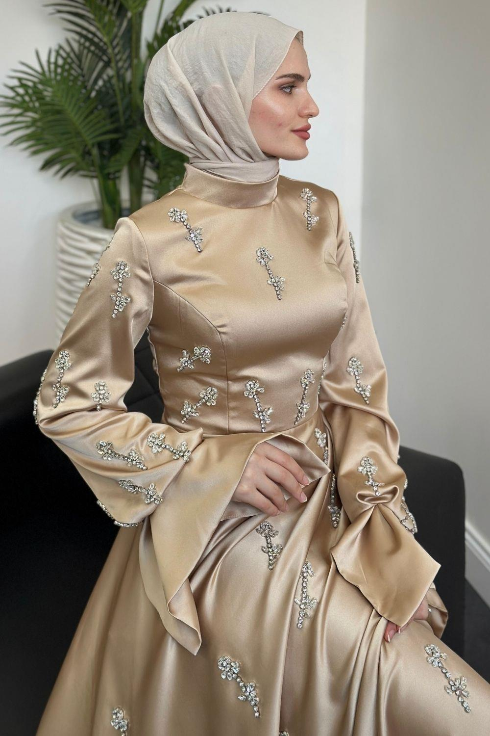 Emilia Prenses Taşlı Saten Abiye Vizon