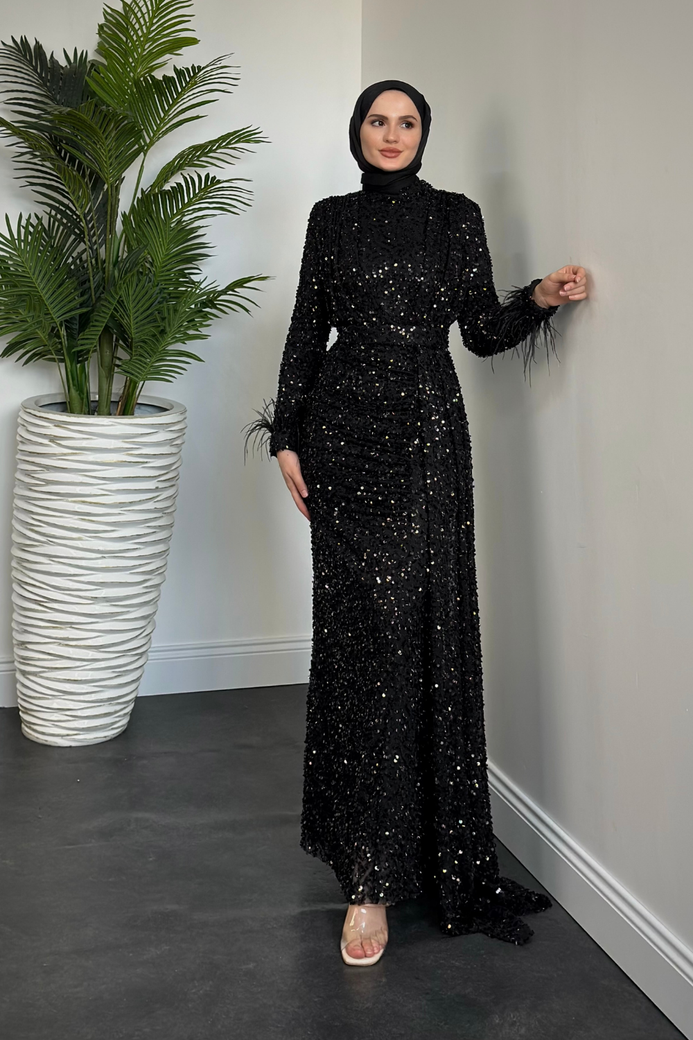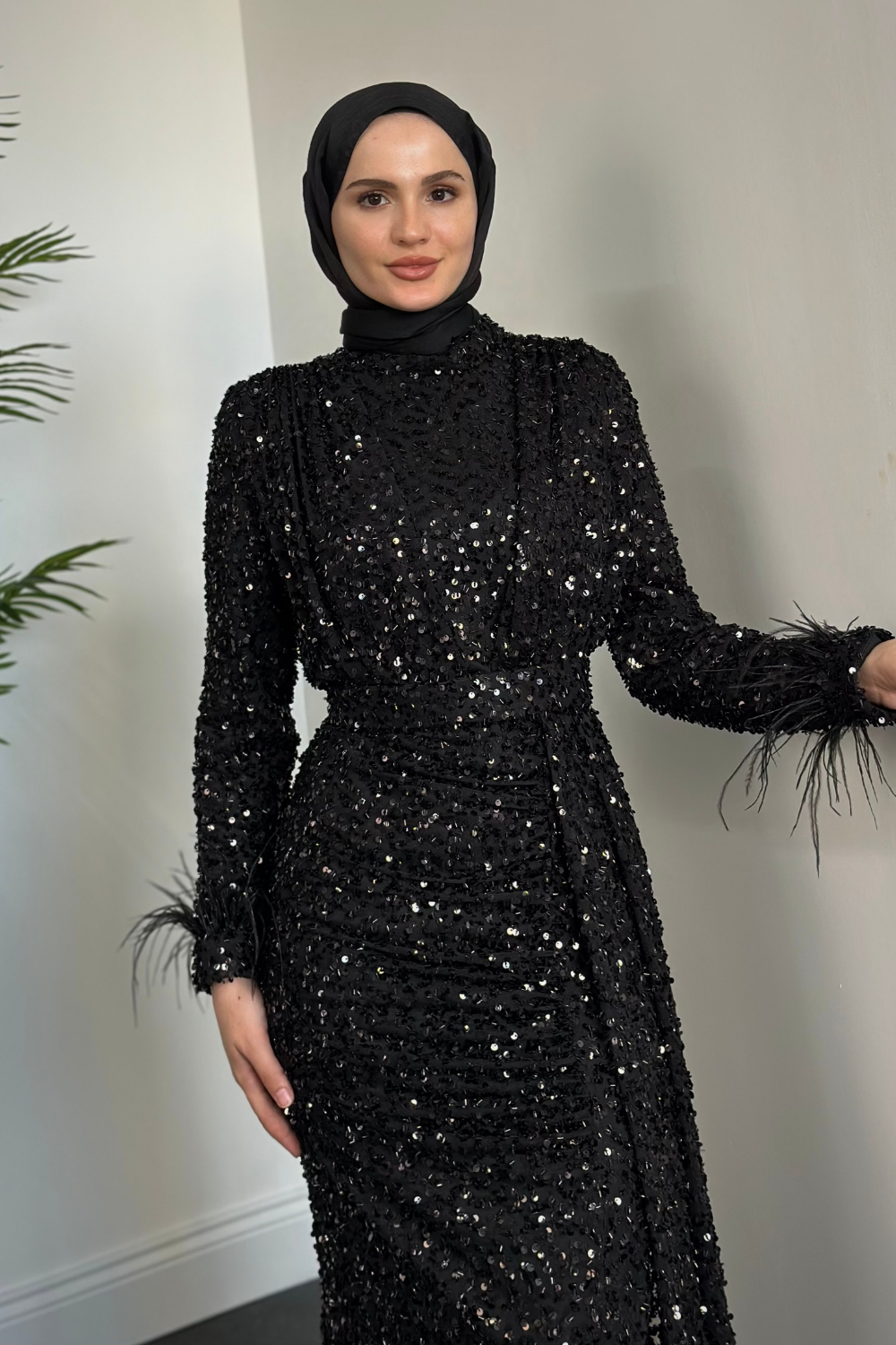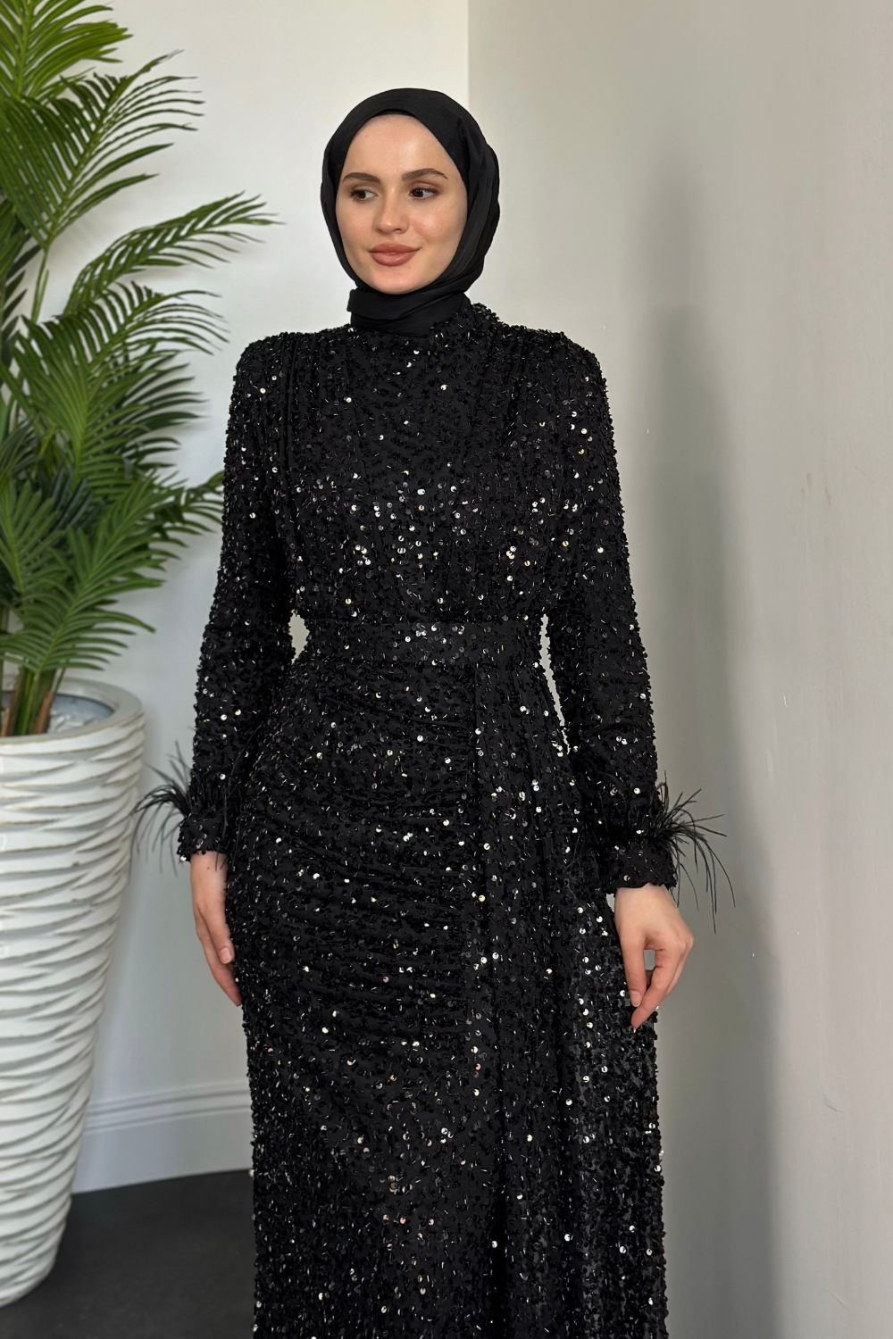Jalen Yanı Pelerinli Payetli Balık Abiye Siyah