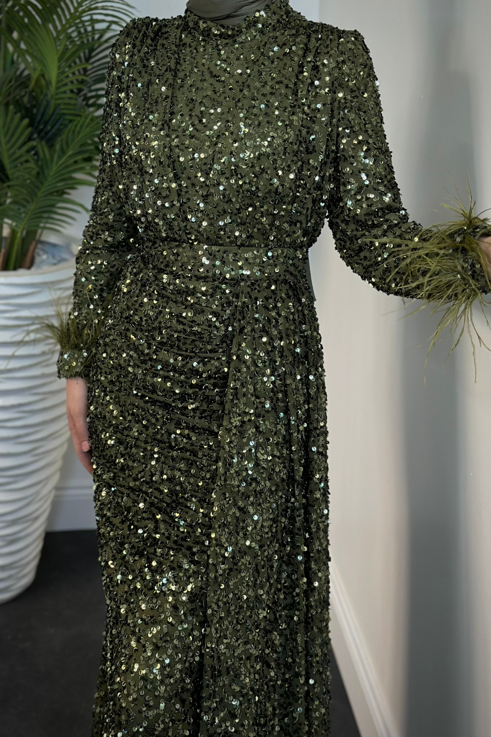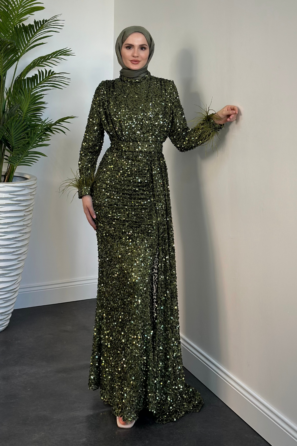Jalen Yanı Pelerinli Payetli Balık Abiye Haki