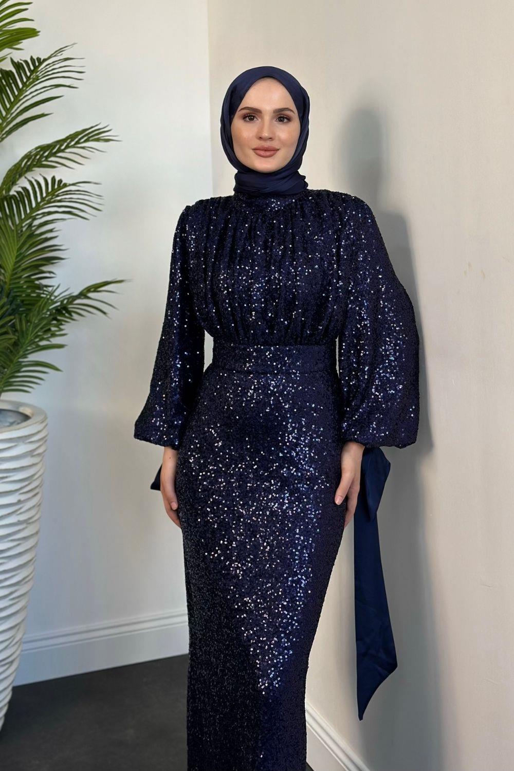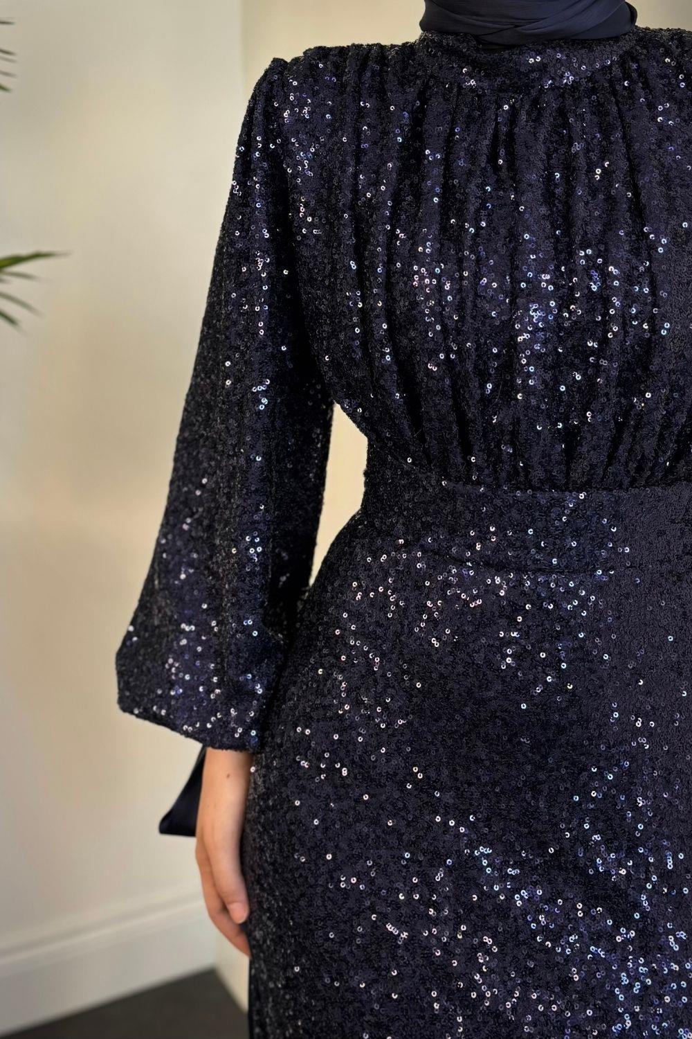 Angeline Drape Detay Pul Payet Abiye Lacivert