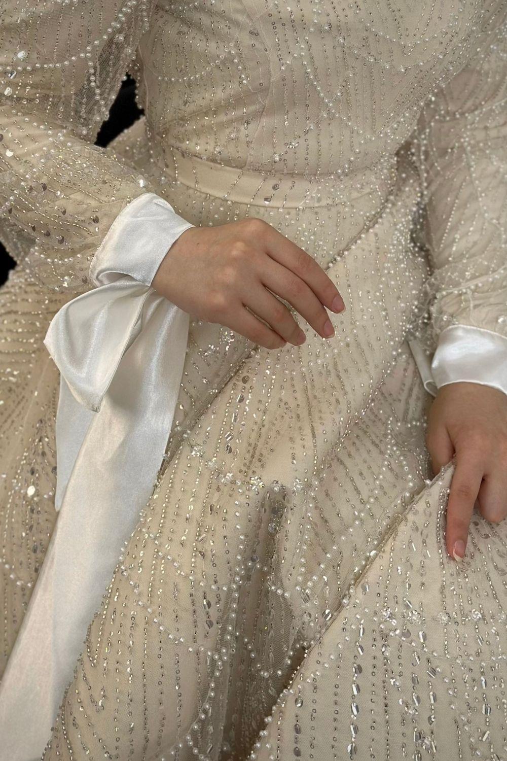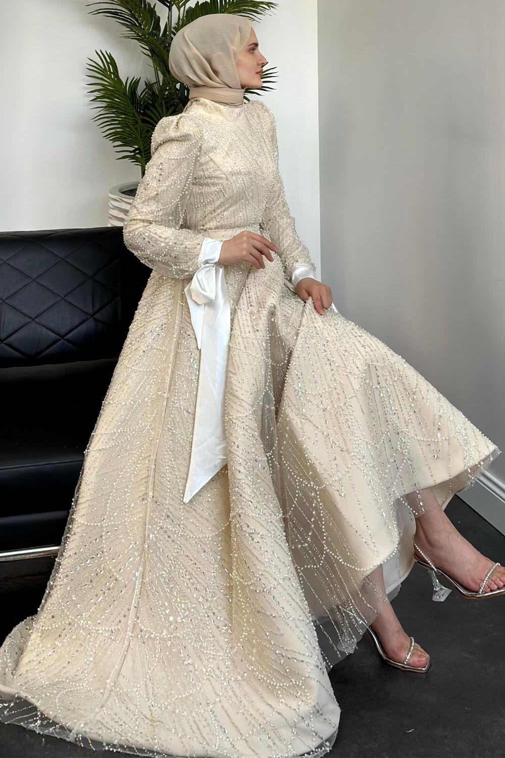 Vittoria Kolu Fiyonk Boncuk İşlemeli Abiye Krem