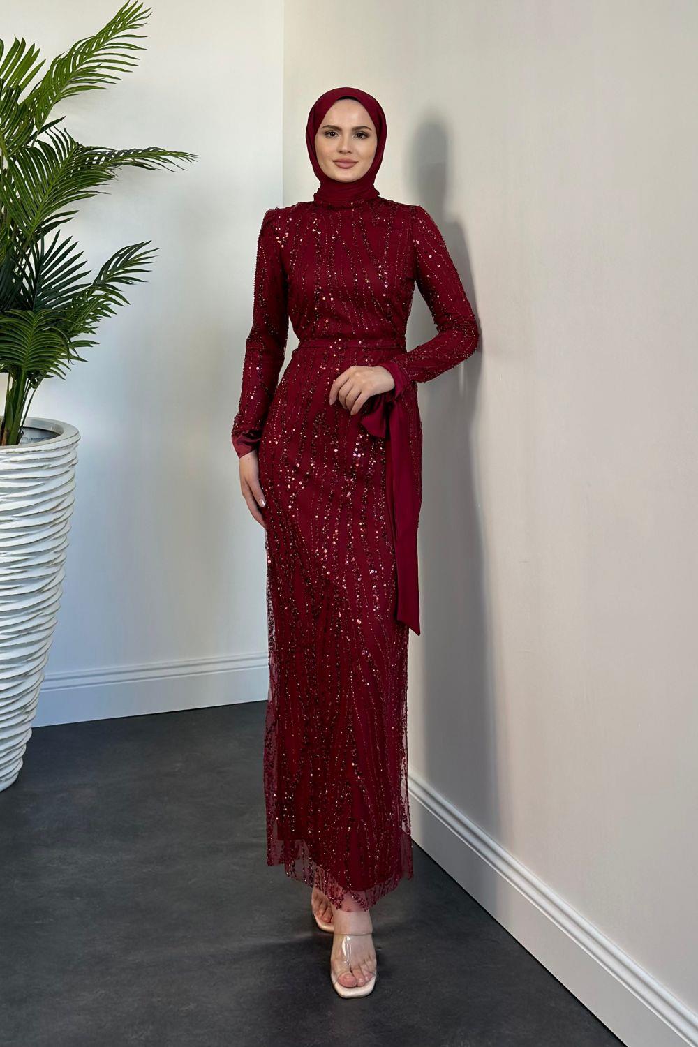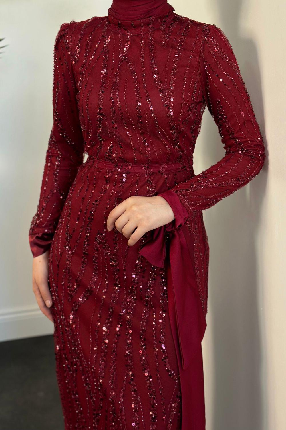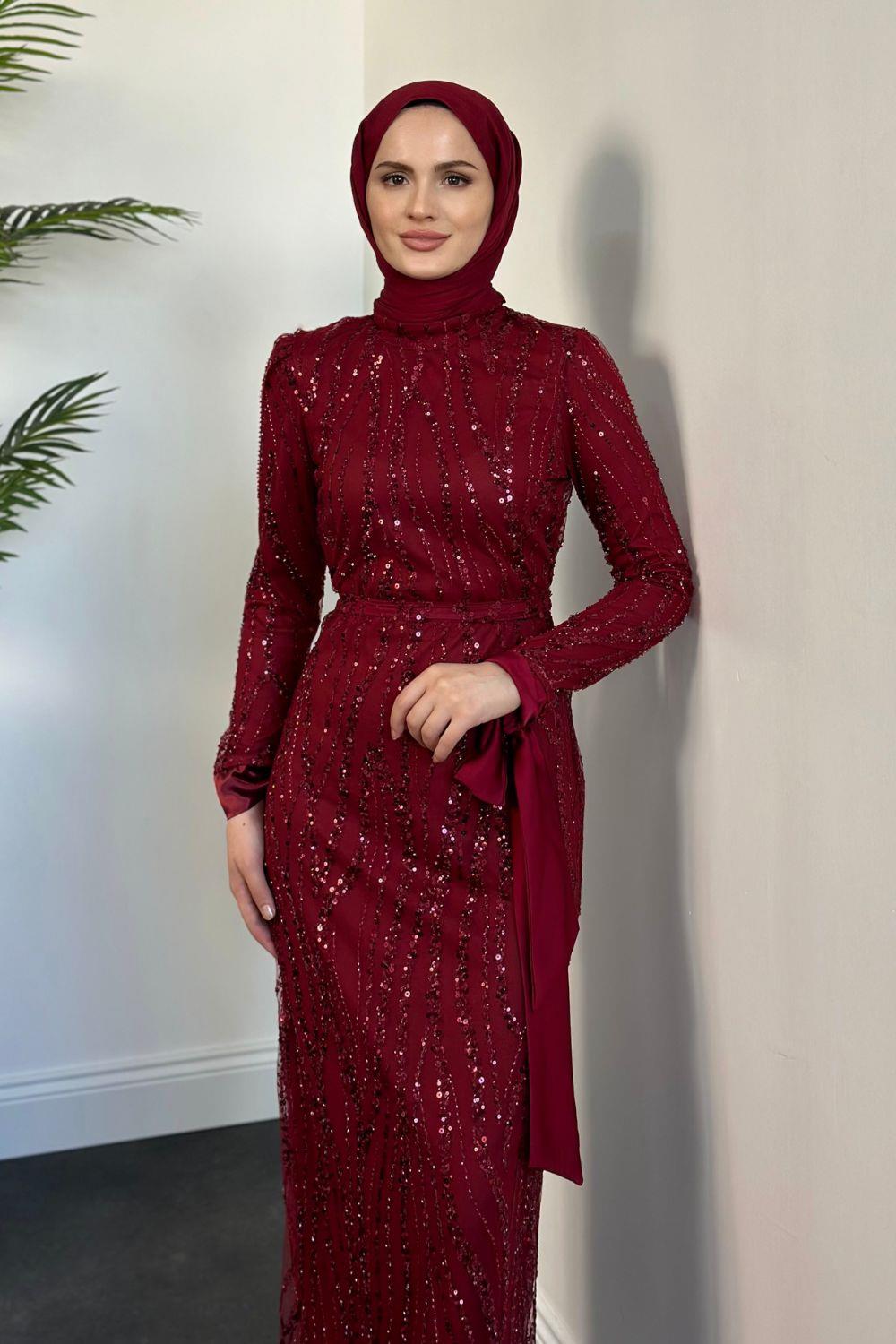 Eylül Kolları Bağcıklı Payetli Abiye Bordo