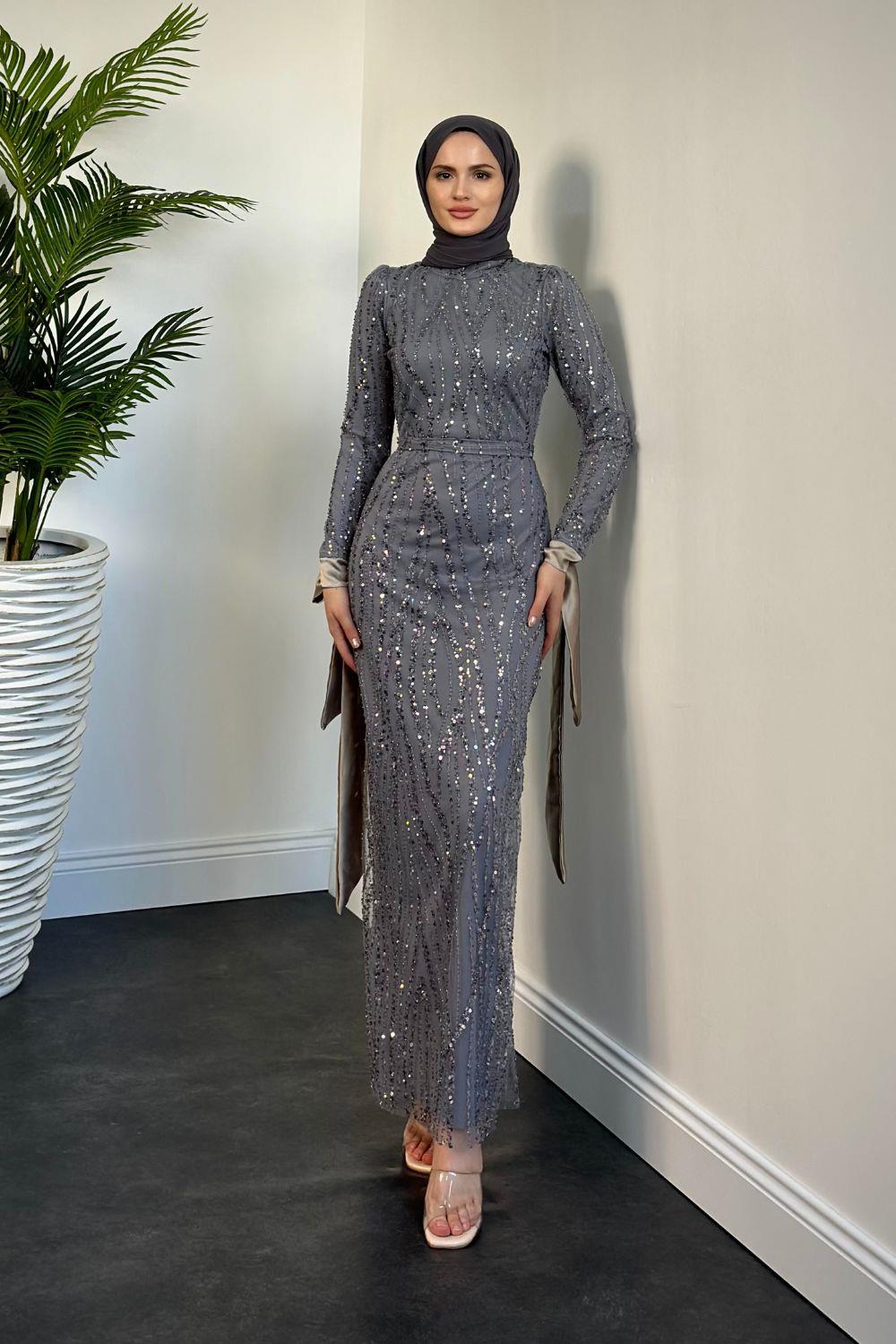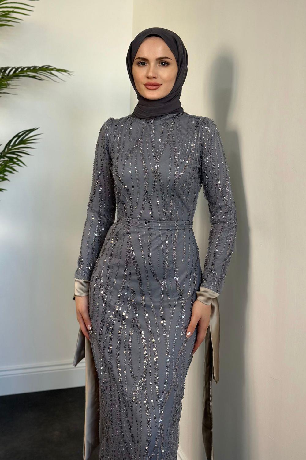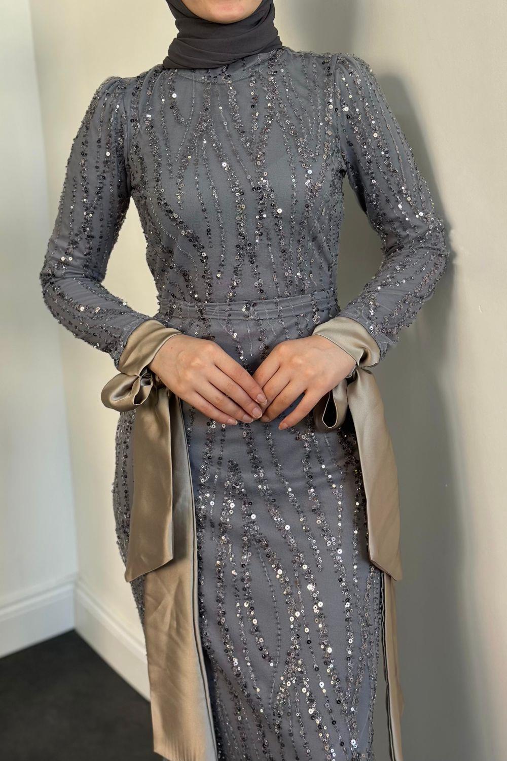 Eylül Kolları Bağcıklı Payetli Abiye Gri