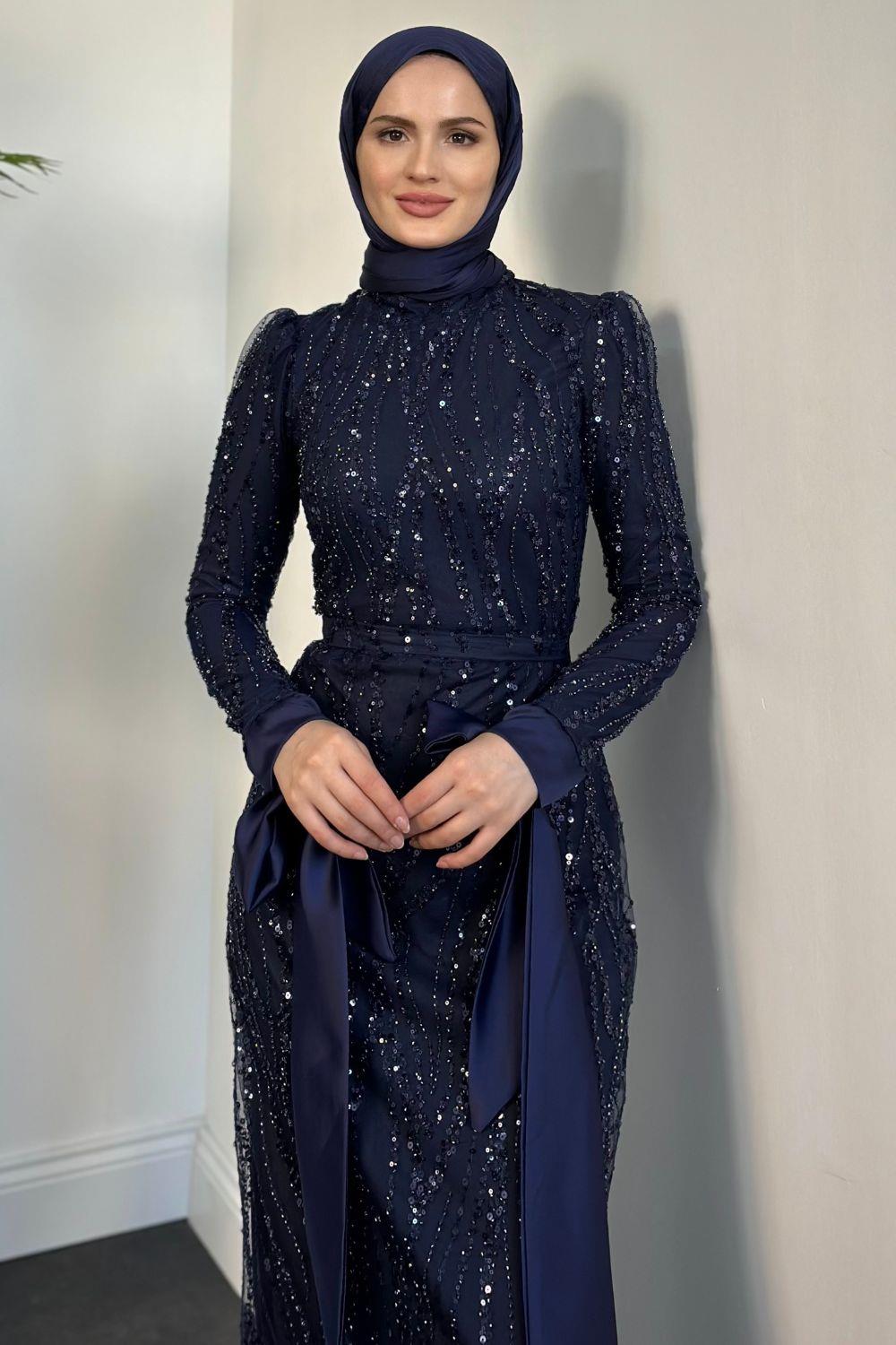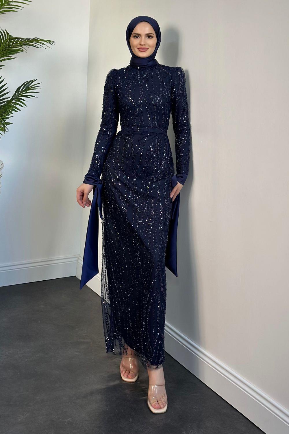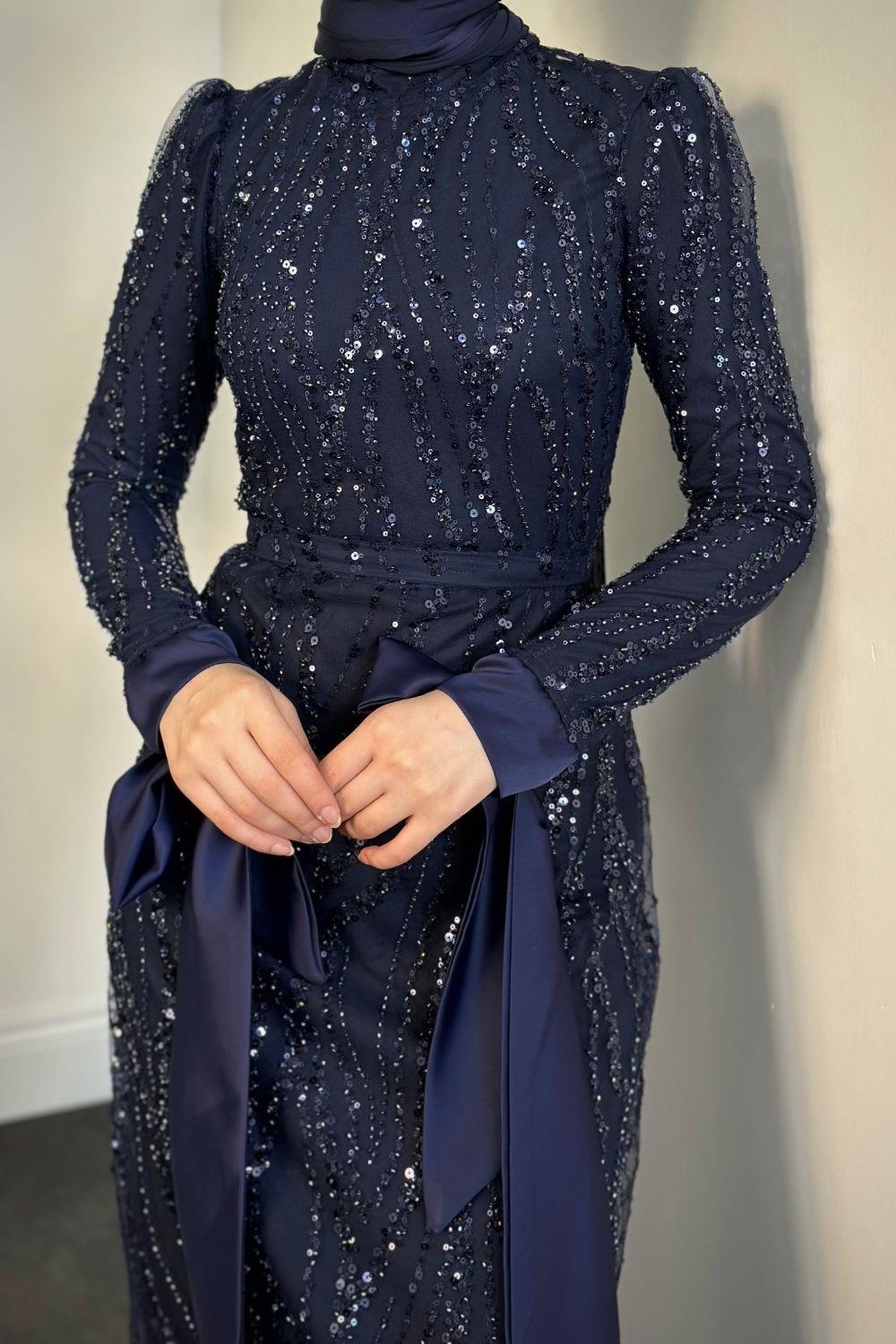 Eylül Kolları Bağcıklı Payetli Abiye Lacivert