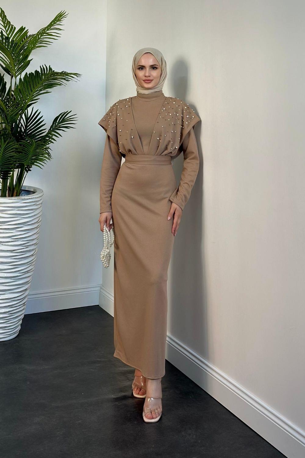 Delmare İnci Pelerinli Abiye Vizon