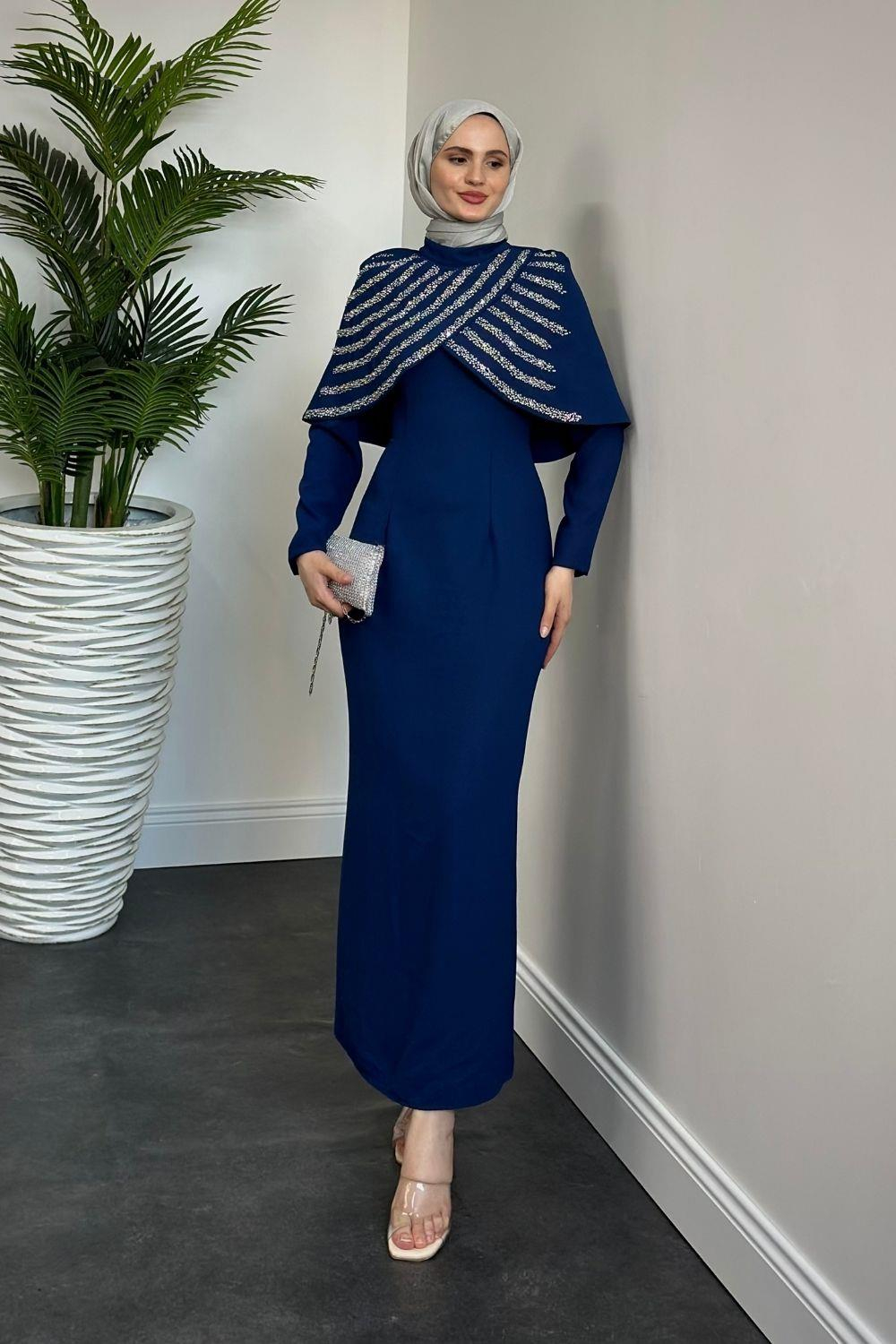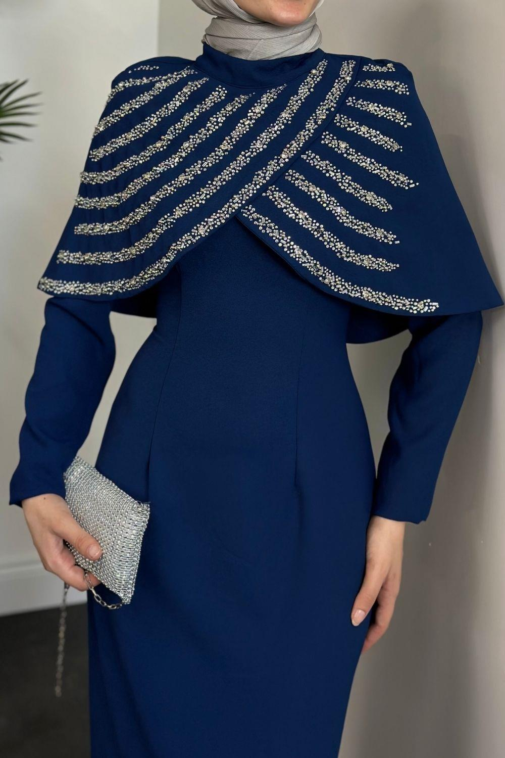 Lowel Taşlı Pelerinli Abiye Lacivert
