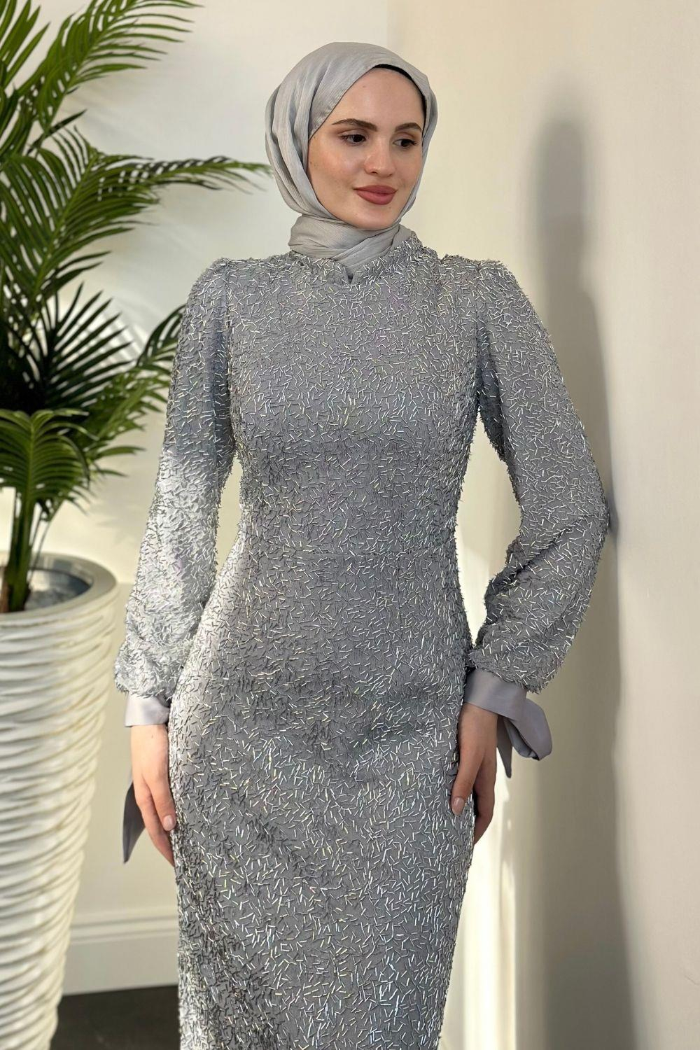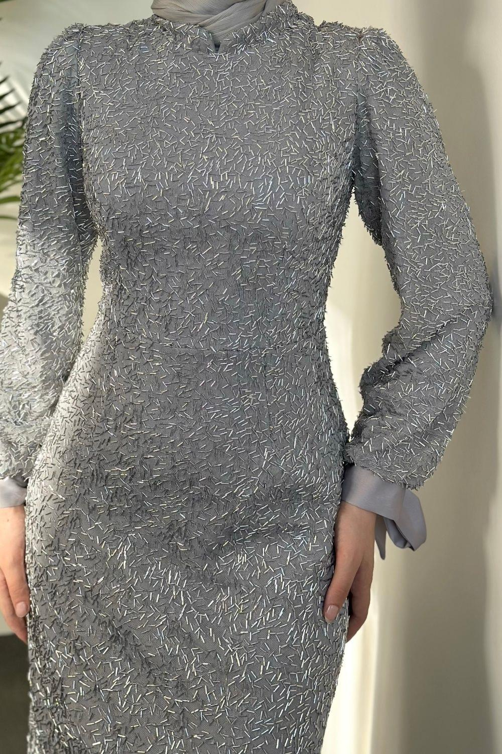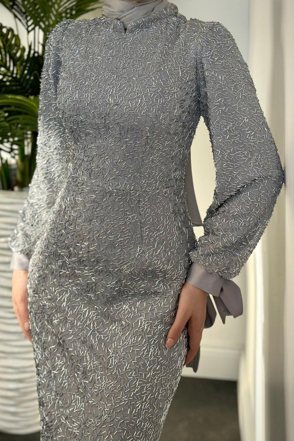 Eldon Boncuk İşleme Abiye Saten Gri