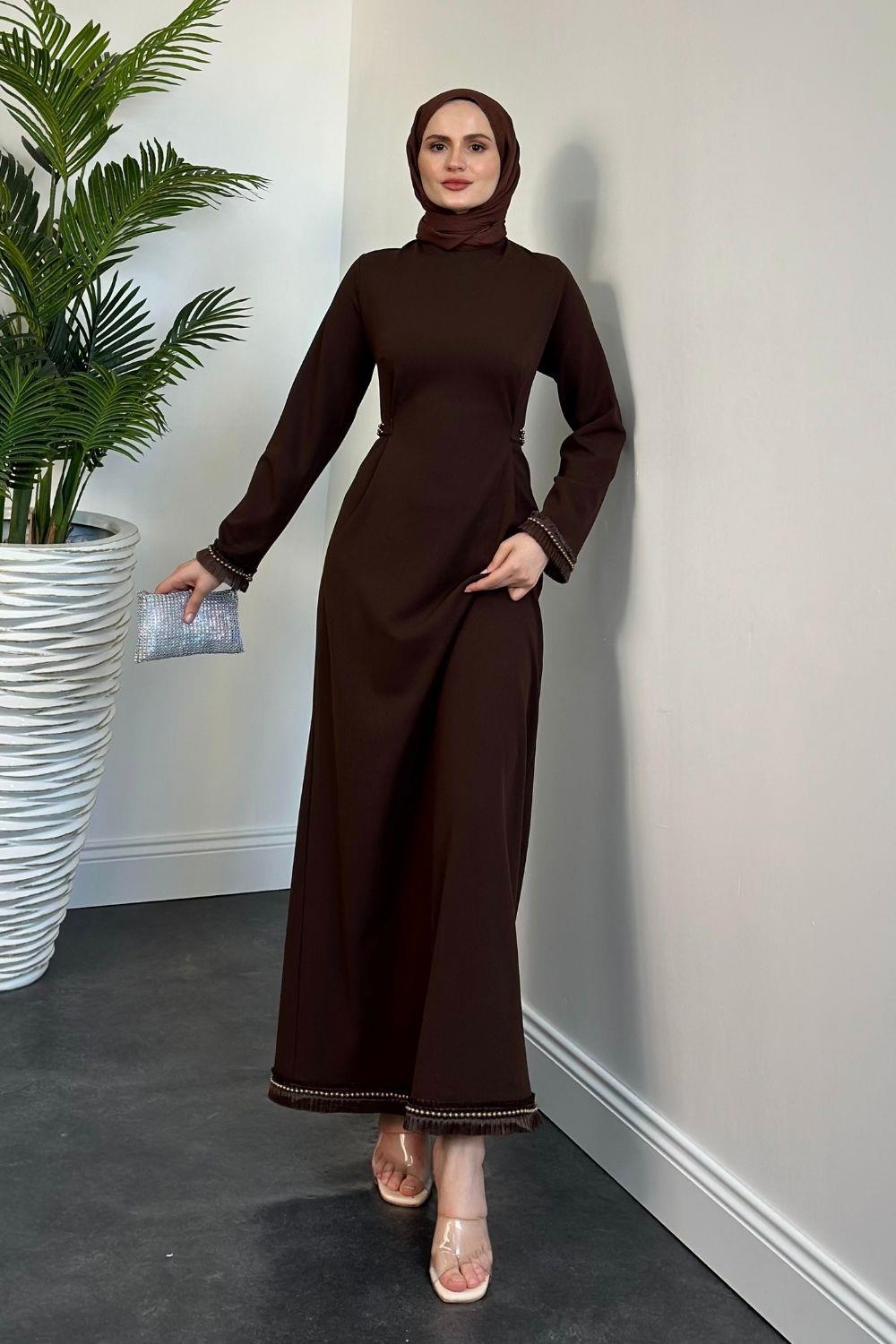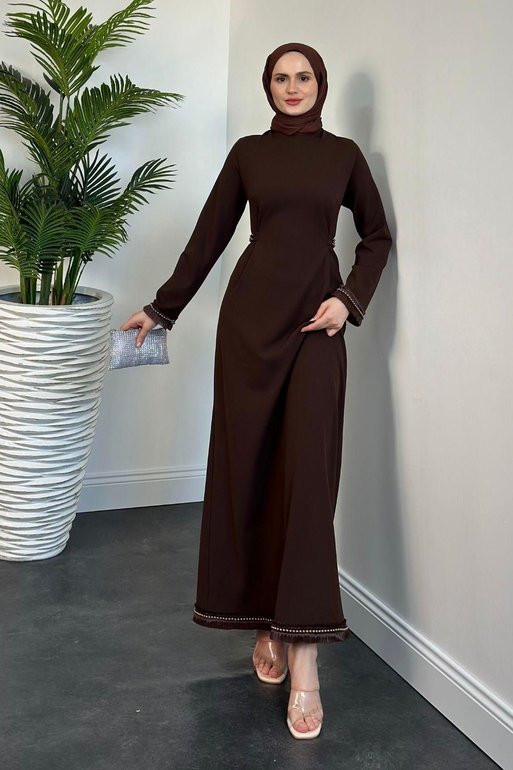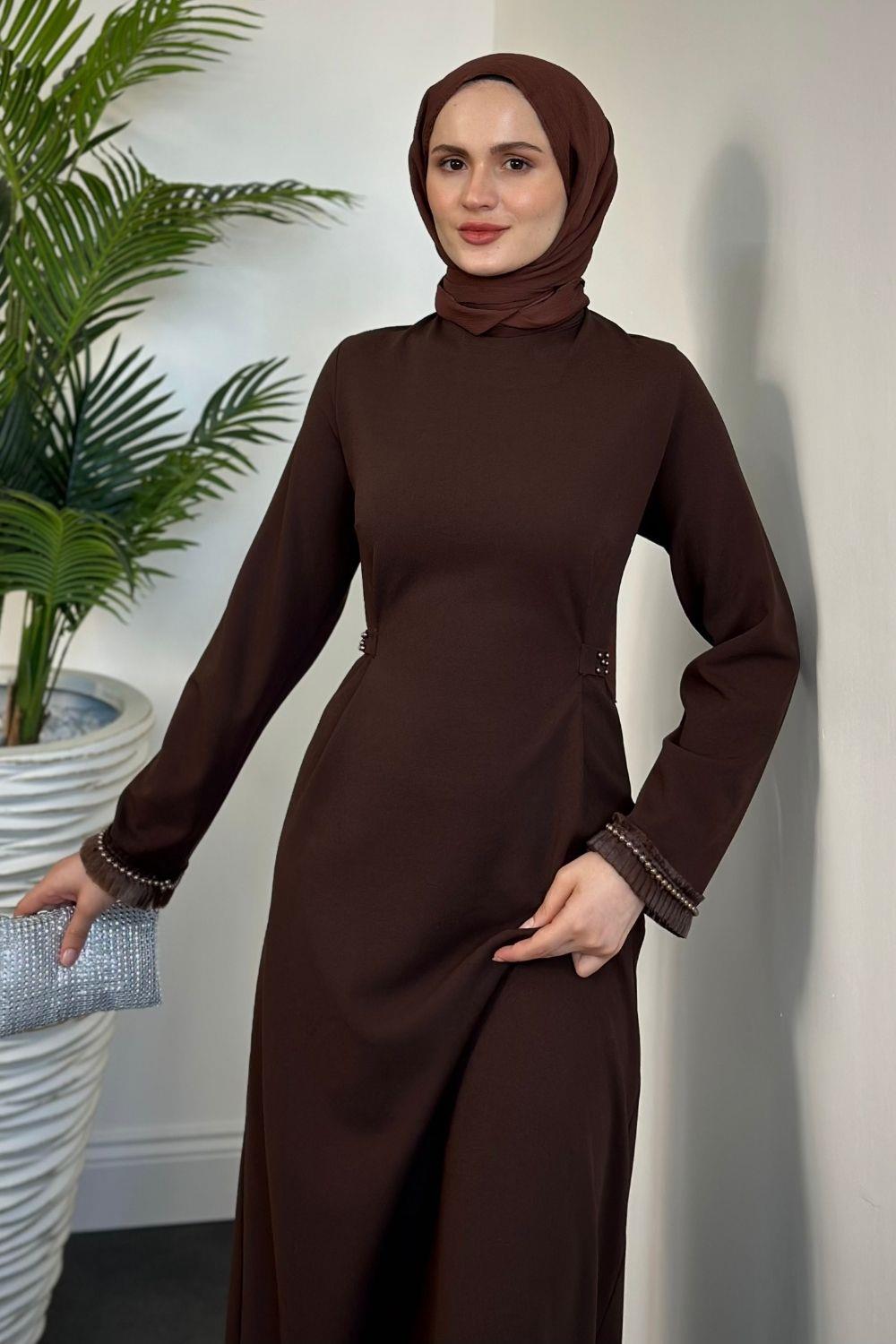 Jawel Etek Kemer ve Kol Ucu İnci Zımbalı Abiye Kahverengi