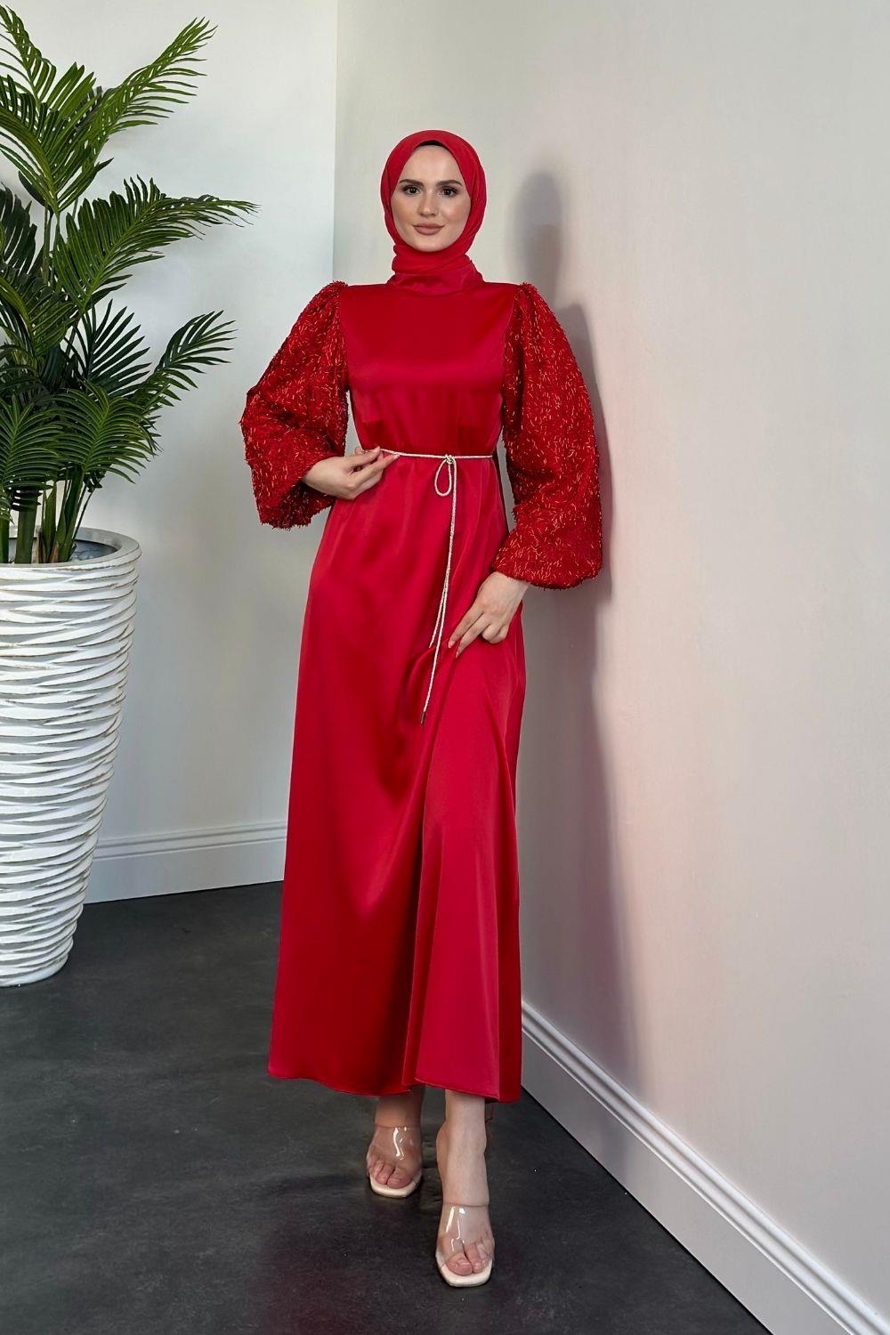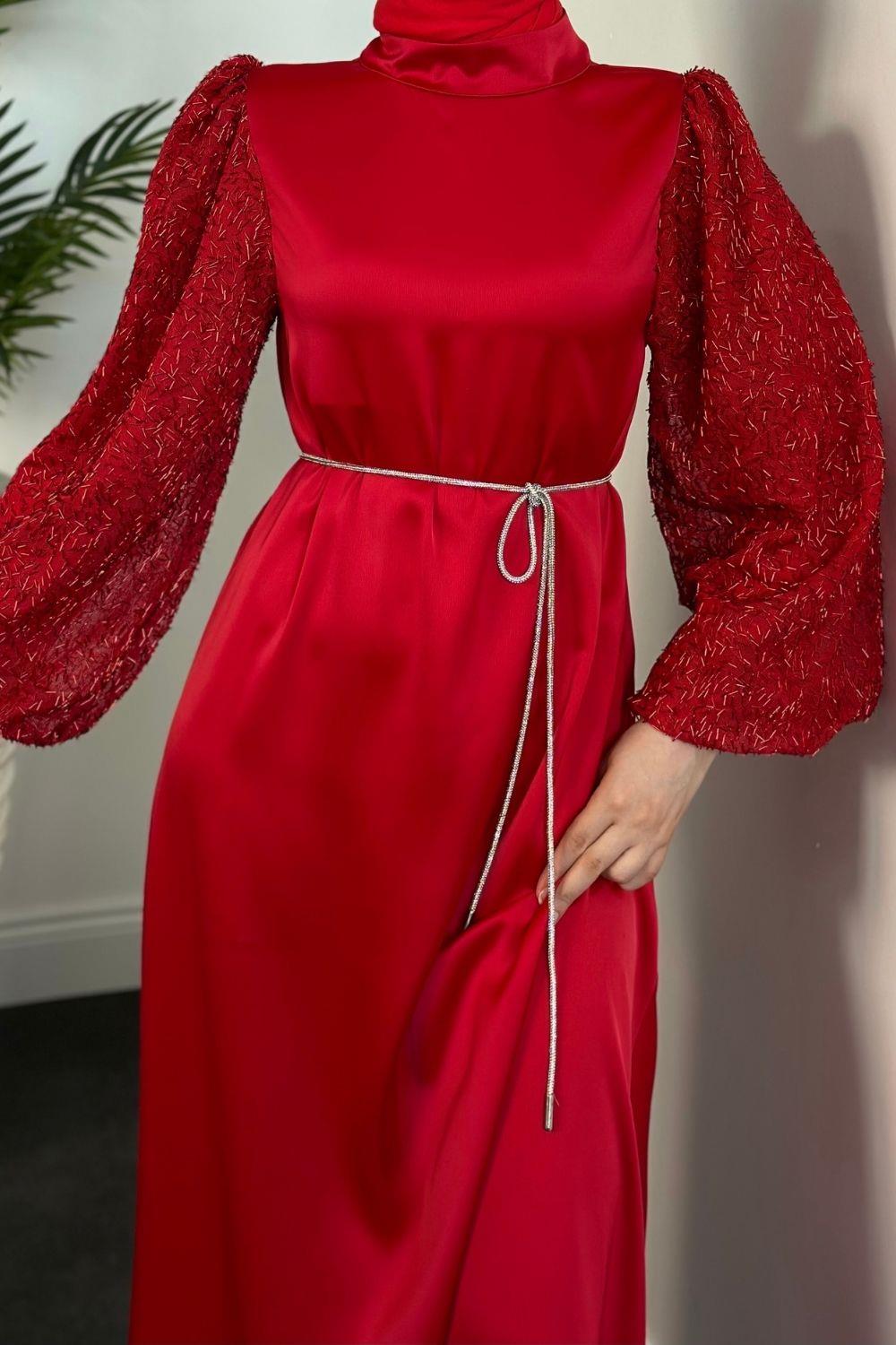 Carlotta Balon Kol Saten Abiye Kırmızı