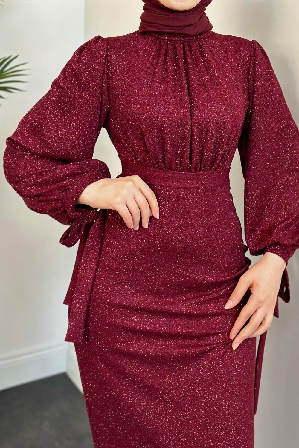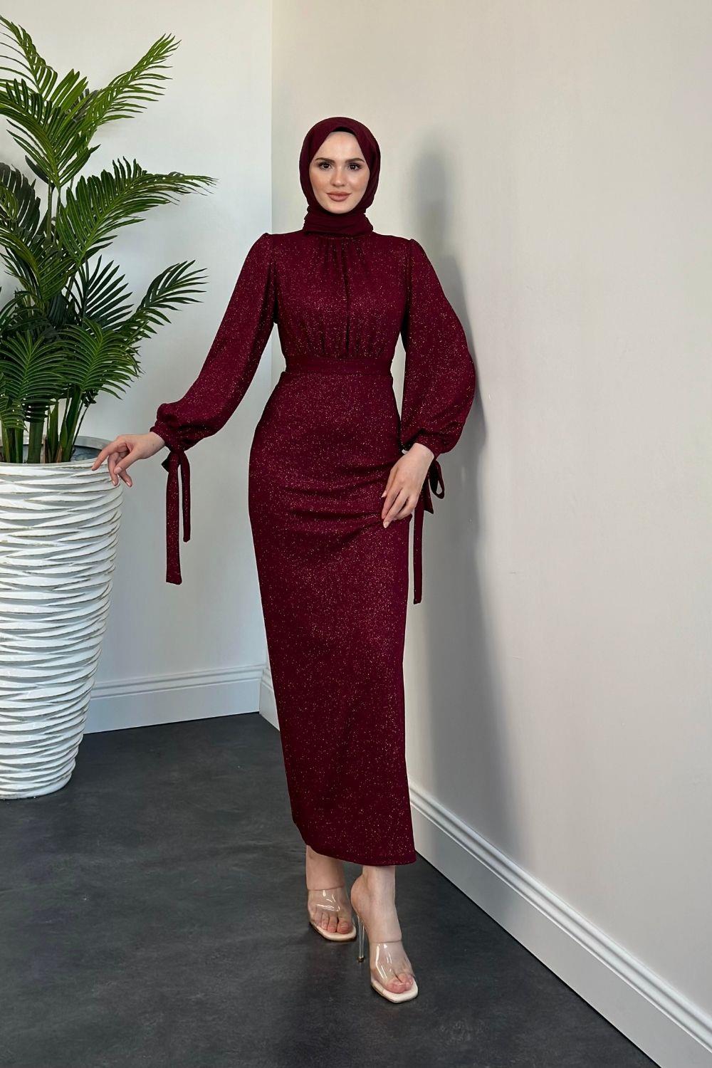 Zeta Kolları Bağcıklı Simli Kalem Abiye Bordo