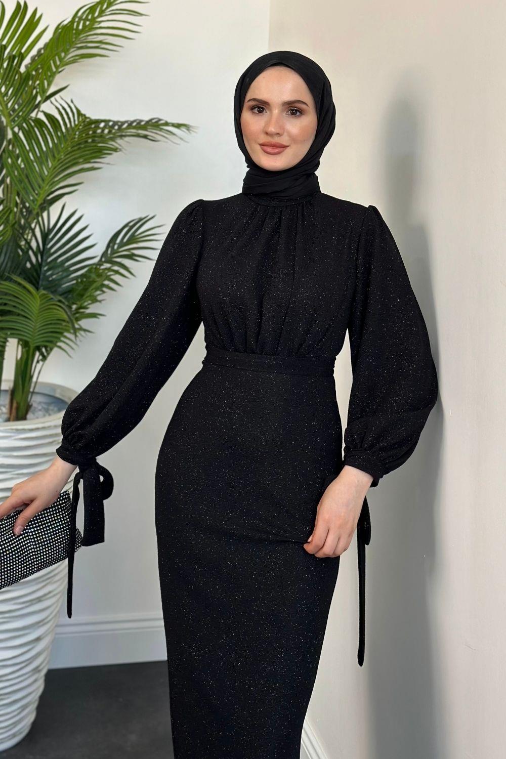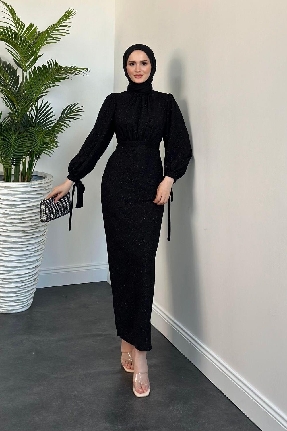 Zeta Kolları Bağcıklı Simli Kalem Abiye Siyah