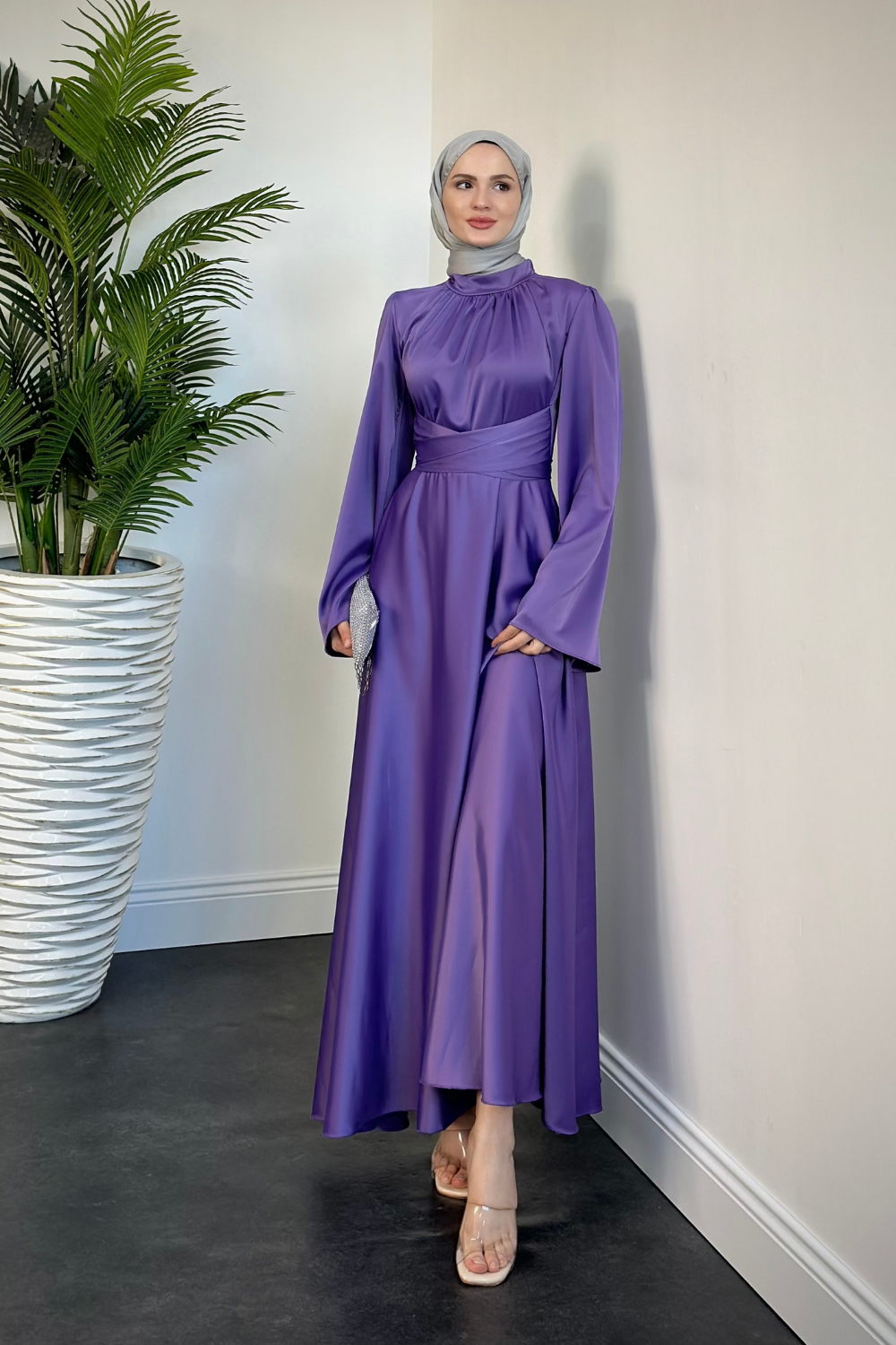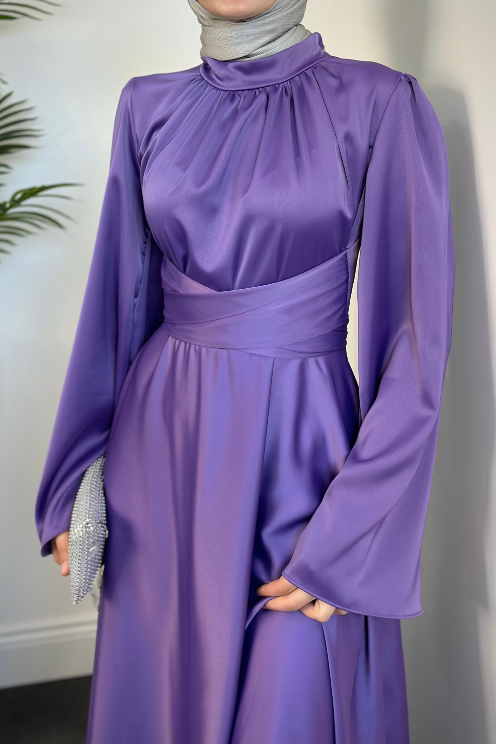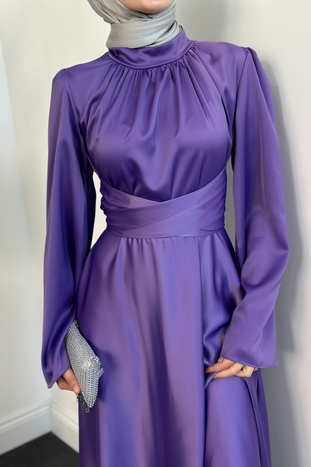 Violet İspanyol Kol Belden Bağlama Saten Elbise Lila