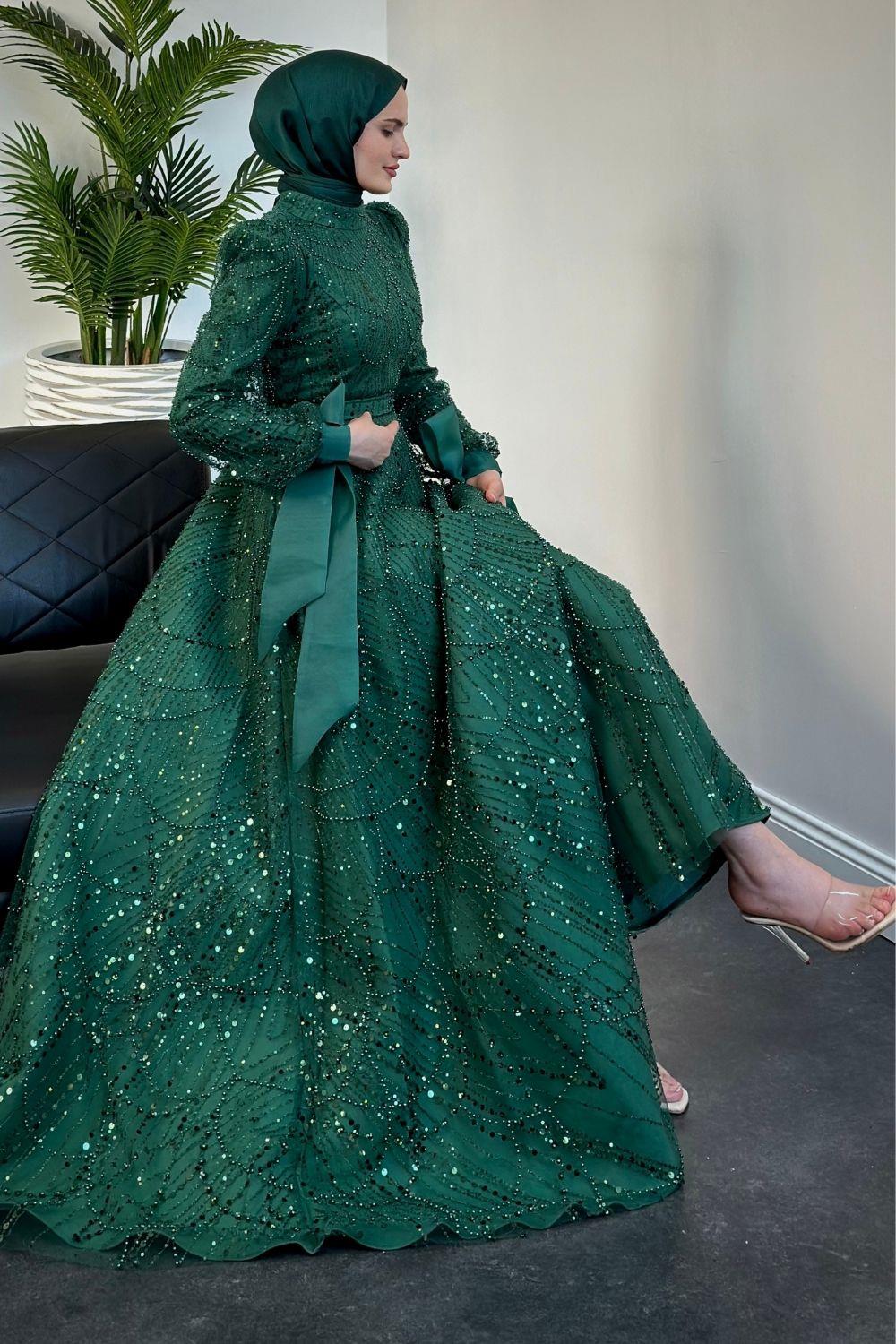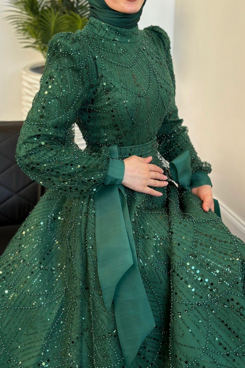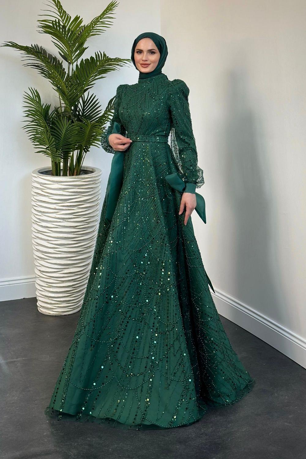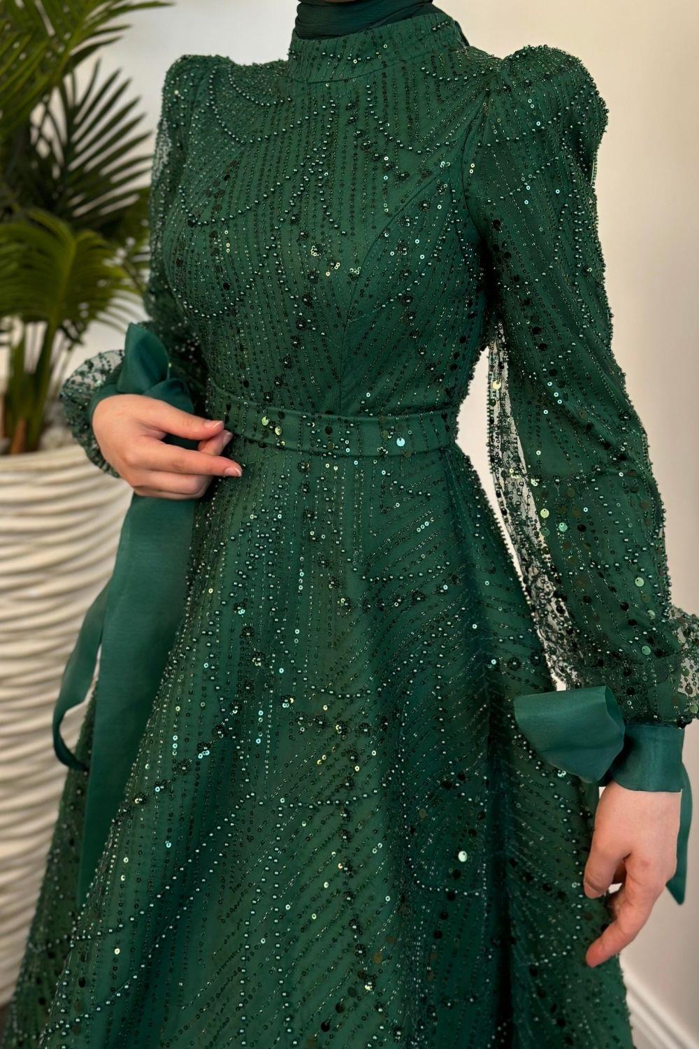 Vittoria Kolu Fiyonk Boncuk İşlemeli Abiye Zümrüt