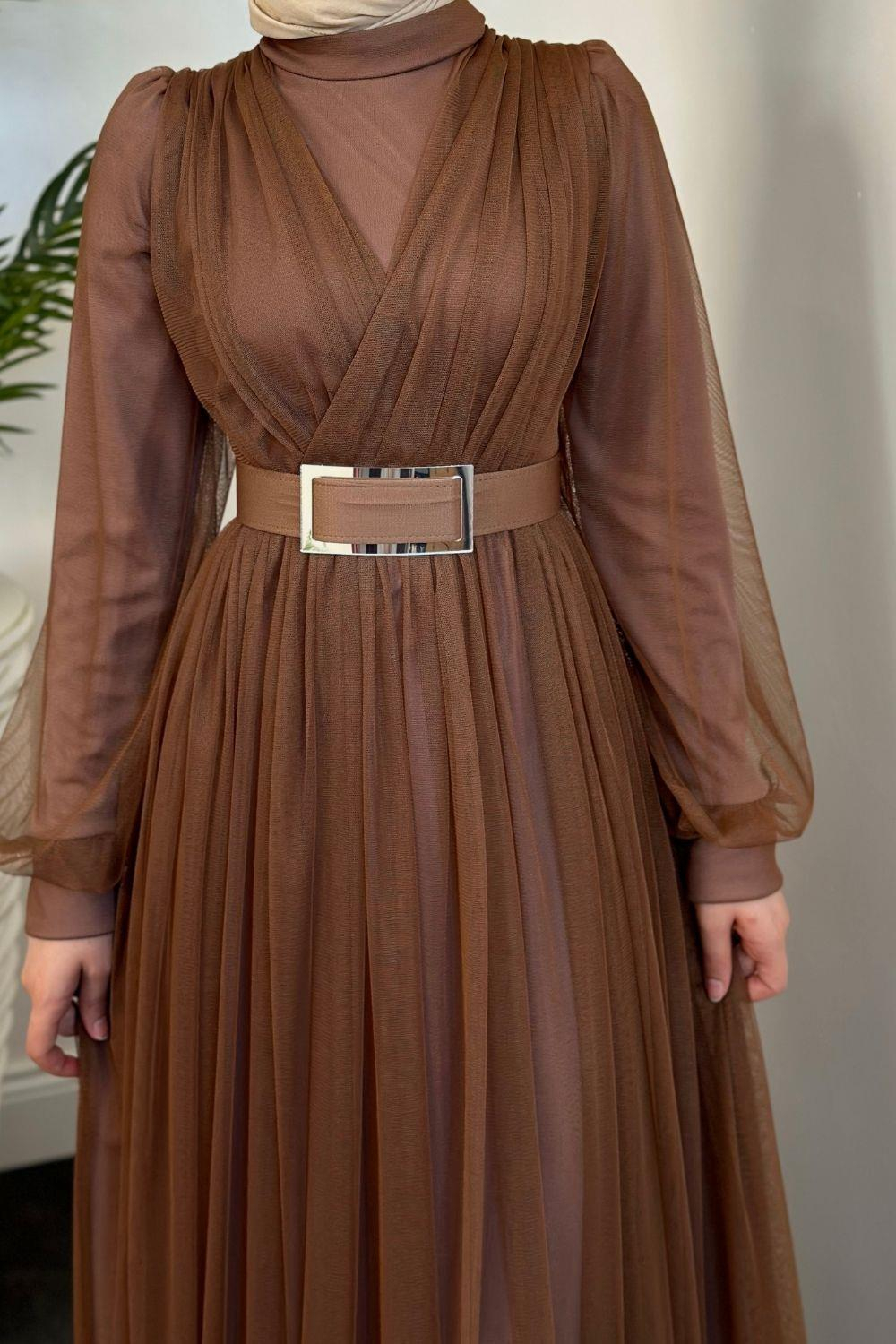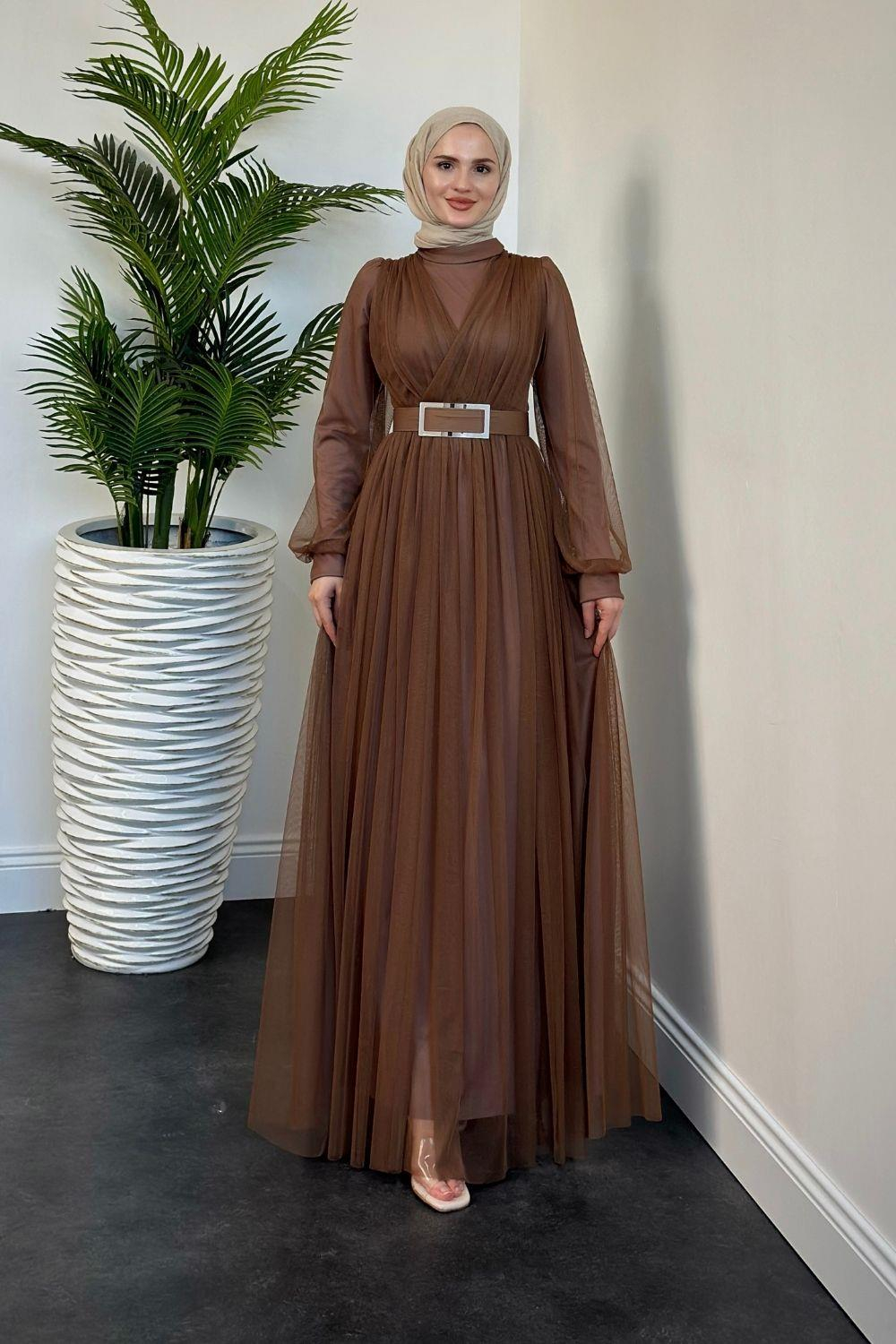 Moreno Tül Kemerli Abiye Kahverengi