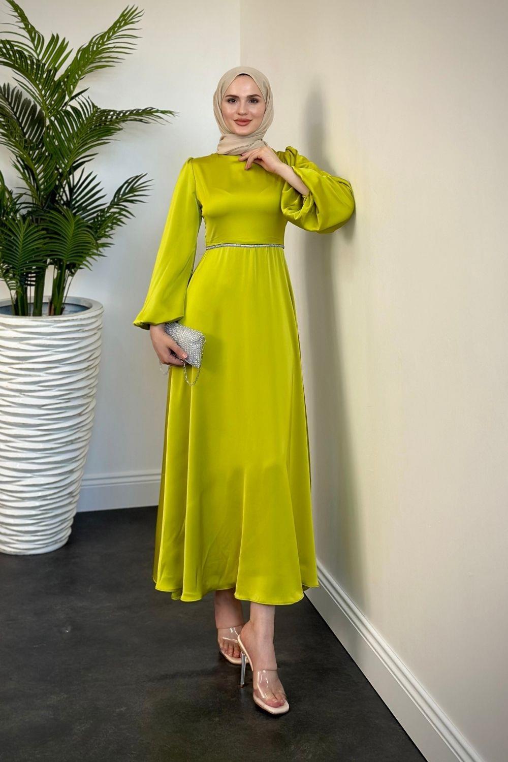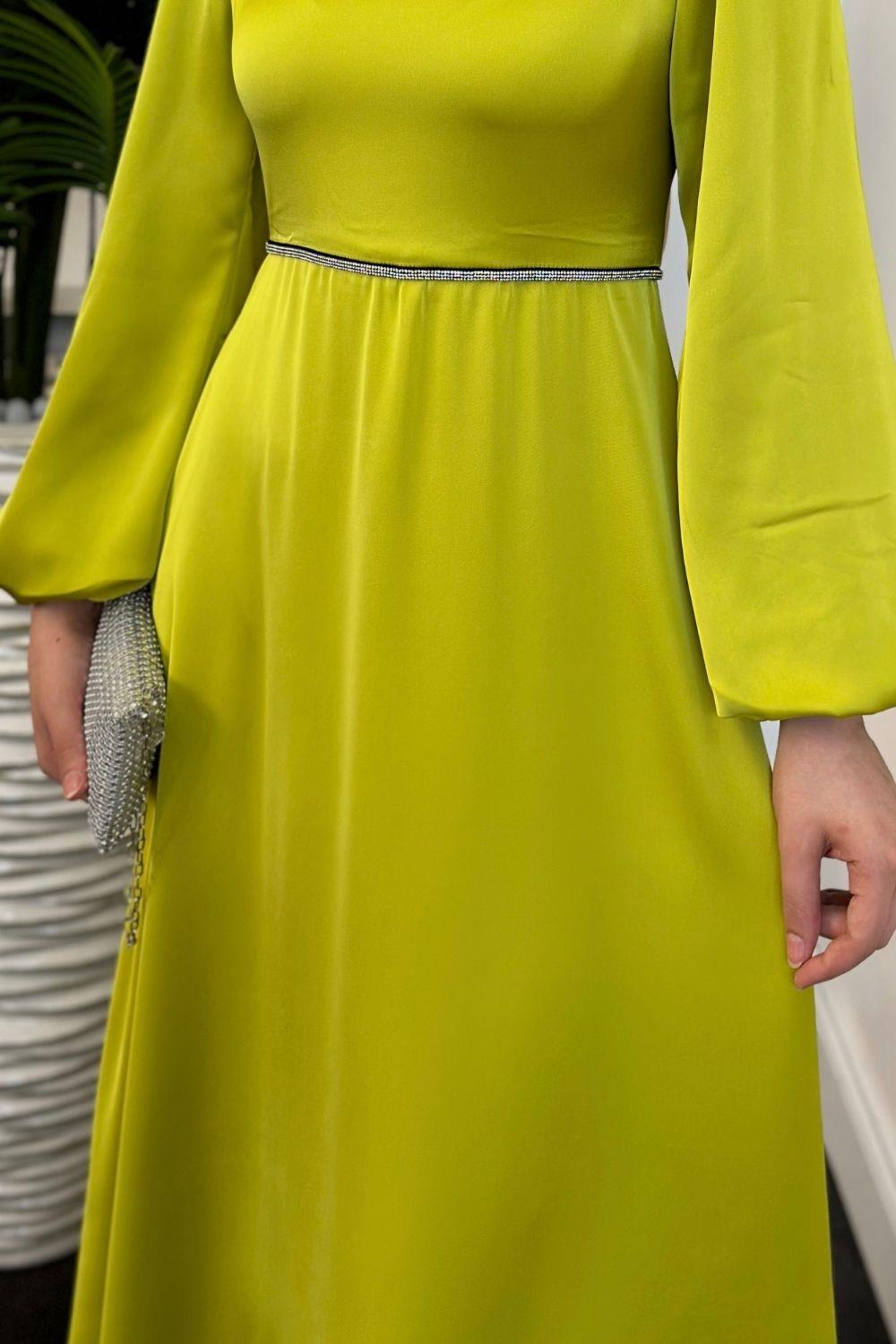 Canna Beli Taş İşlemeli Saten Abiye Yağ Yeşili