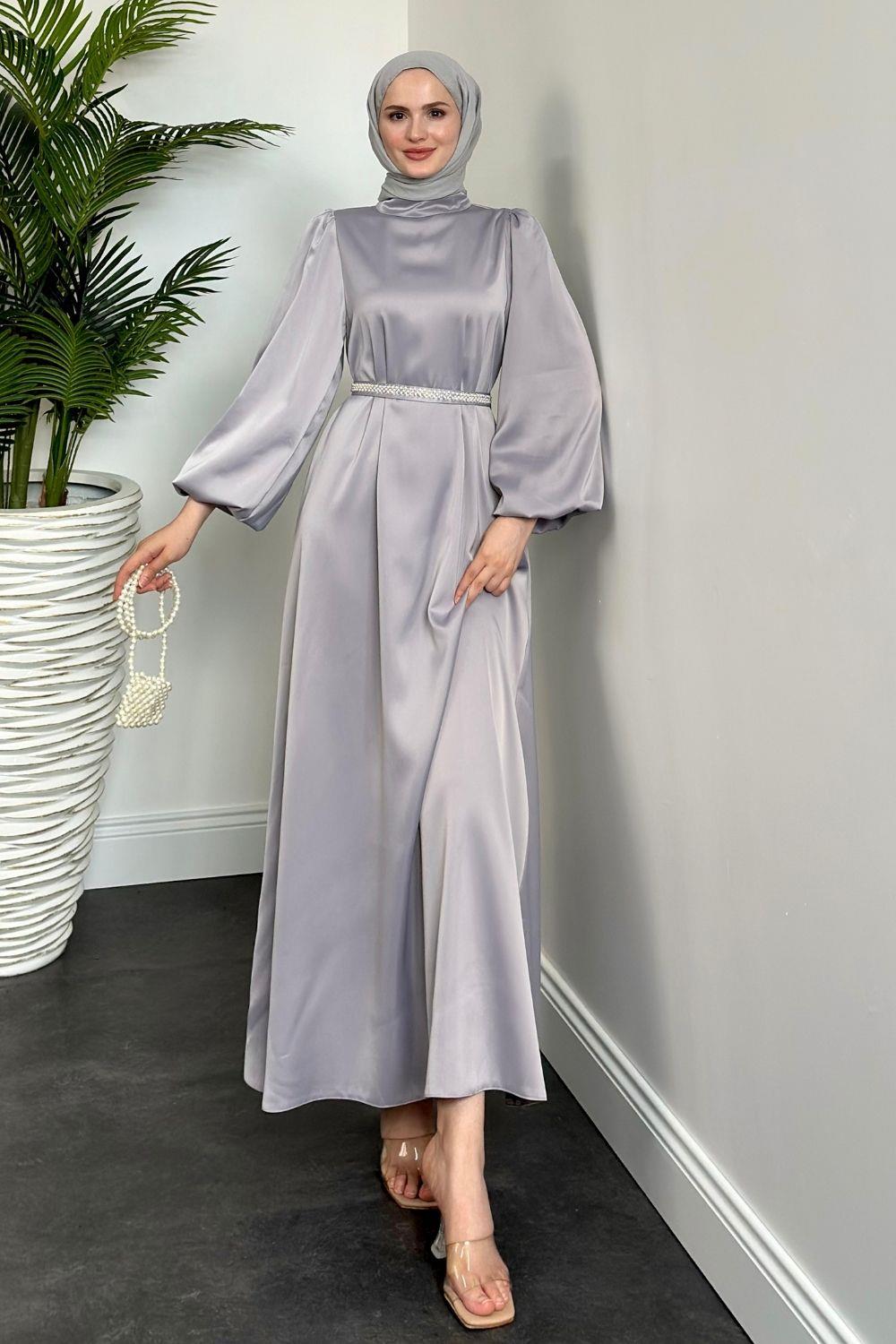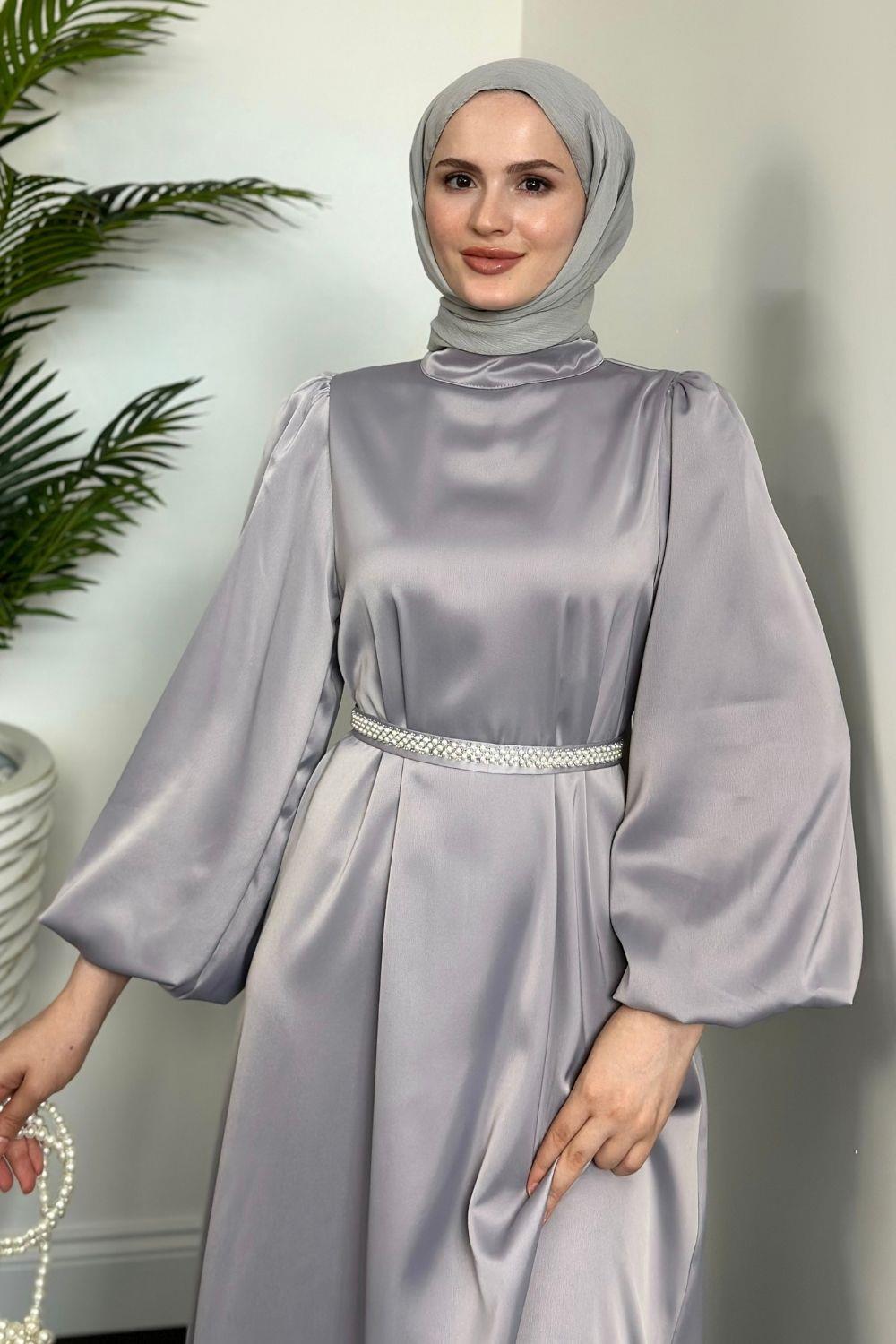 Nika Kemeri İncili Saten Abiye Gri