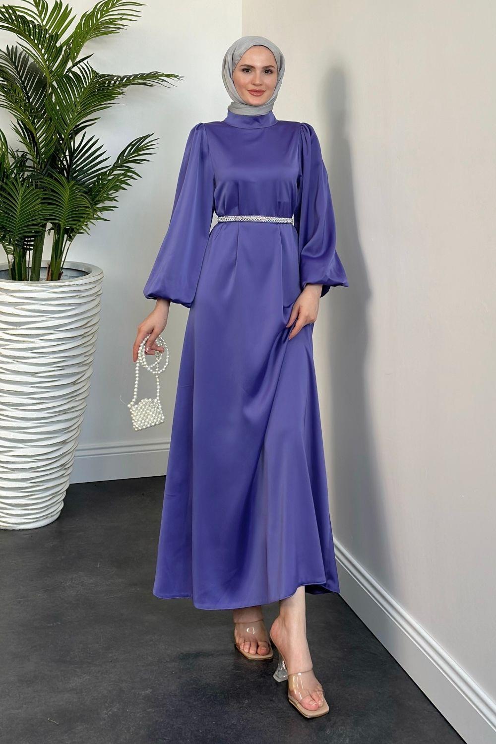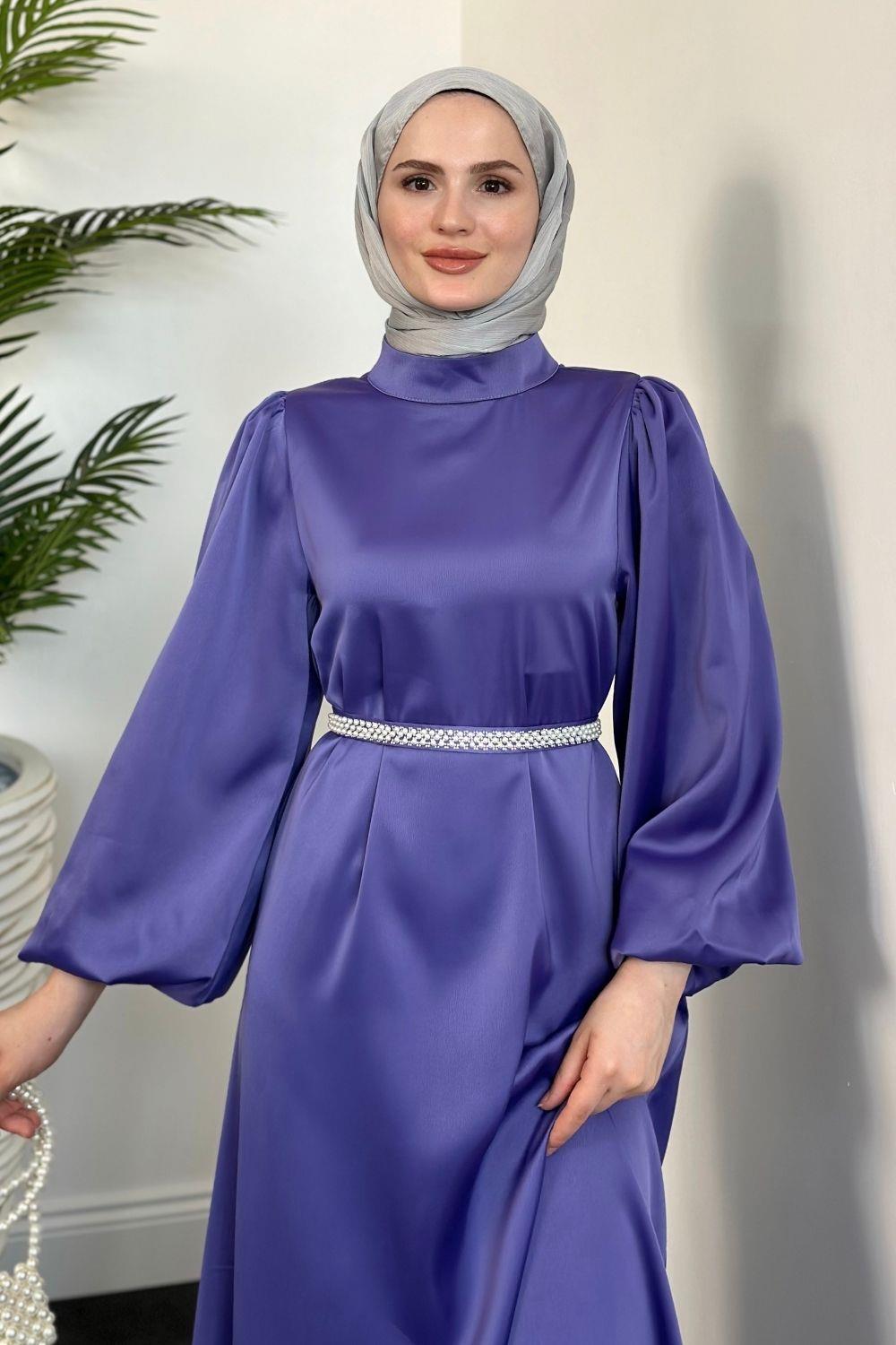 Nika Kemeri İncili Saten Abiye Lila