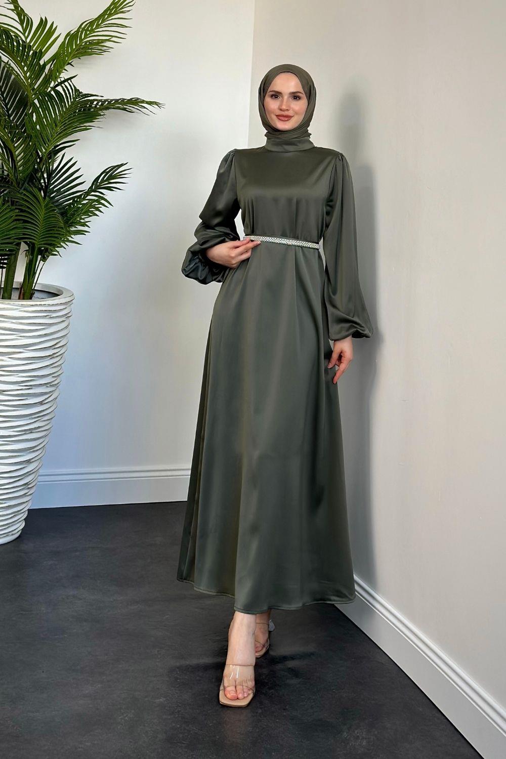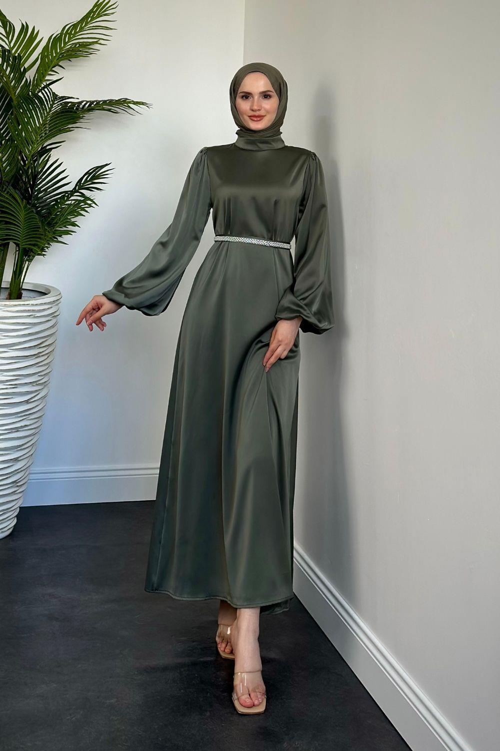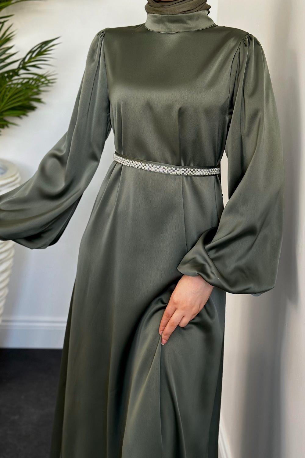 Nika Kemeri İncili Saten Abiye Asker Yeşili