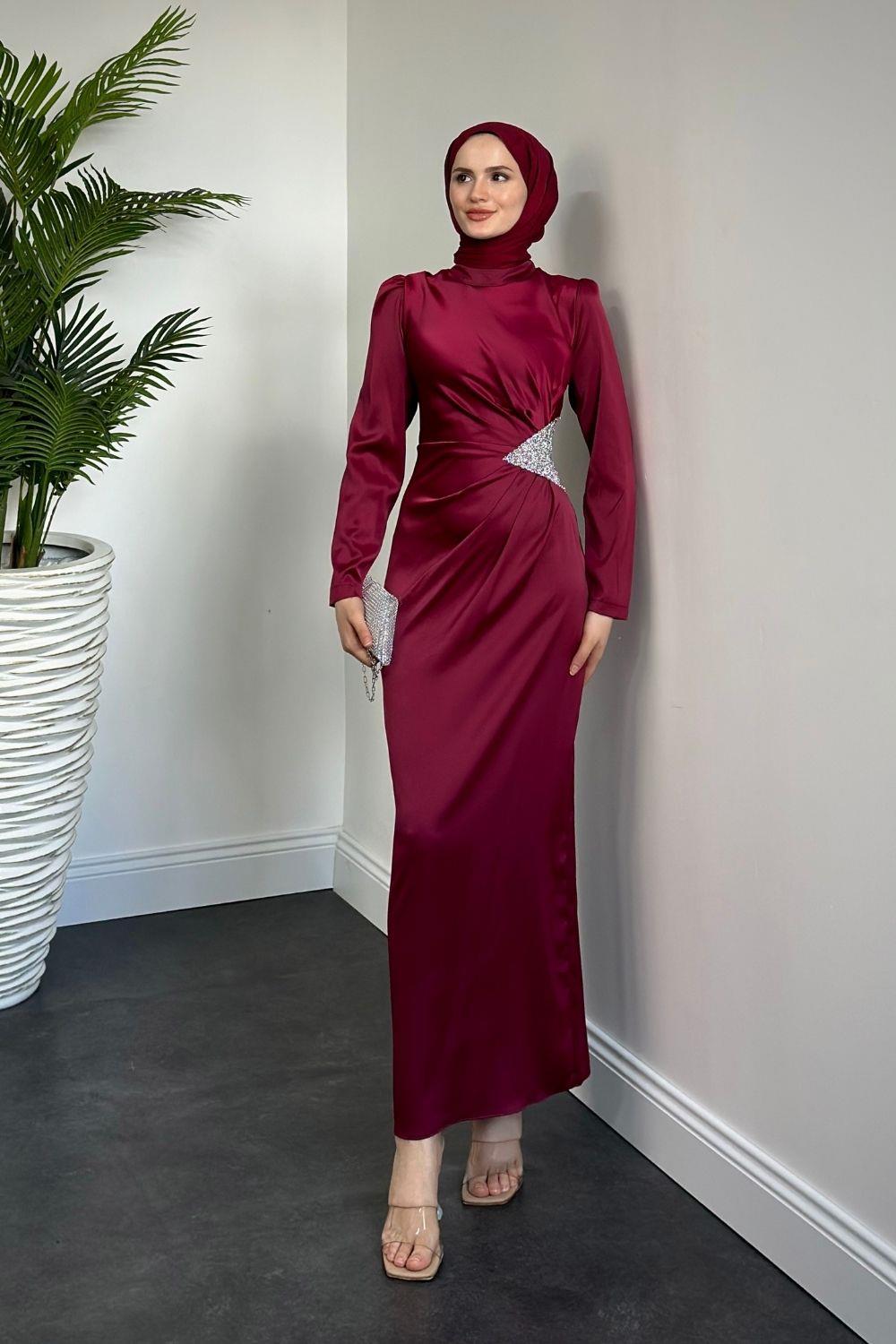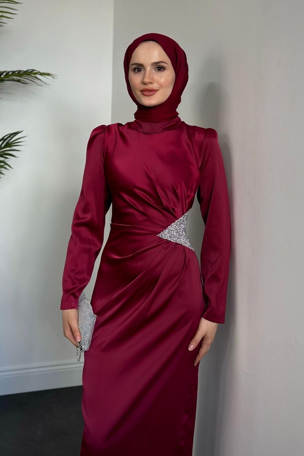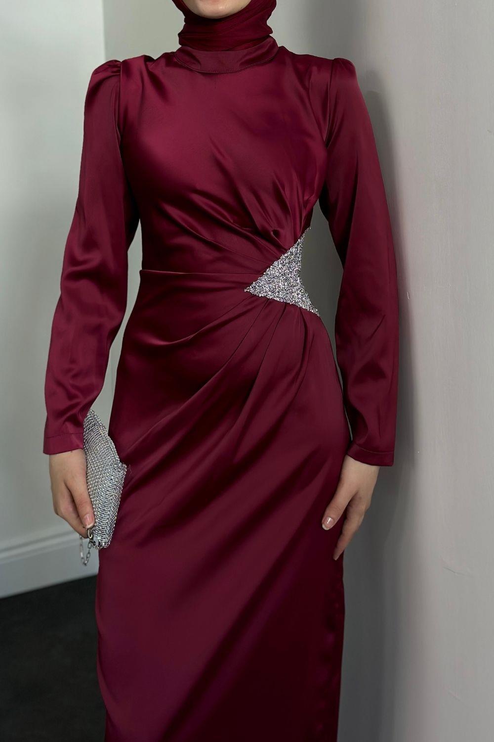Dianora Yanı Üçgen Taşlı Saten Abiye Bordo
