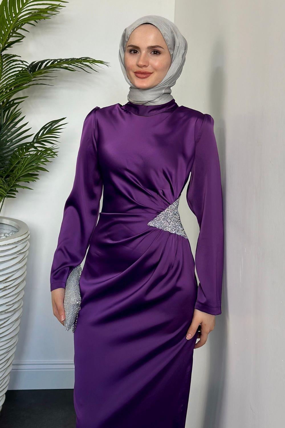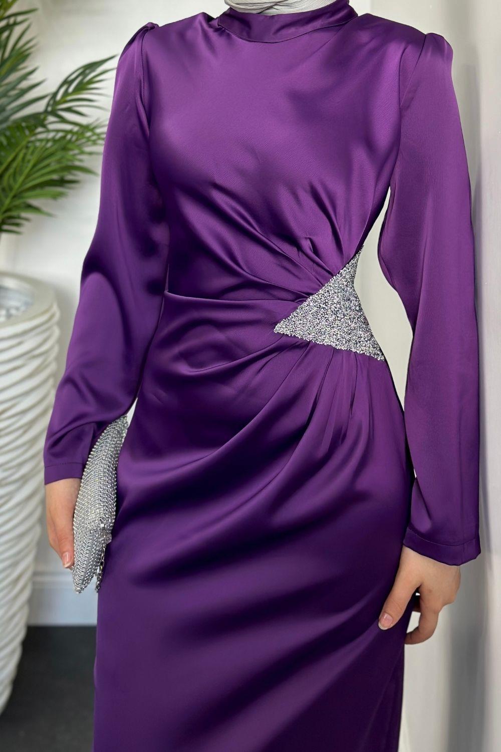 Dianora Yanı Üçgen Taşlı Saten Abiye Mor