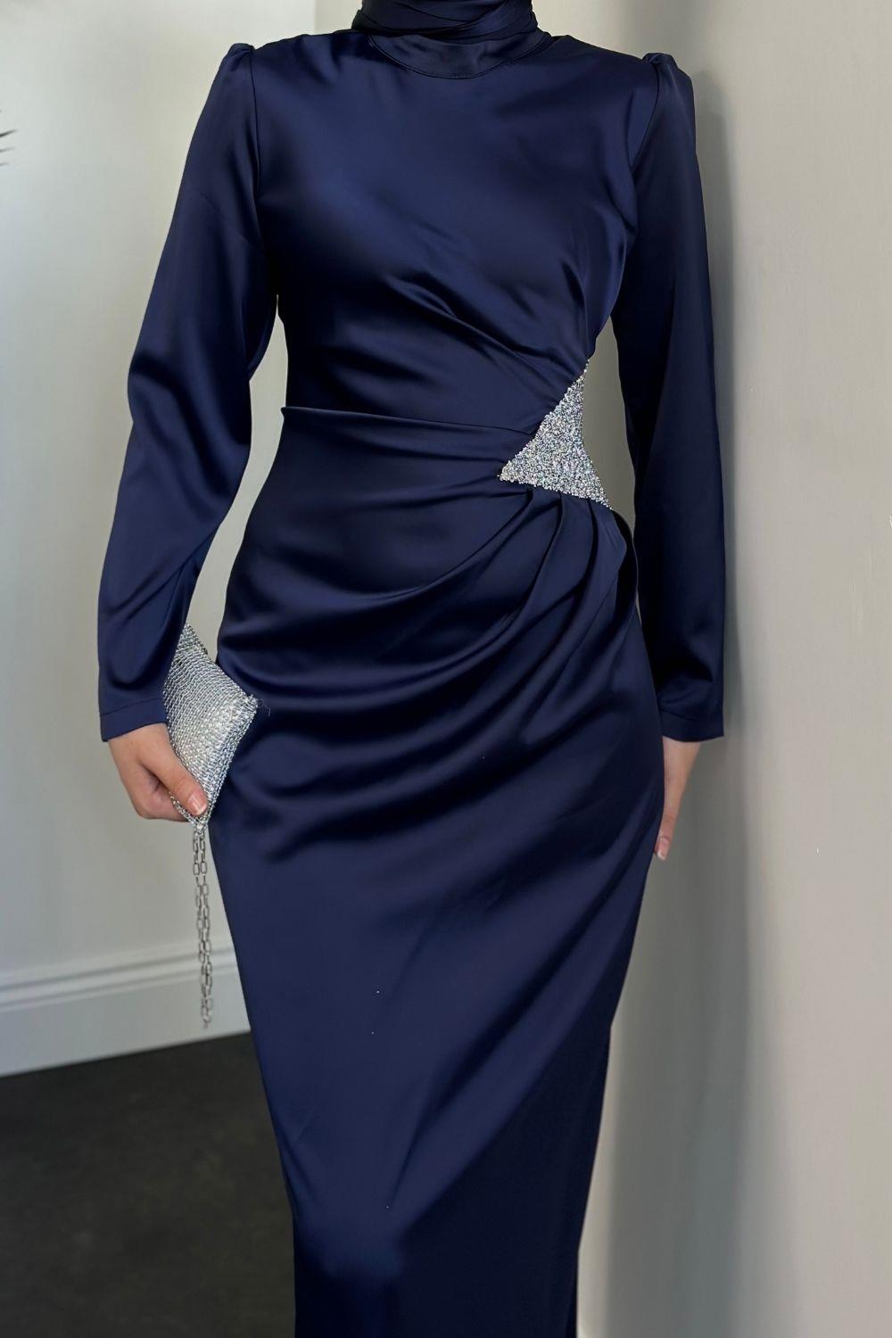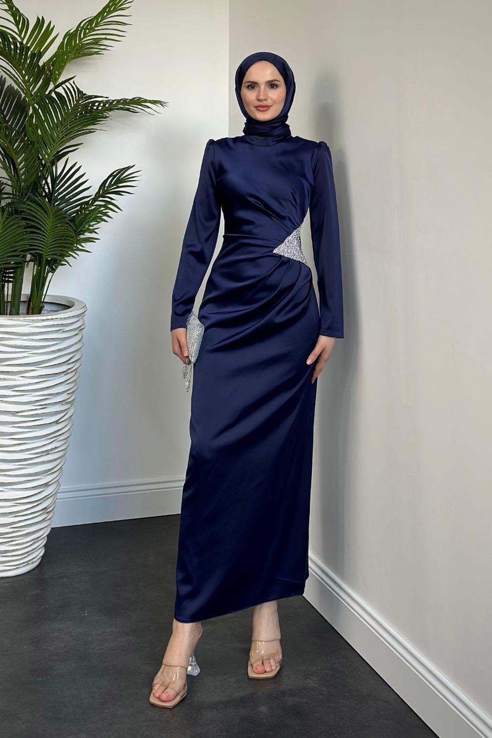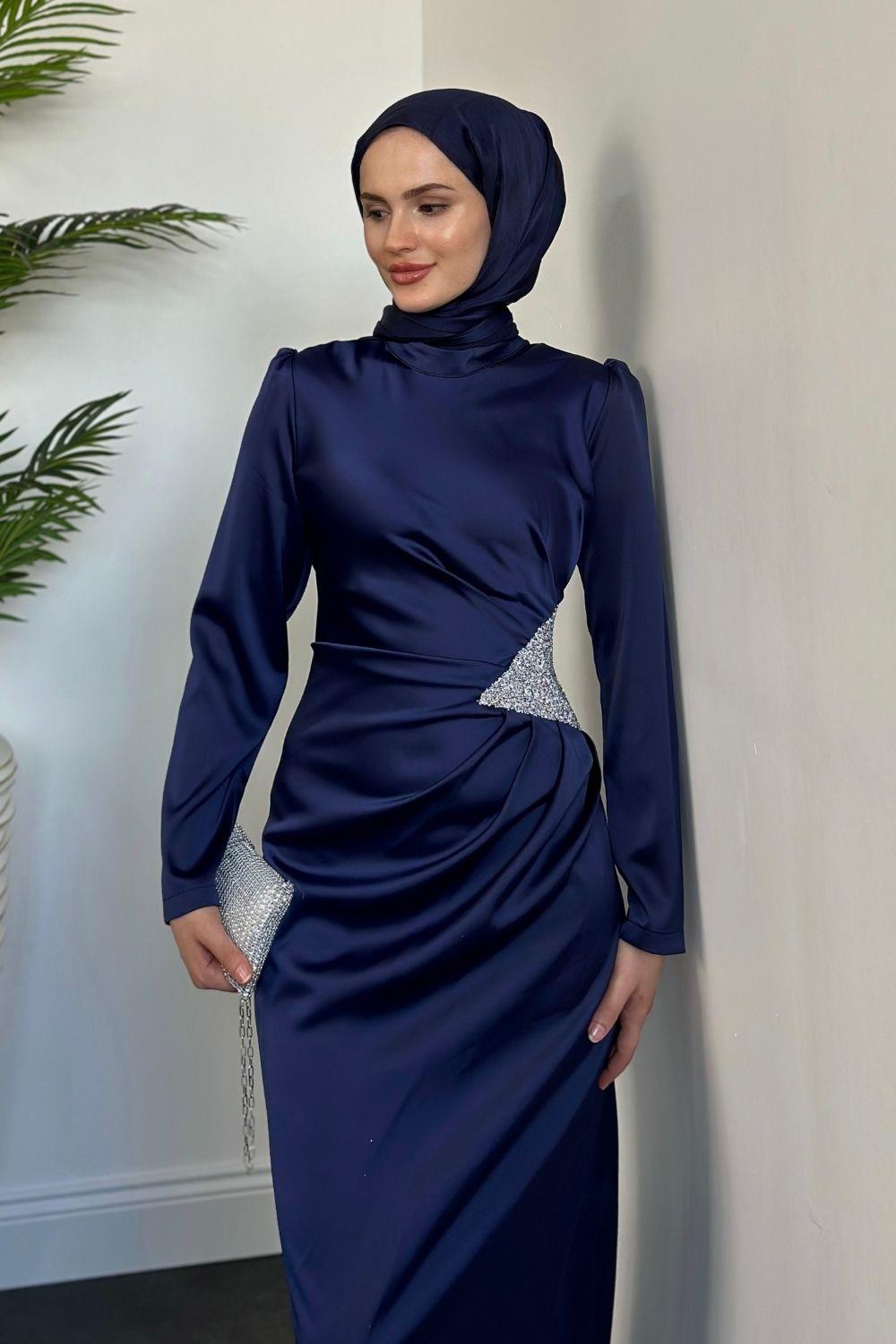 Dianora Yanı Üçgen Taşlı Saten Abiye Lacivert