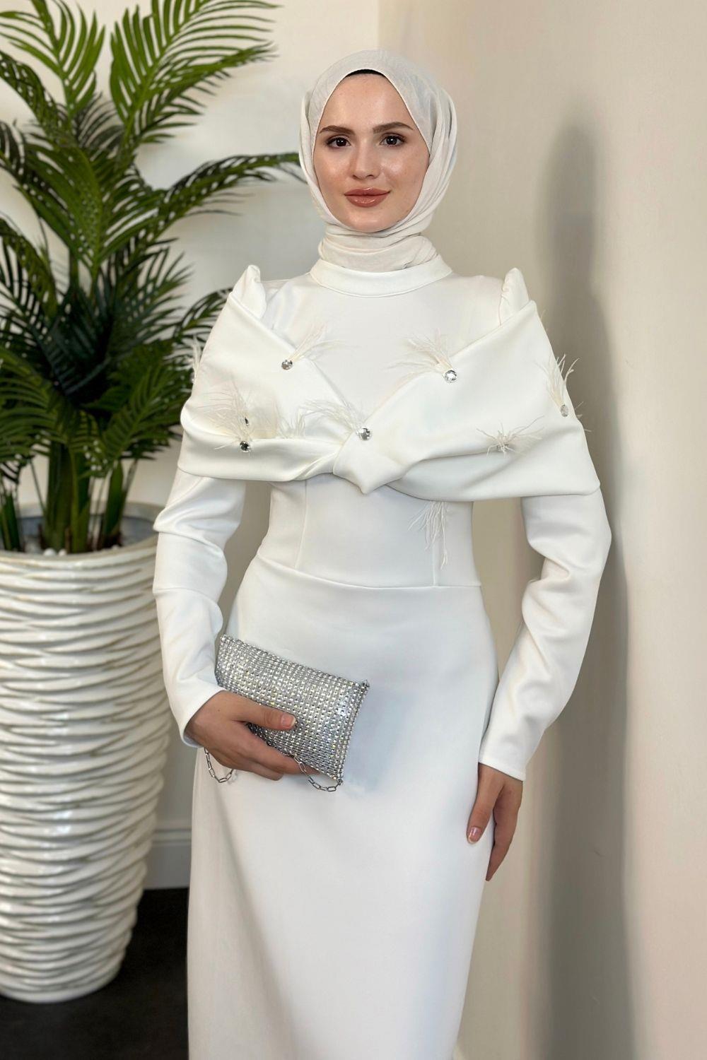Marsil Taşlı Pelerinli Abiye Beyaz