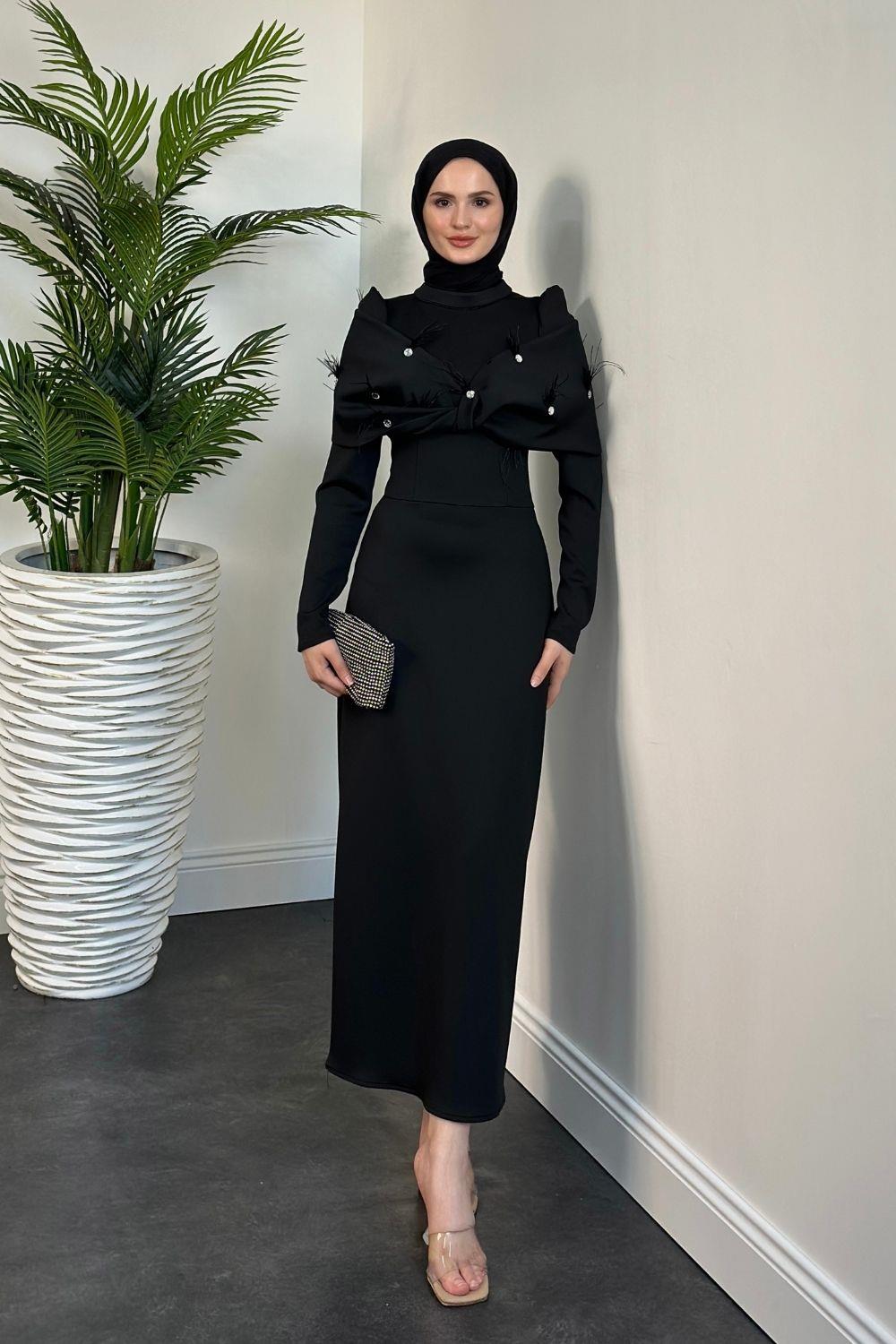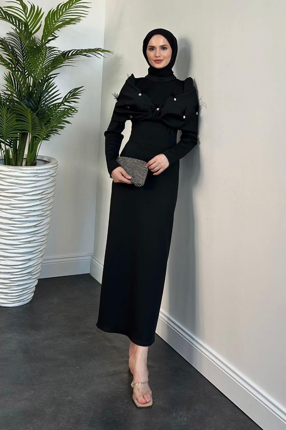 Marsil Taşlı Pelerinli Abiye Siyah