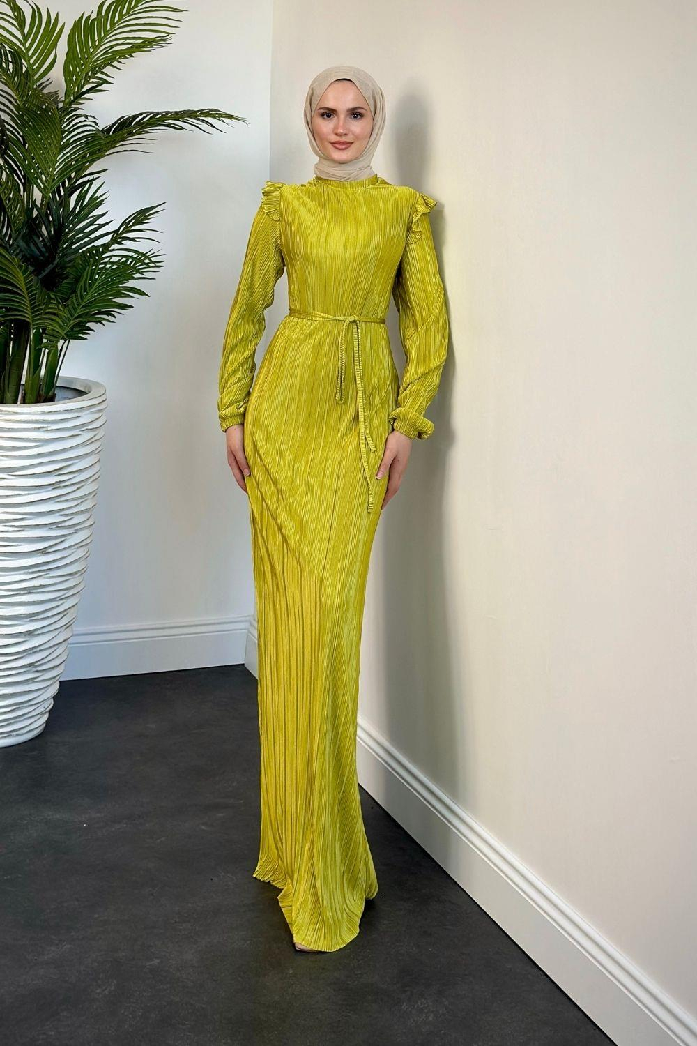 Imelda Omzu Fırfır Balık Abiye Yağ Yeşili