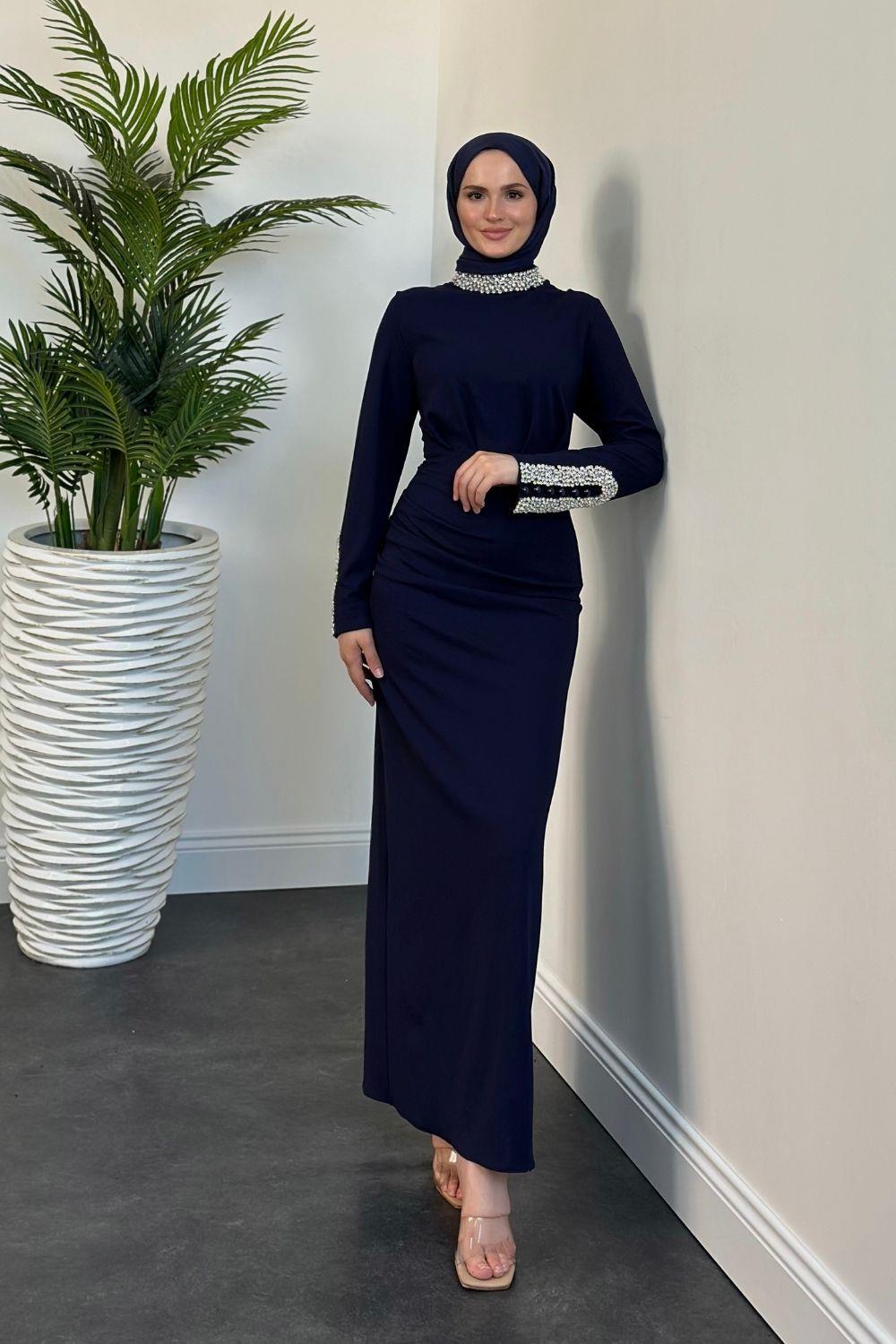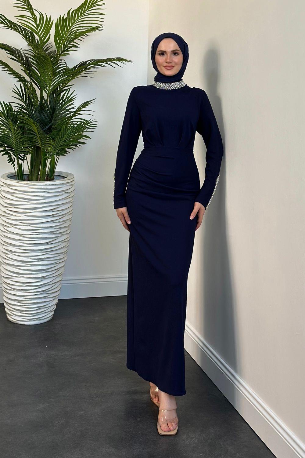 Belary Kolu Ve Boynu Taşlı Abiye Lacivert