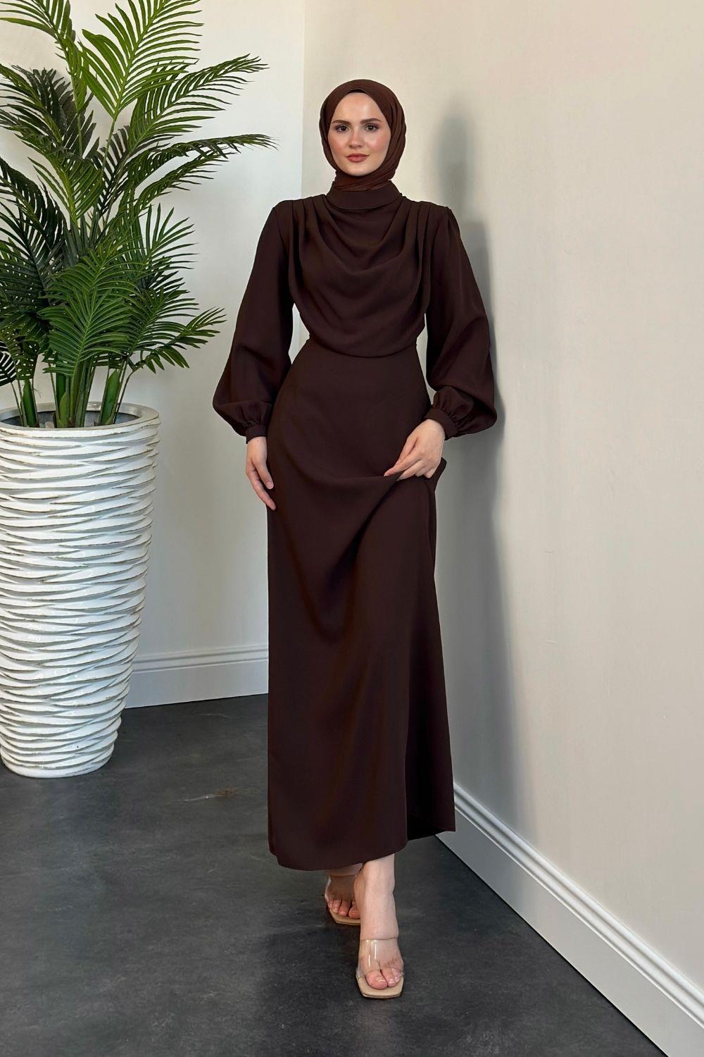Annalisa Drape Krep Abiye Koyu Kahverengi