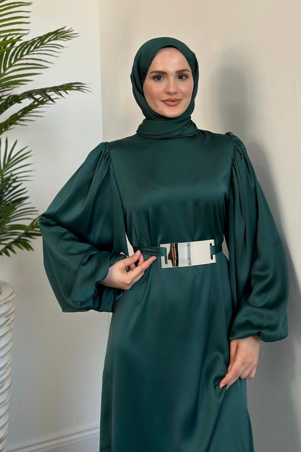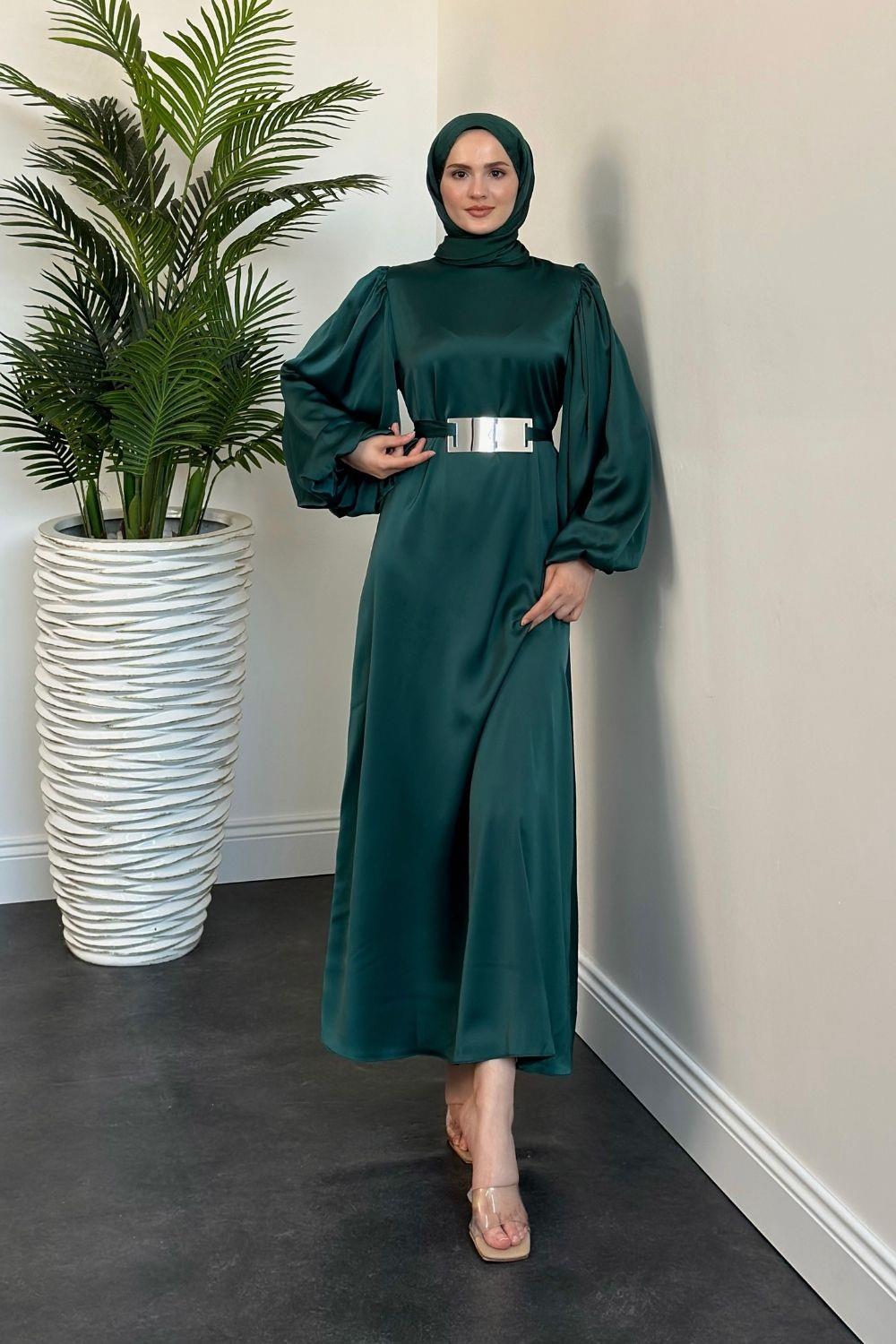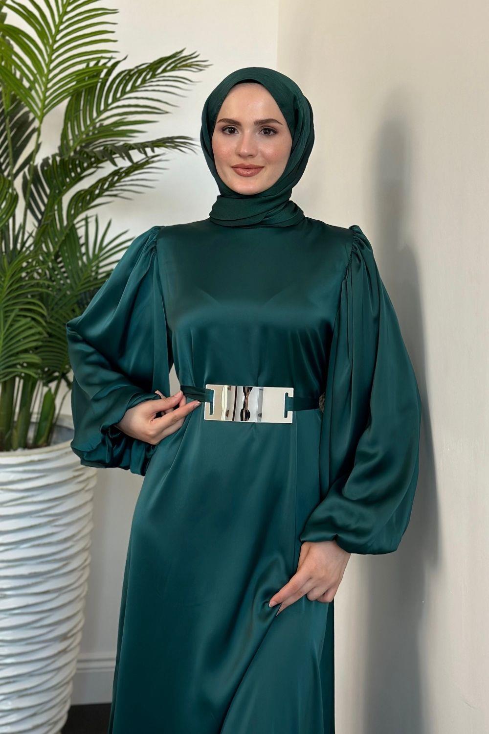 Ladia Ayna Kemerli Balon Kol Saten Abiye Zümrüt