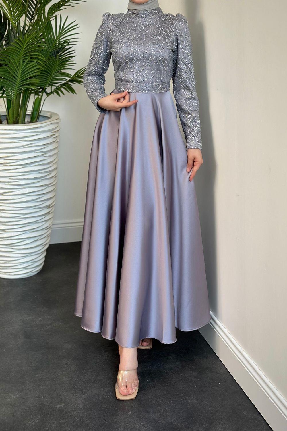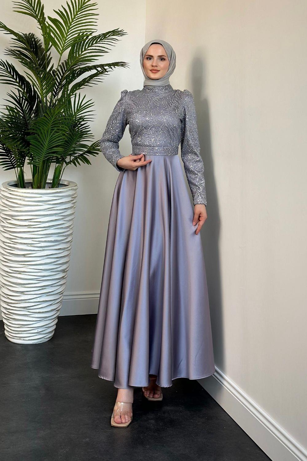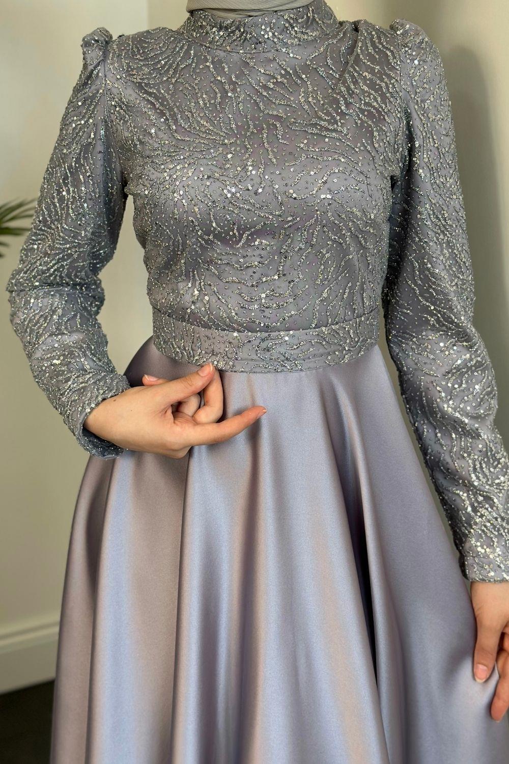 Marble Alt Kısmı Saten Abiye Gri