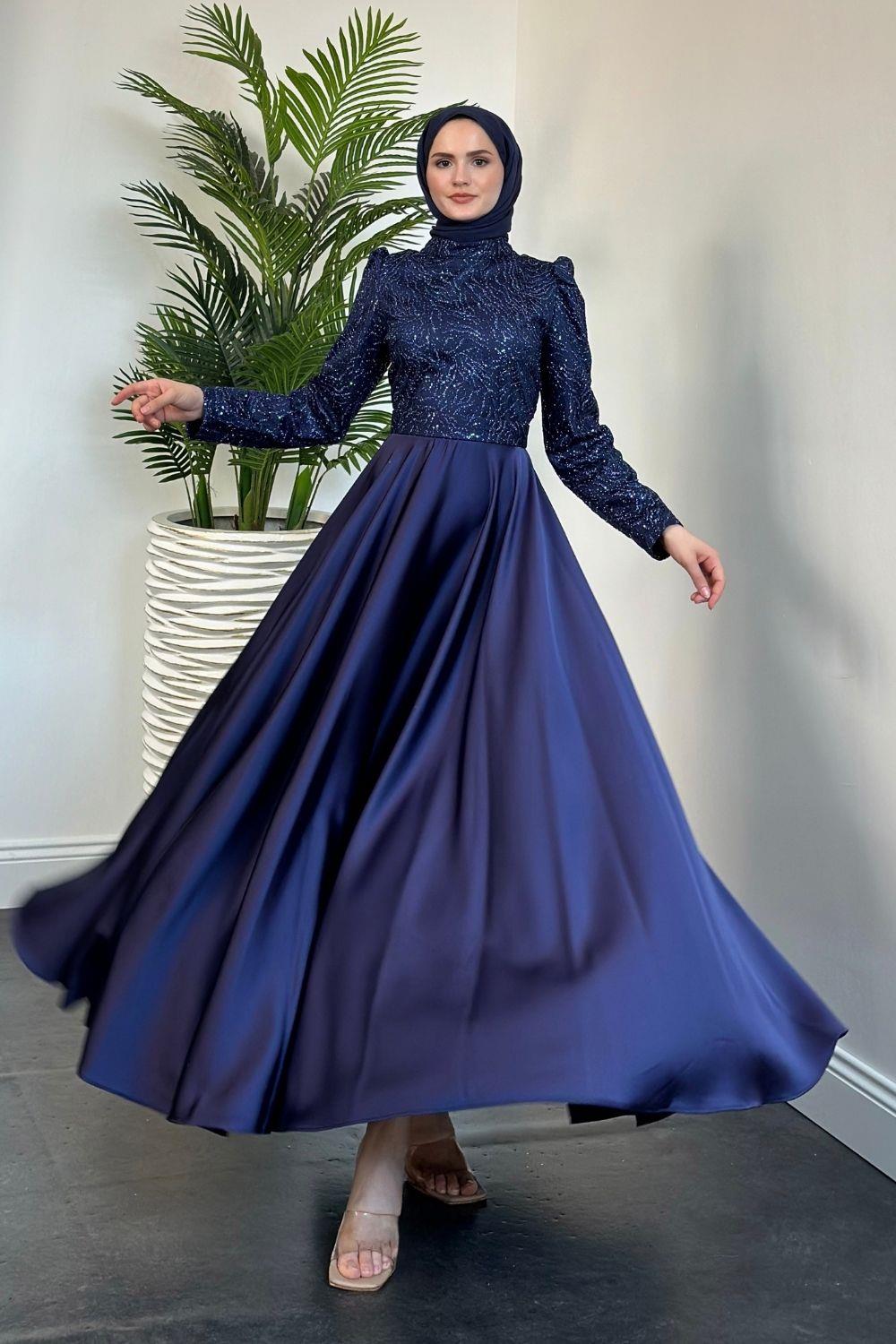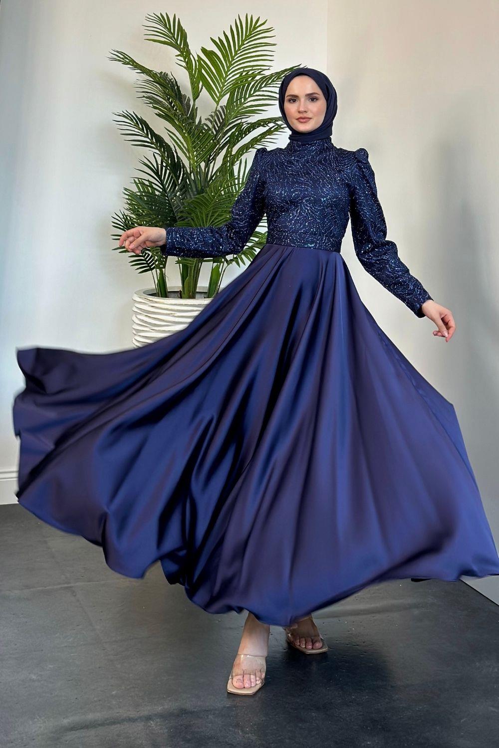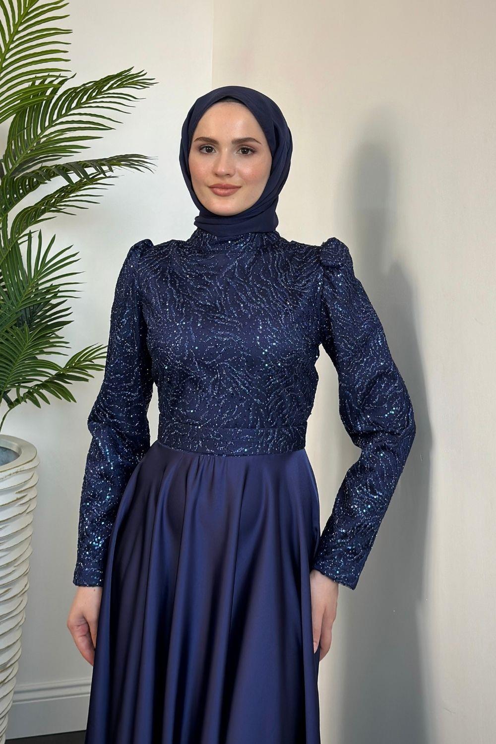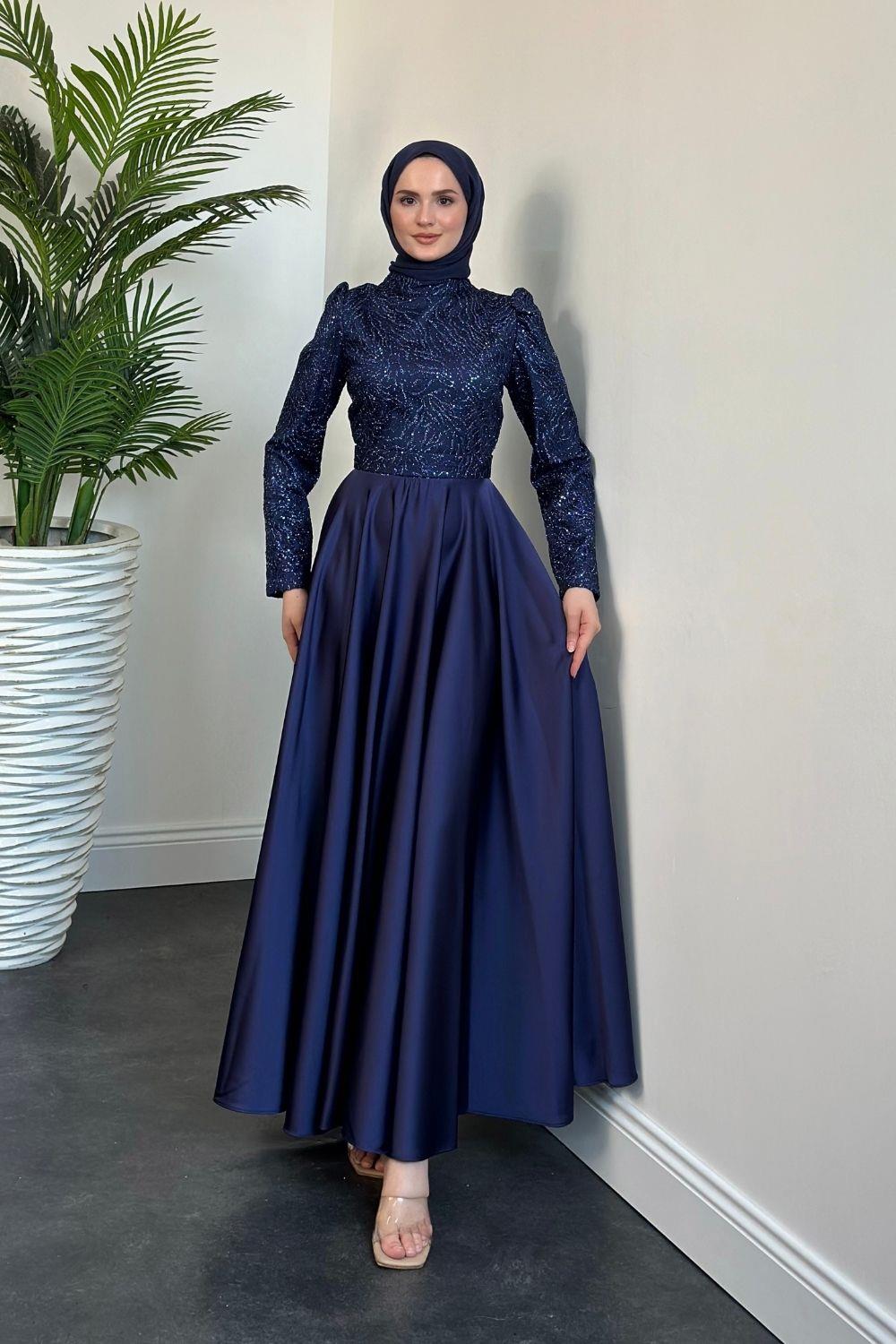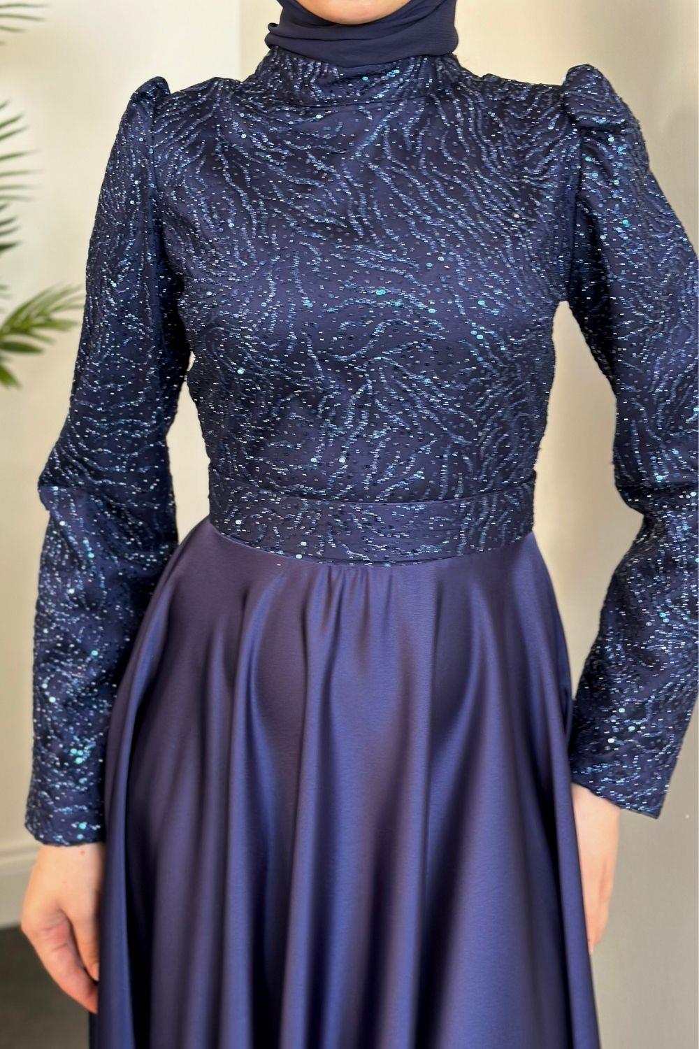 Marble Alt Kısmı Saten Abiye Lacivert