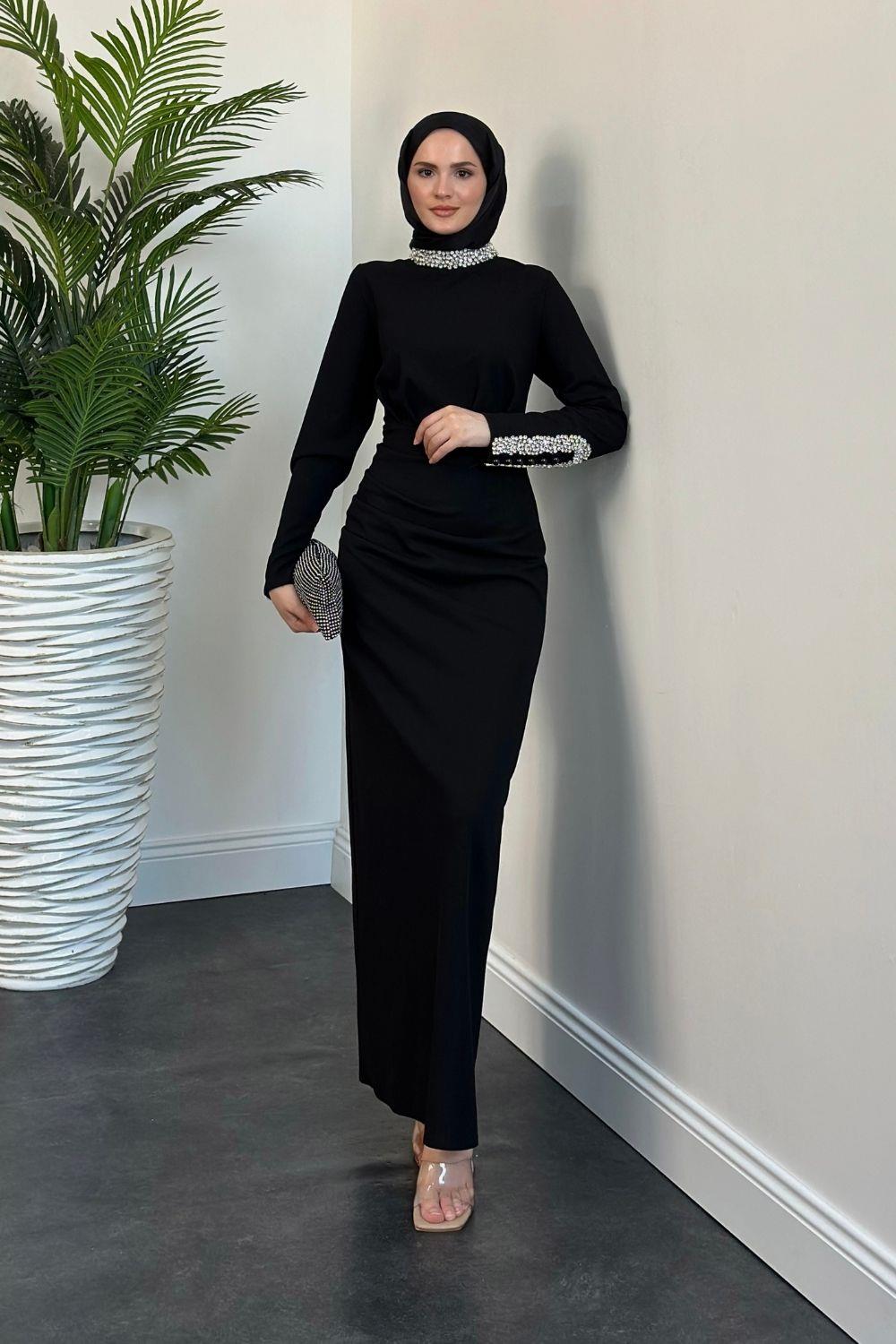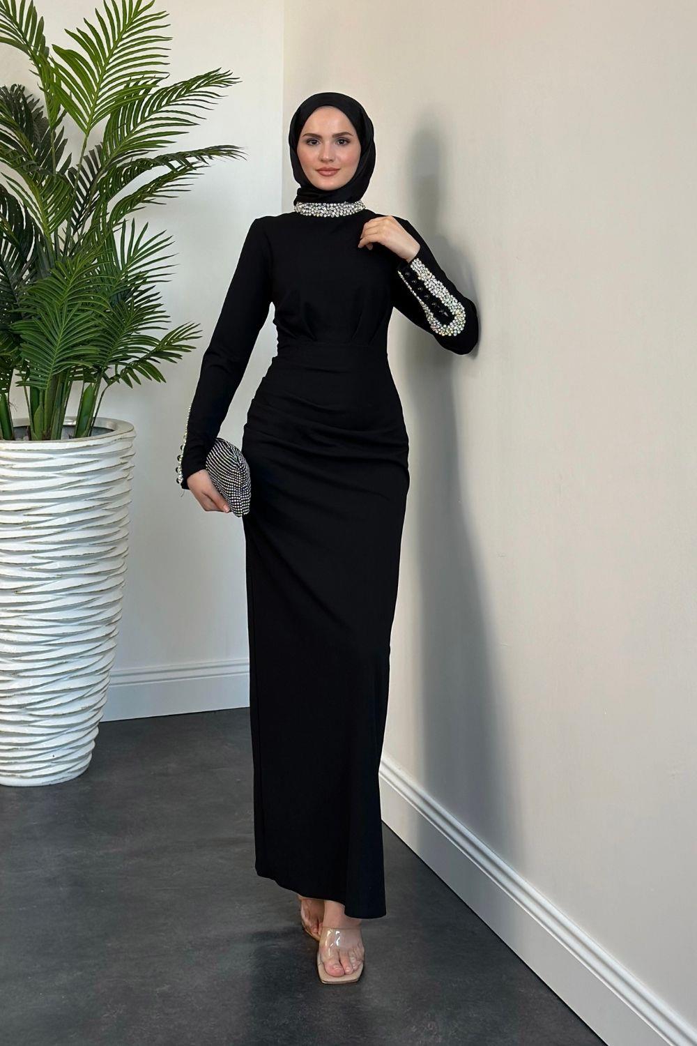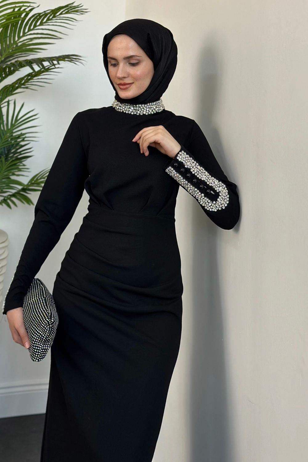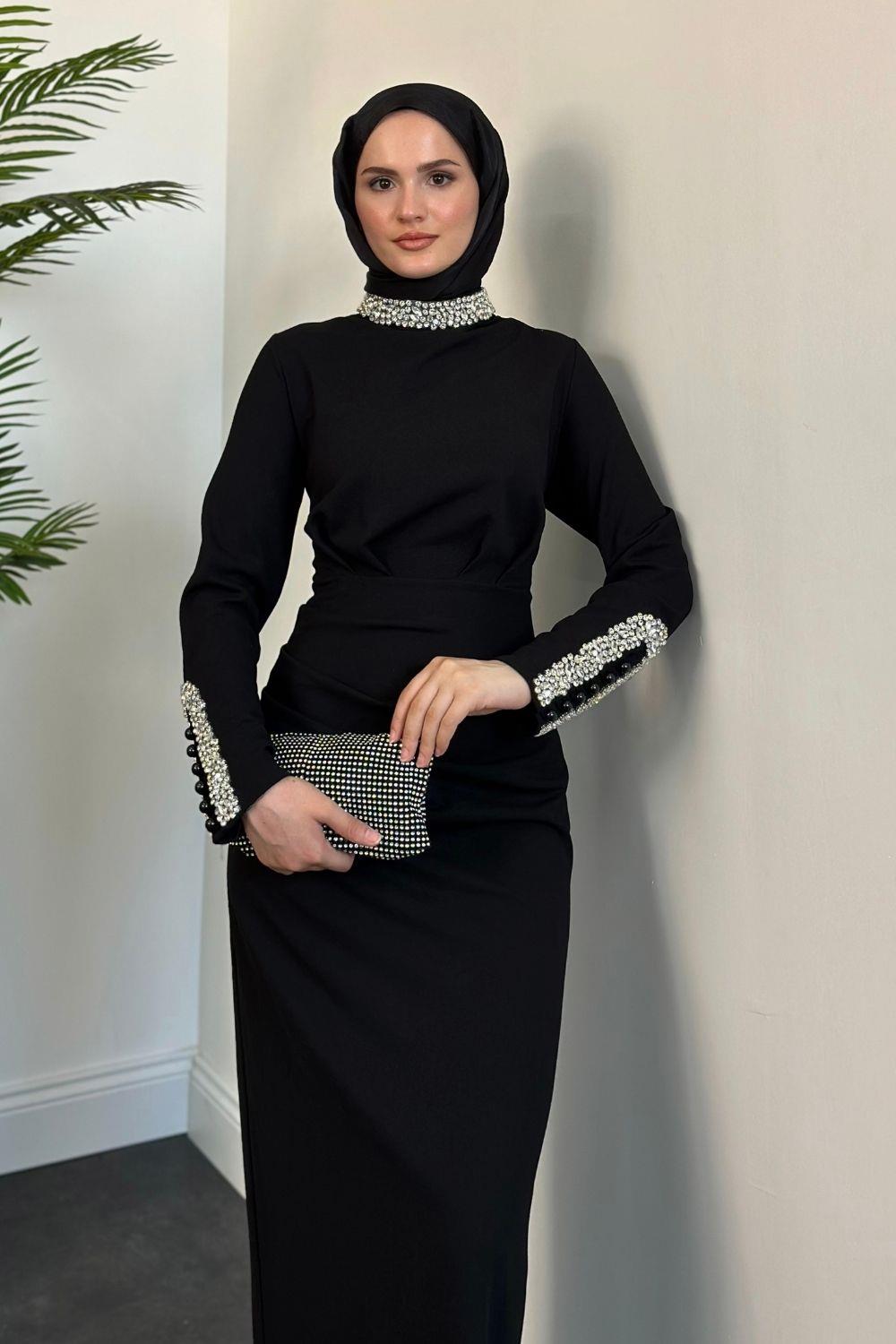 Belary Kolu Ve Boynu Taşlı Abiye Siyah